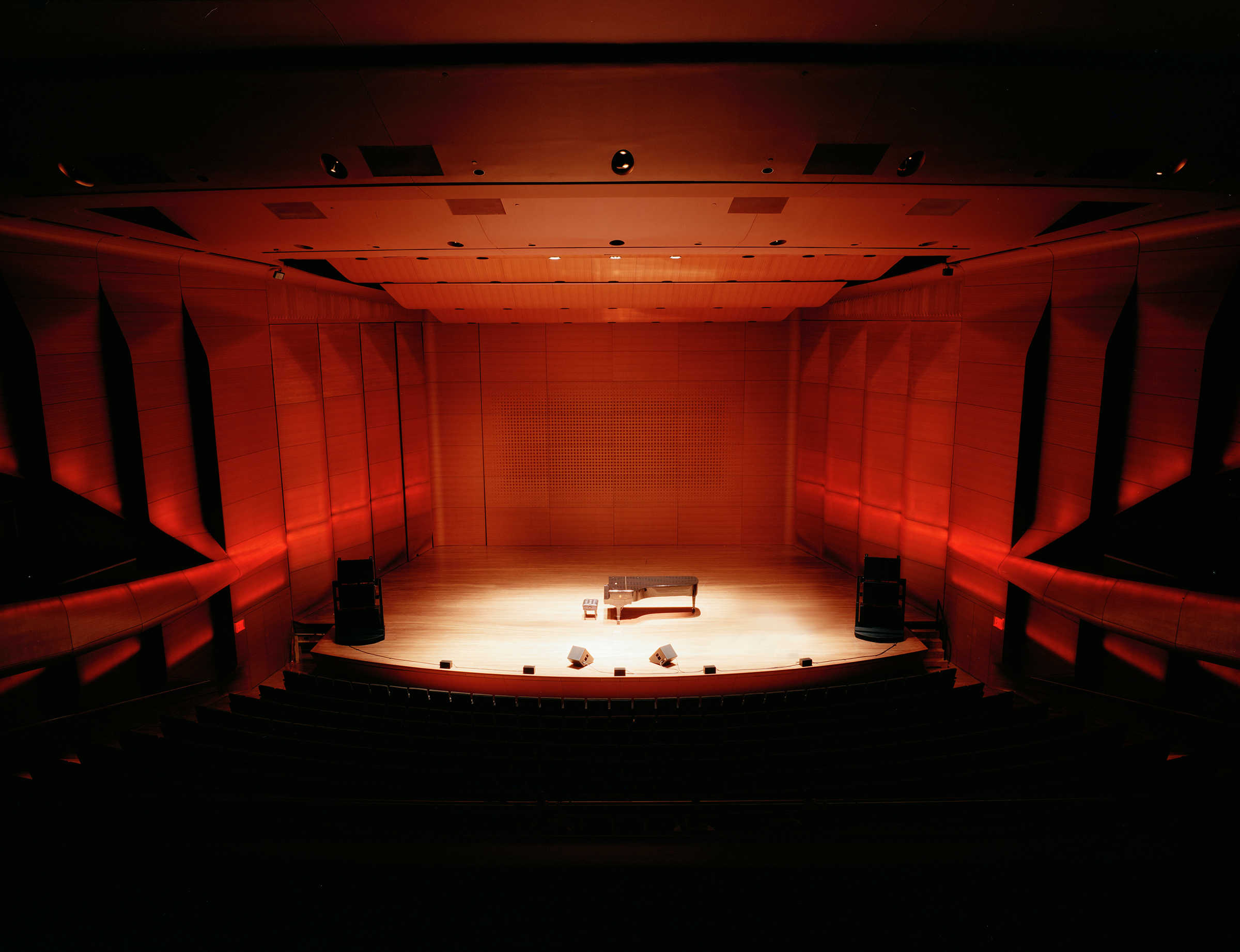 L'Observatoire International provided the lighting design for the concert hall, the school and surrounding public spaces. The lighting concept unifies and brings a nocturnal identity to the many public spaces, thereby accentuating the vitality of the institution’s nightlife. In the concert hall, the lighting is hidden behind the walls' resin panels, making the walls themselves emit light. In lieu of the parting of the stage curtains, the start of the concert is signaled by the blushing walls.