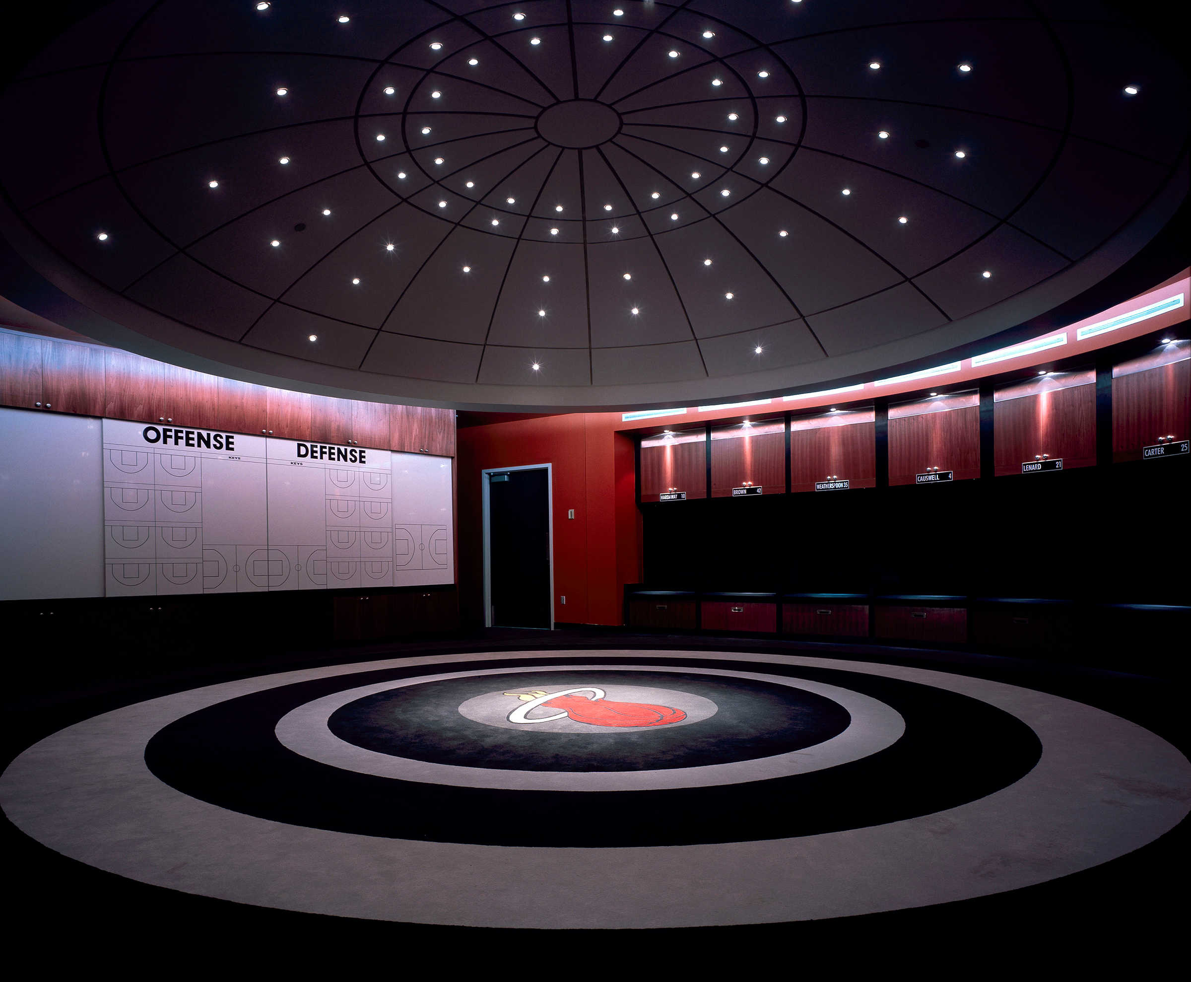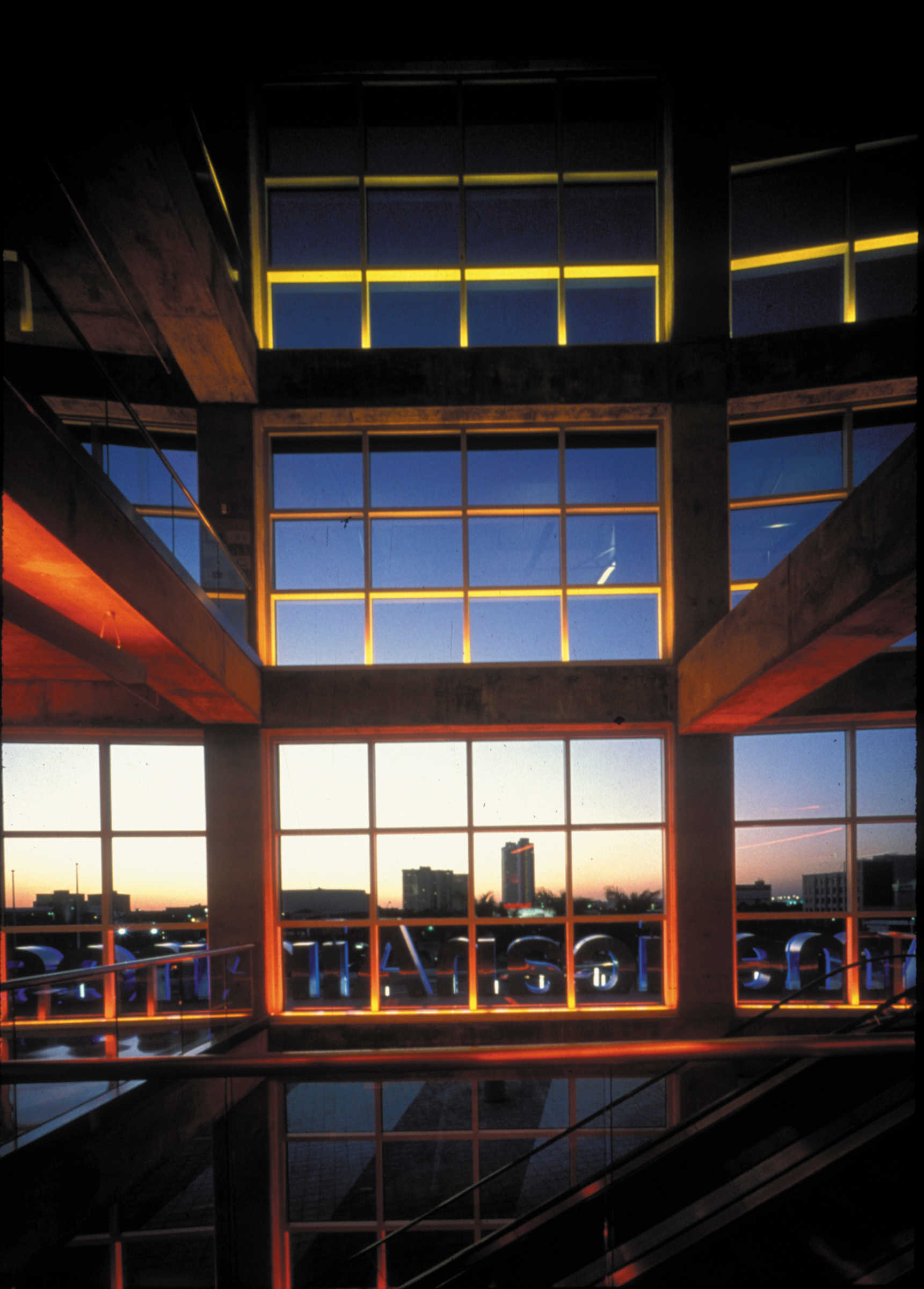 The colors of the façade lighting of the arena express the identity of its team, the Miami Heat. The central lighting principle treats the stadium as a crystal ring that can be viewed from all sides. The lighting on the facade is controlled by a sound detector system that reacts and adjusts to the public’s vocal reaction to the game. The light of the outer ring becomes brighter and more intense during the impassioned moments of the game, creating the illusion of a sunrise at dusk. On the interior, each quadrant of the building has a specific design identity to help orient the visitors.