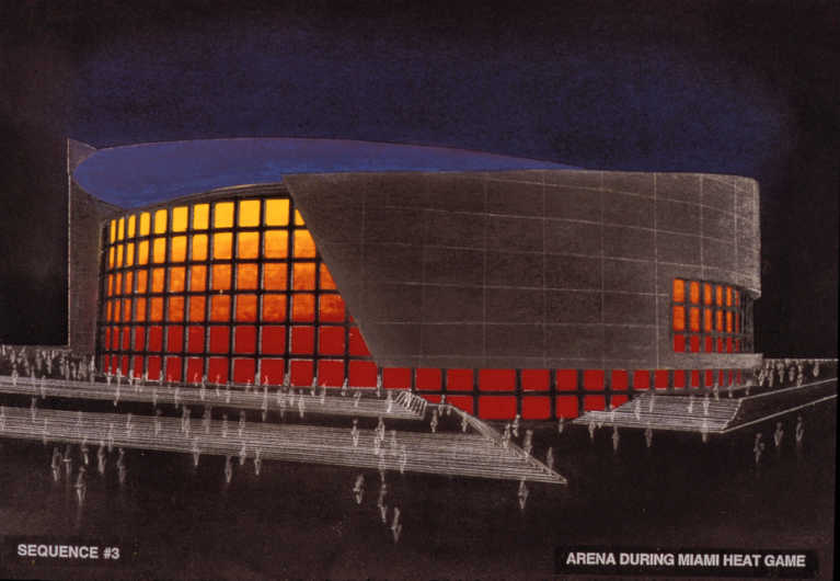 The American Airlines Arena, home to the Miami Heat, is a 19,600-seat multipurpose arena used for sporting events, ice shows, and concerts. The design incorporates various innovative features such as direct access from the parking area to suites and courtside lounge seats, a bayside landscaped terrace with outdoor cafe and bar, and a multifunctional basketball practice court facility. The arena design allows for views of bordering Biscayne Bay and serves as part of the revitalization of the Downtown area.