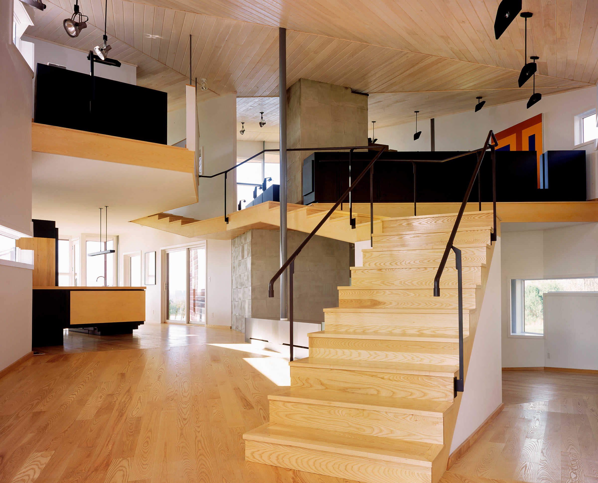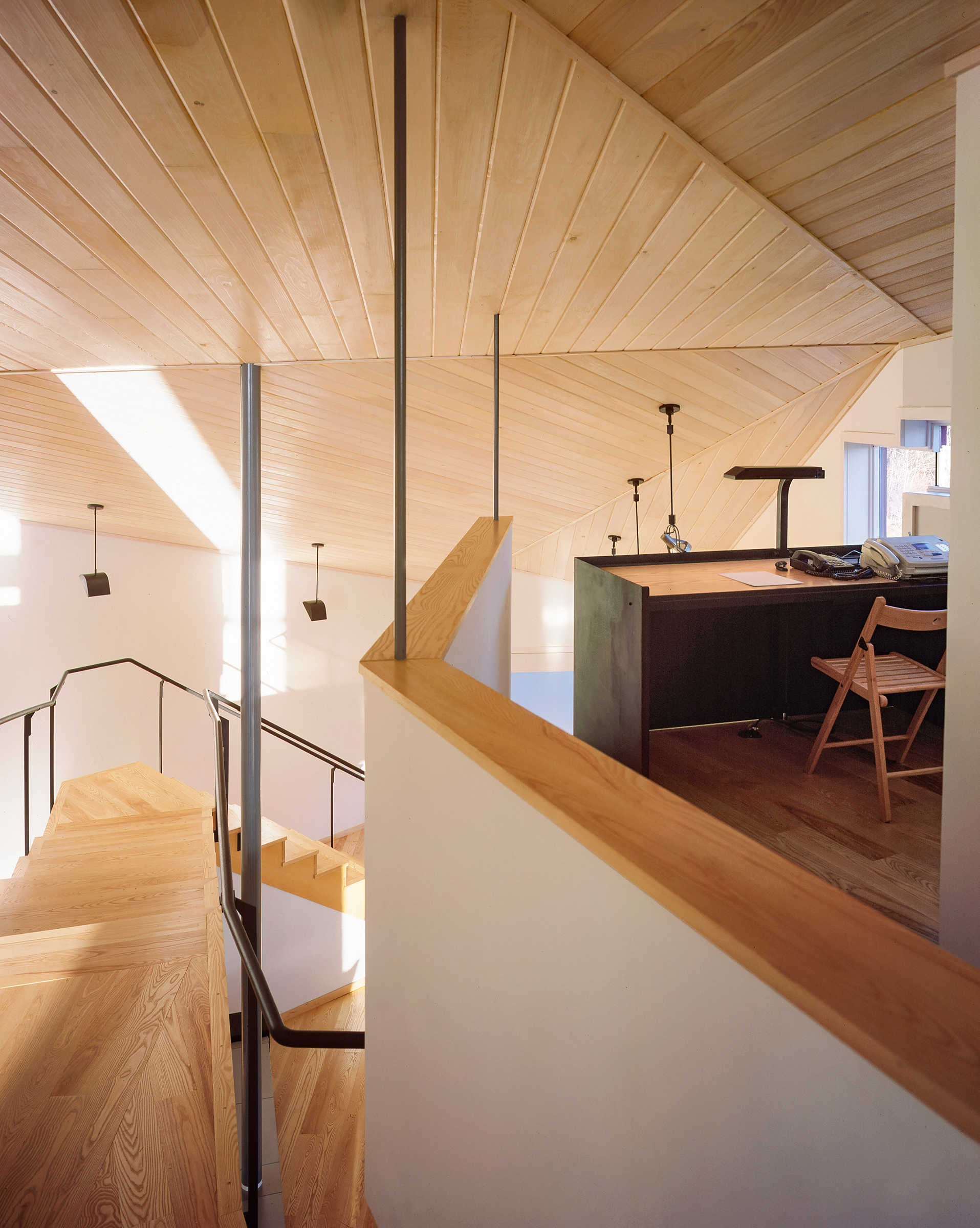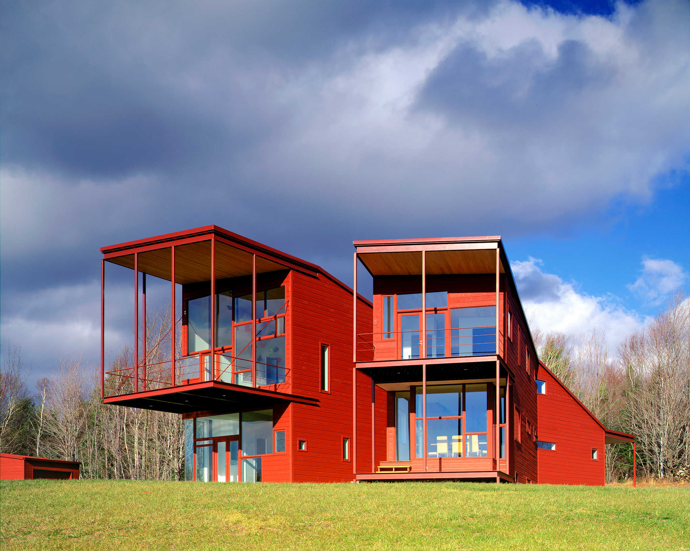 "On a hilltop site in a remote section of the Catskill Mountains, the "Y" House ascends the hill, splitting to form two arms, ending in balconies. The "Y" cuts a slice of sky and draws the sun into the heart of the house. Like a found forked stick, the Y makes a primitive mark on a vast site. The geometry contains a sectional flip of public/private and day/night with bedrooms below and living above. Maximum wall hanging space to accommodate a contemporary art collection is balanced with windows framing unique views. Deep balconies facing nearly due south act as passive solar devices allowing the winter sun to penetrate the interiors while excluding the hot summer sun. Steel framing and roof are iron-oxide red, siding is stained cedar while interiors are white with ash floors." From Steven Holl Architects website.