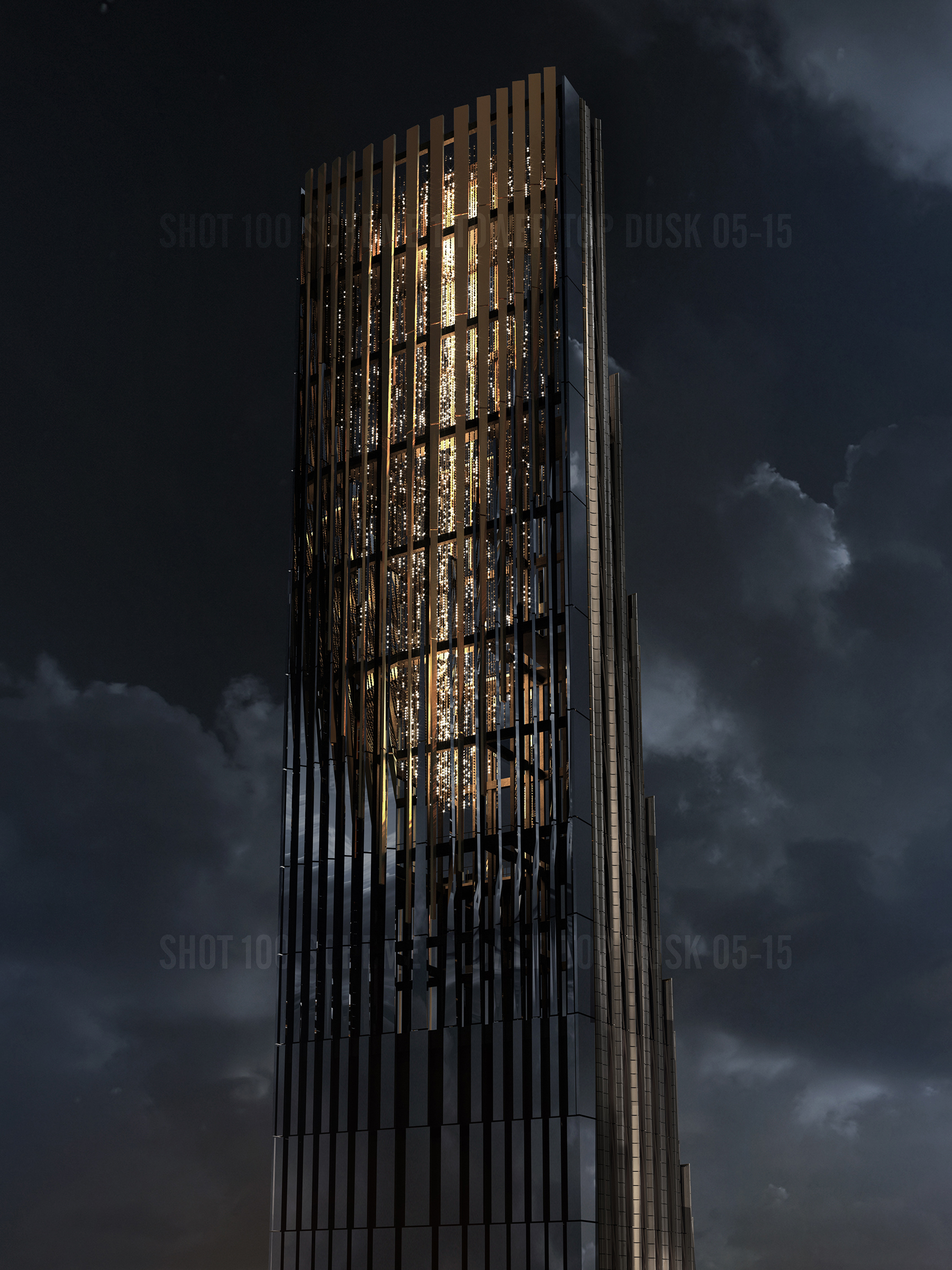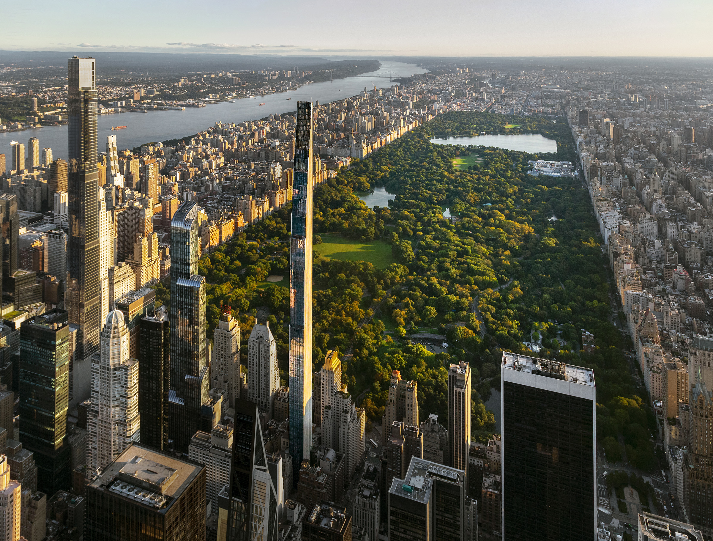 Reaching tall over Central Park South stands the new 111 West 57th Street tower, designed by SHoP Architects with interior architecture by Studio Sofield and developed by JDS Development Group and Property Markets Group. With a total height of over 1,400 feet, the residential tower is among the tallest new structures in the city. Celebrating the golden era architecture and complementing the historic Steinway Hall attached to the project’s base, the building’s New York design evokes without mimicking, the grandeur of the art deco period while utilizing state-of-the-art engineering and technology. To enhance the elegant profile of the feathered or hyper-setback tower clad in terracotta and bronze, L’Observatoire International developed integrated facade lighting, like an intricate embroidery of gold thread.