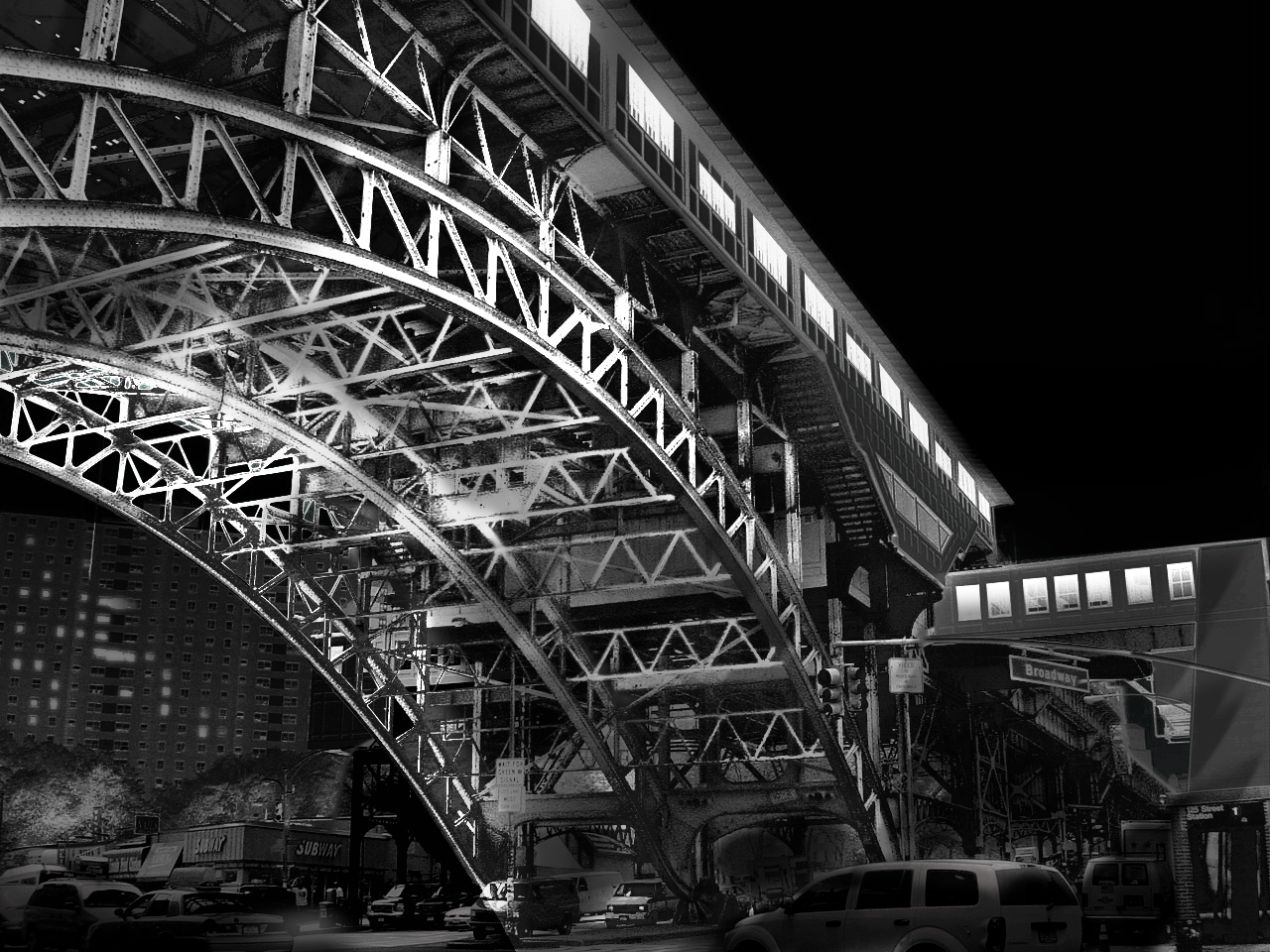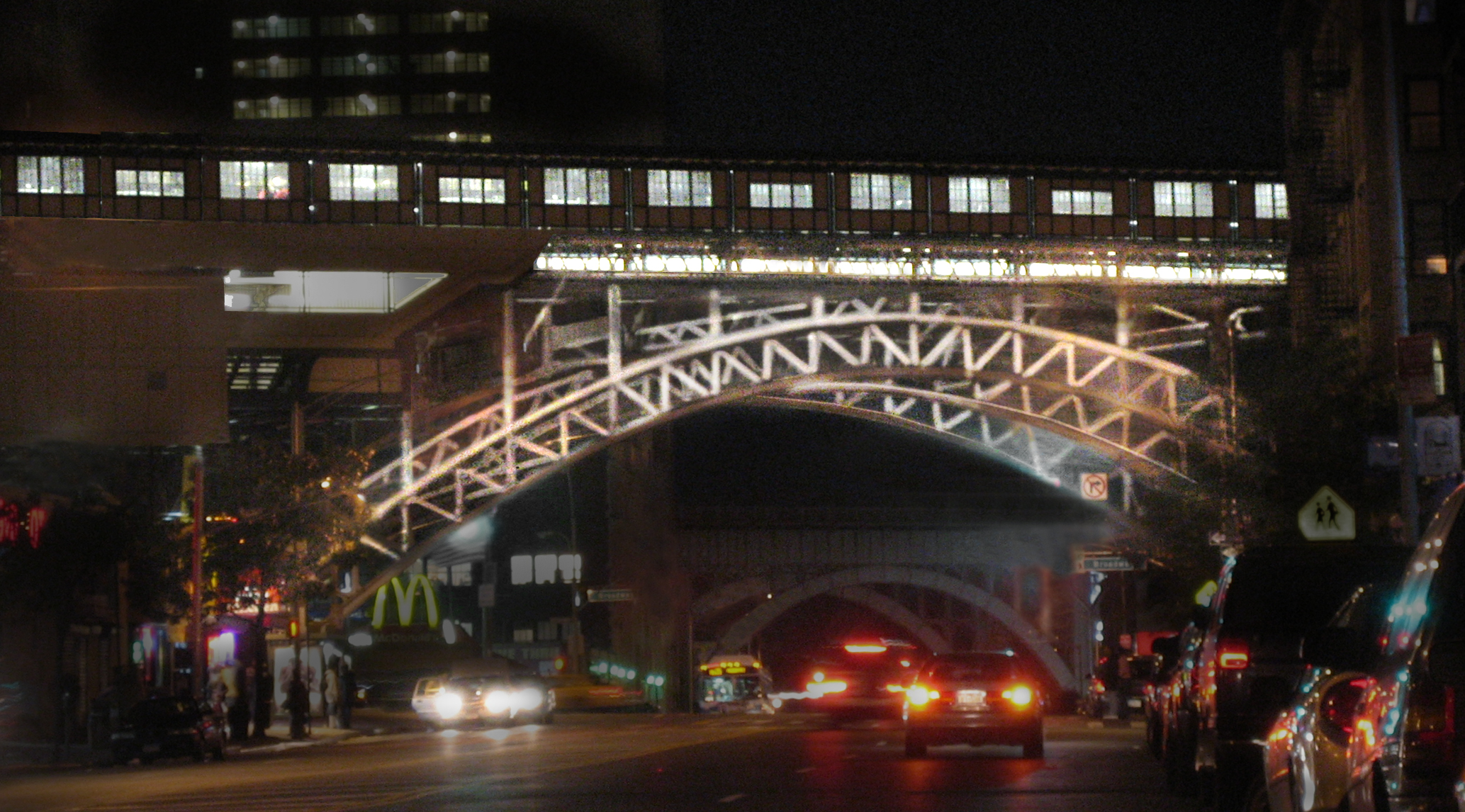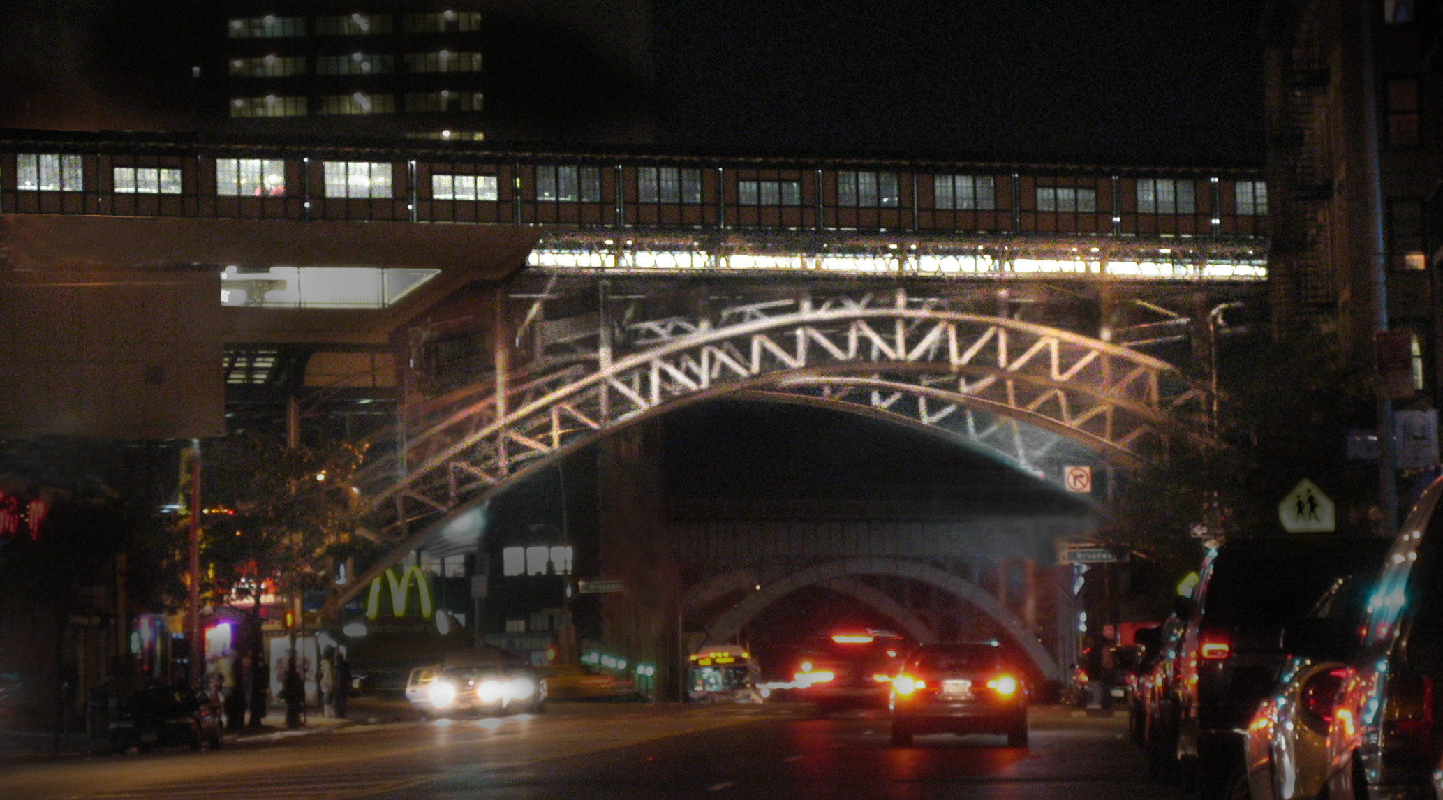 A comprehensive masterplan was developed with the goal of bringing to light the unique characteristics of the neighborhood while making the area safe and easy to navigate. Specific elements are highlighted to create local architectural icons, drawing attention away from the traffic by creating visual points of interest. The MTA bridge is charcaterized by a combination of fine filigree forms with industrial strength. Lighting from within the structure will bring about a play of light and shadow, making use of the delicate filigree shapes. At the top of the bridge, dynamic lighting will be linked to the movement of the subway. The highway viaduct bridge is a historic artifact with dramatic arches; they will be lit from within by either street poles or suspensions.