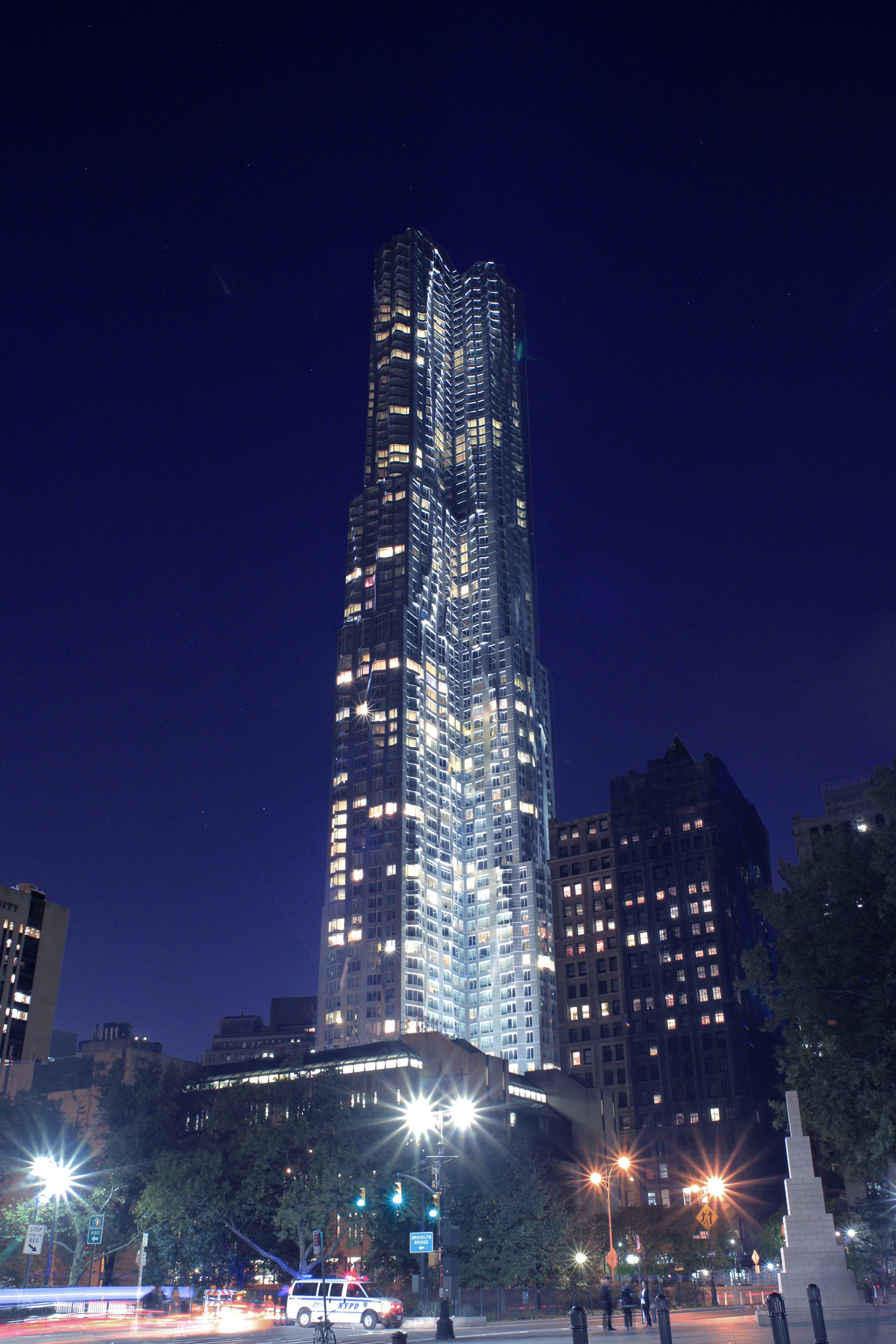 8 Spruce Street, originally known as Beekman Tower and currently marketed as New York by Gehry, is a 76-story skyscraper designed by architect Frank Gehry in the New York City borough of Manhattan at 8 Spruce Street, between William and Nassau Streets, in Lower Manhattan, just south of City Hall Park and the Brooklyn Bridge.