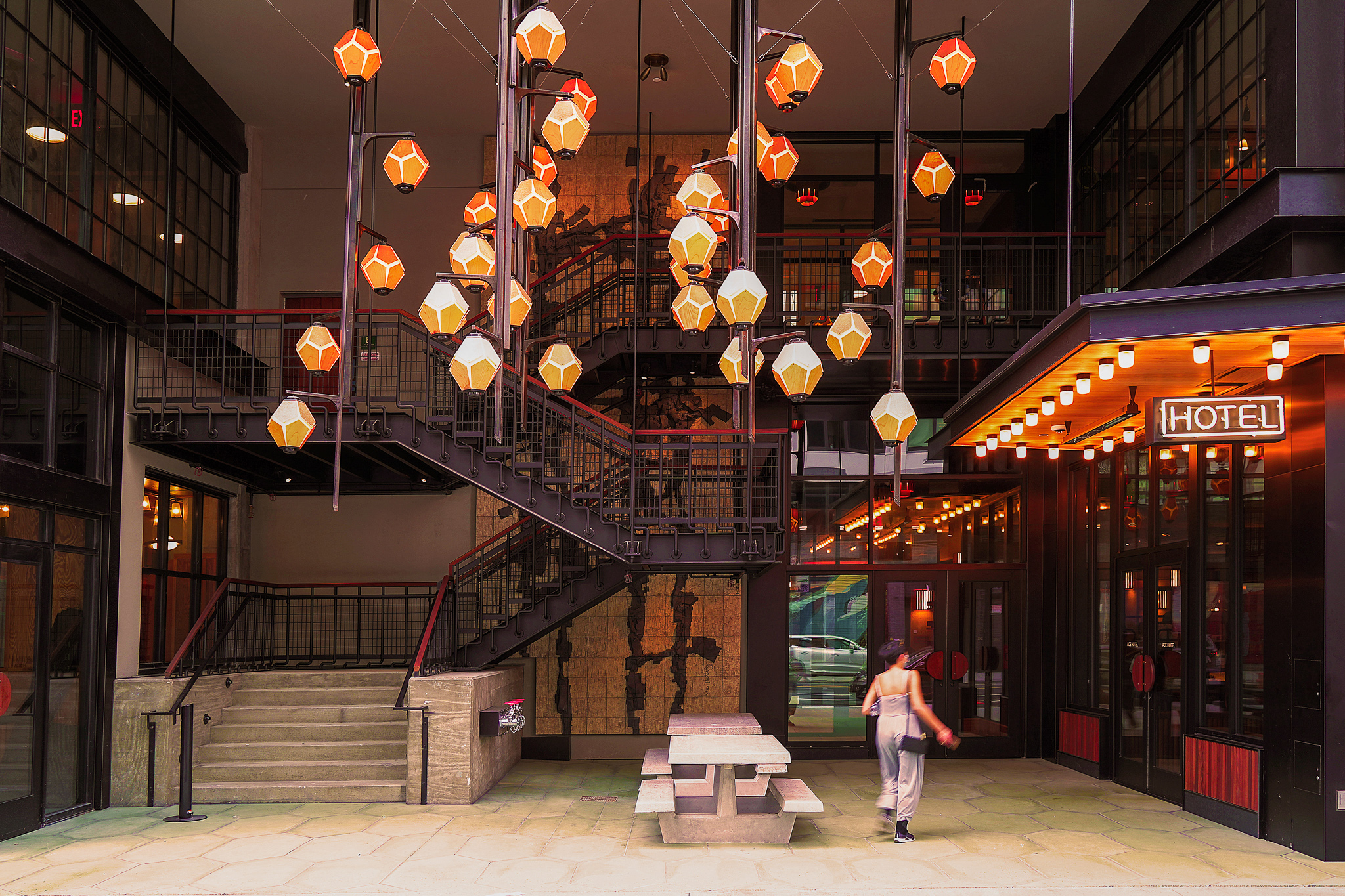 L’Observatoire International's scope included the front-of-house public spaces, building exterior, lobby, flex room, bar, restaurants, meeting rooms, event space, pre-function, gallery, guest rooms, and corridor.