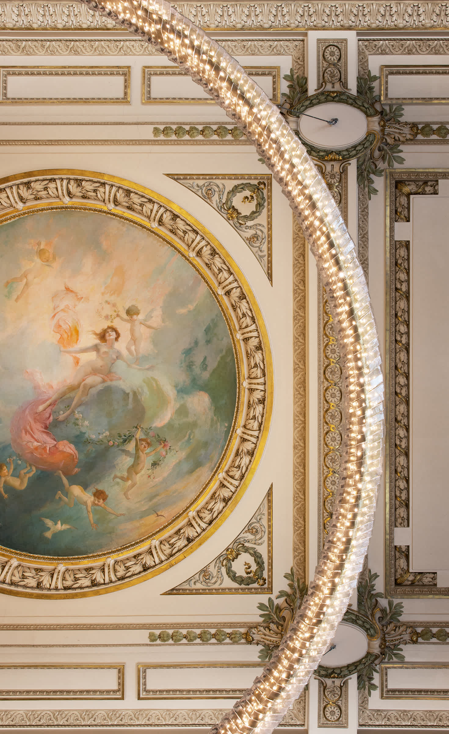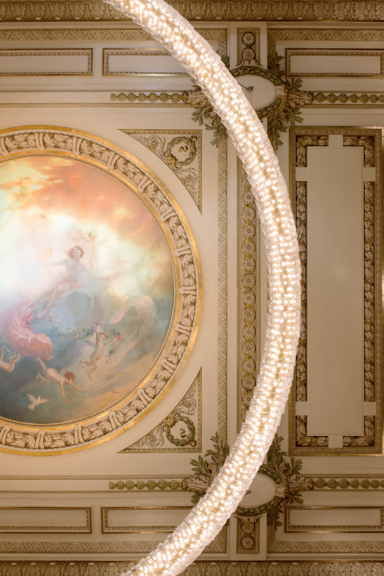 At the center of the room, video is projected onto the large, painted ceiling medallion and animate the artwork through the juxtaposition of infinite waves of color. A 23-foot circular suspension frames the ensemble. Seven hundred pieces of glass, custom-made by glass artist Aristide Najean, surround 2346 LED lights and mimic the delicate glow of fireflies. Lighting devices are also integrated into the furniture set especially designed for this renovation. A cutting-edge control system enables multiple light variations in order to create unique atmospheres. Combining technological innovation with the dramatic quality of the space, L'Observatoire’s lighting design awakens this lively historical décor.