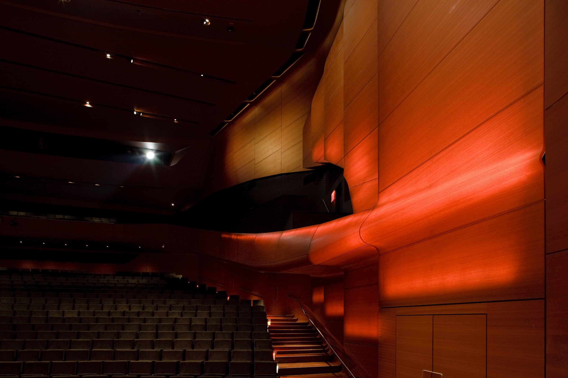 L'Observatoire International provided the lighting design for the concert hall, the school and surrounding public spaces. The lighting concept unifies and brings a nocturnal identity to the many public spaces, thereby accentuating the vitality of the institution’s nightlife. In the concert hall, the lighting is hidden behind the walls' resin panels, making the walls themselves emit light. In lieu of the parting of the stage curtains, the start of the concert is signaled by the blushing walls.