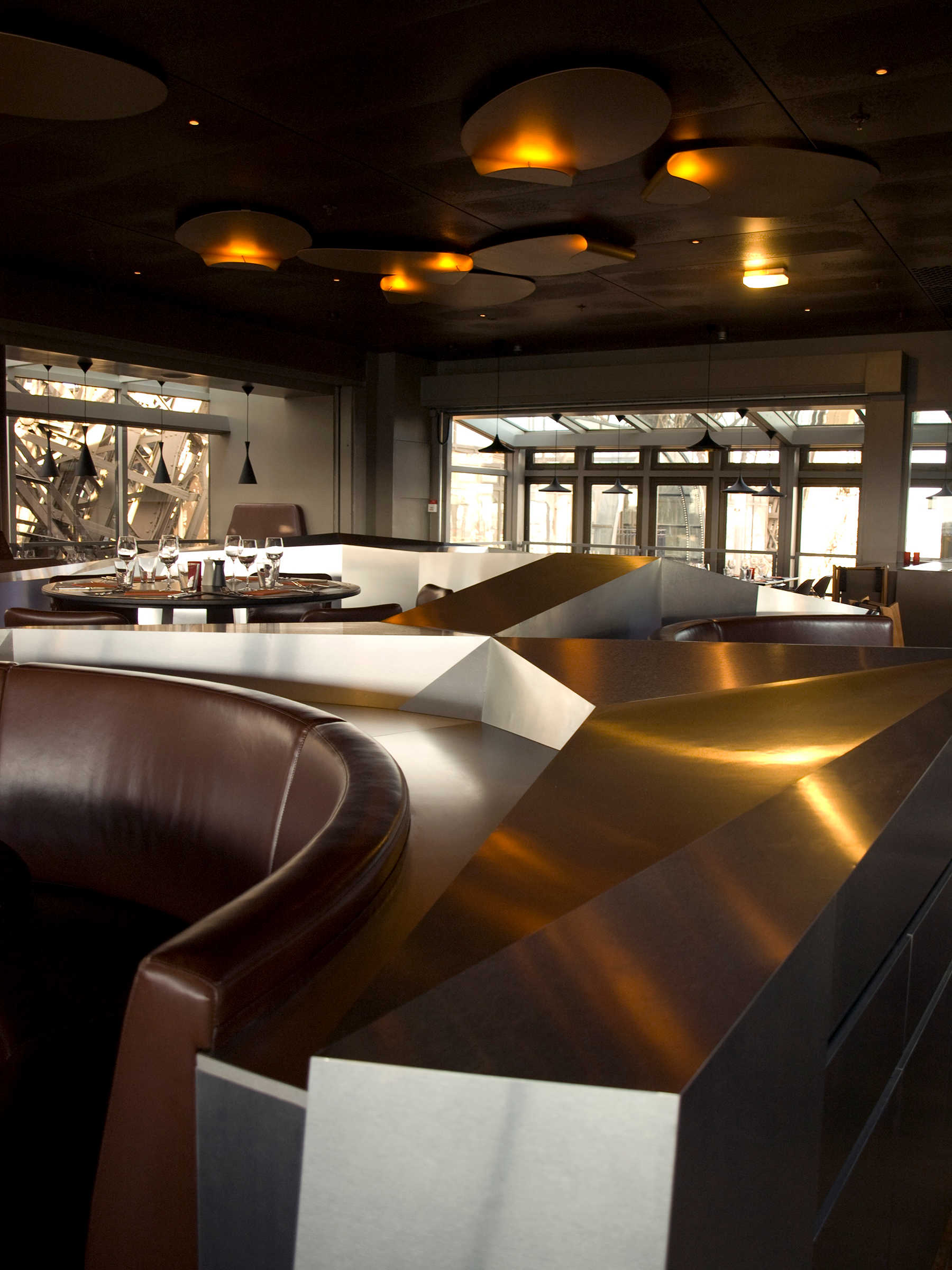 Up the sweeping wood and steel staircase, or the private elevator, the restaurant is striking with the iron-work of the tower serving to remind the visitor of their elevated location. During the day, the atmosphere is a picnic the Paris sky, while in the evening, it is the perfect place for a one to one romantic dinner with the City of Light.
