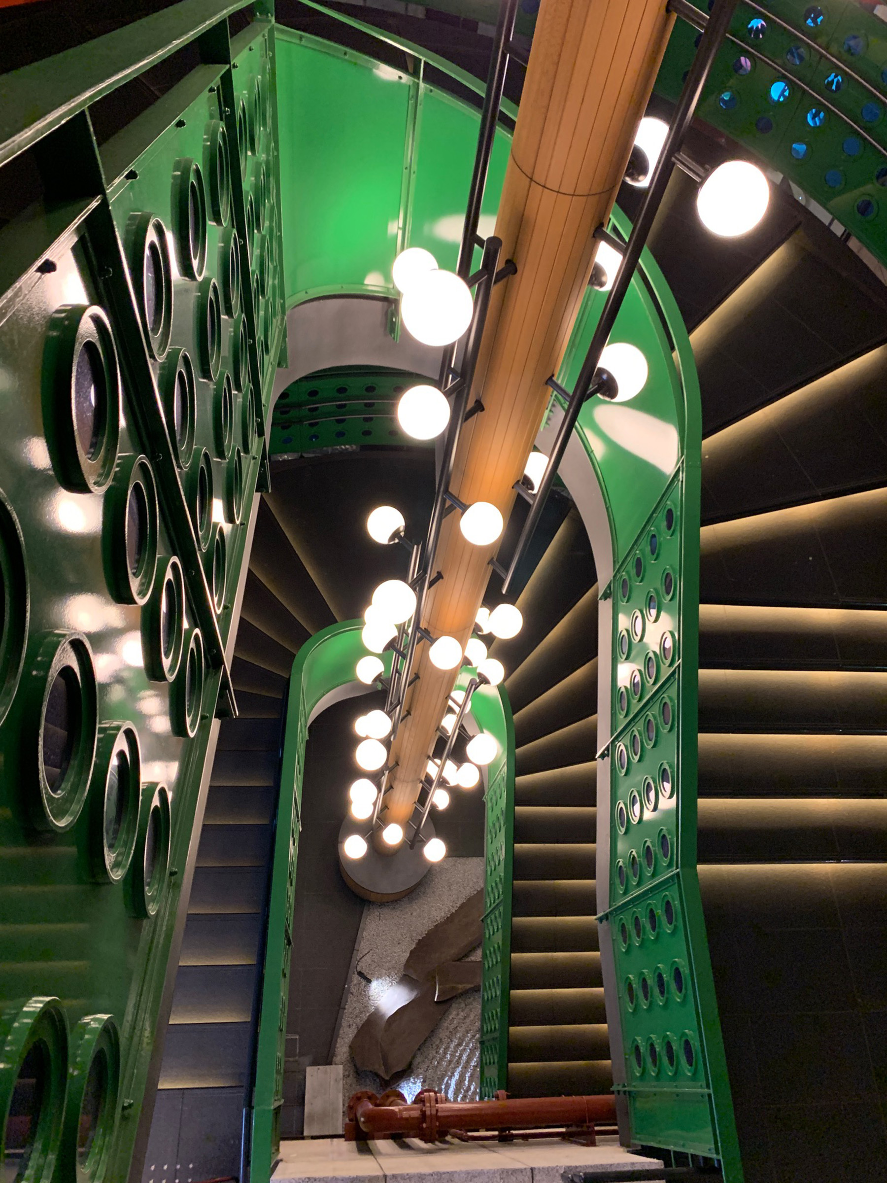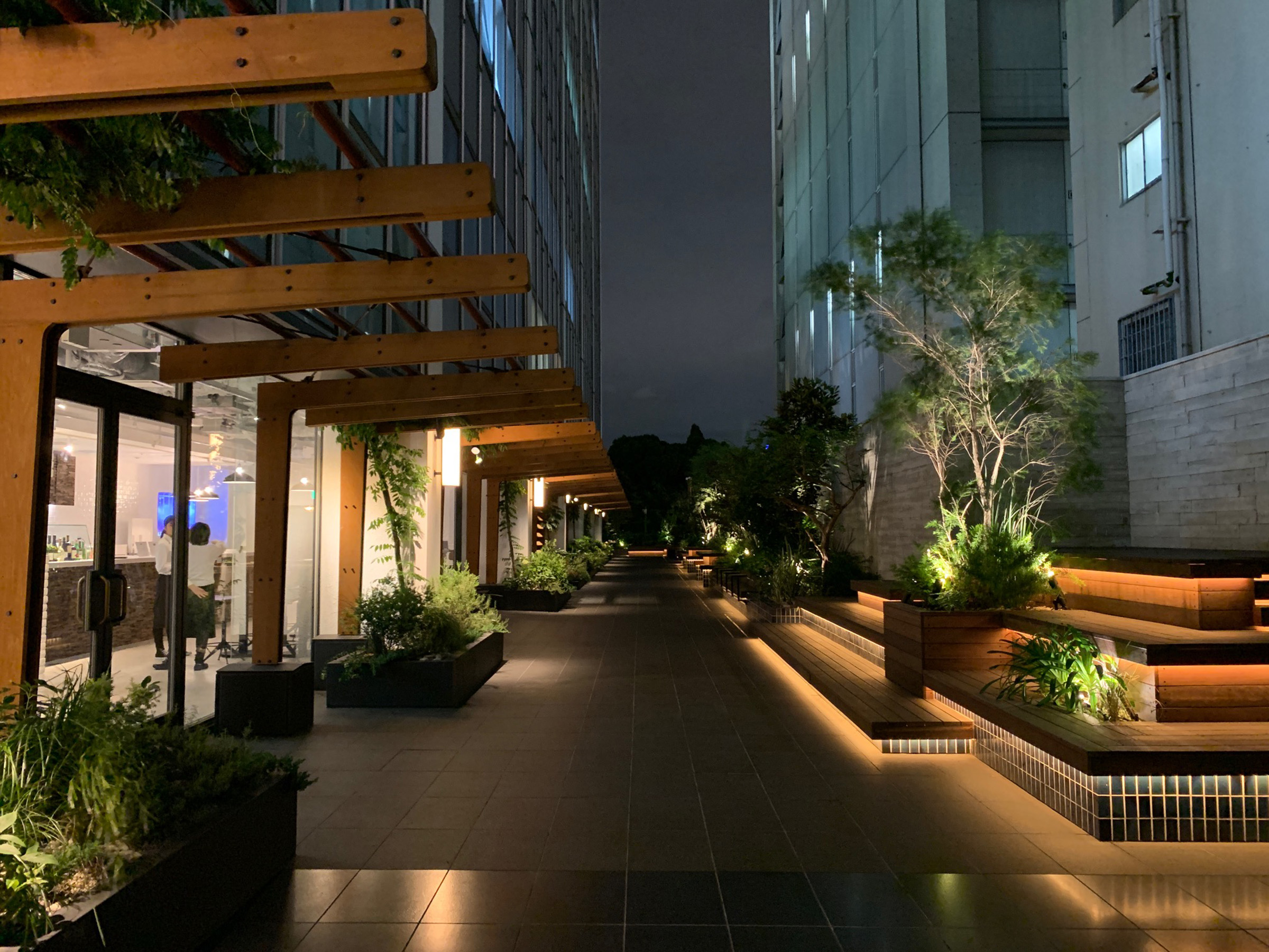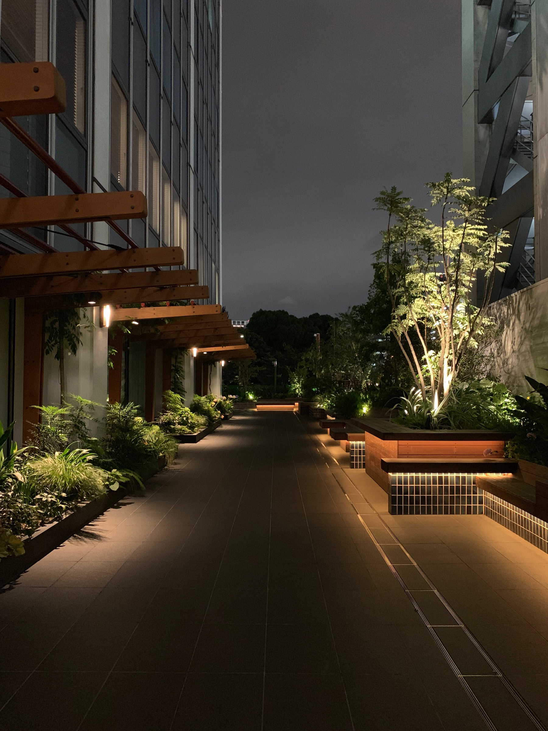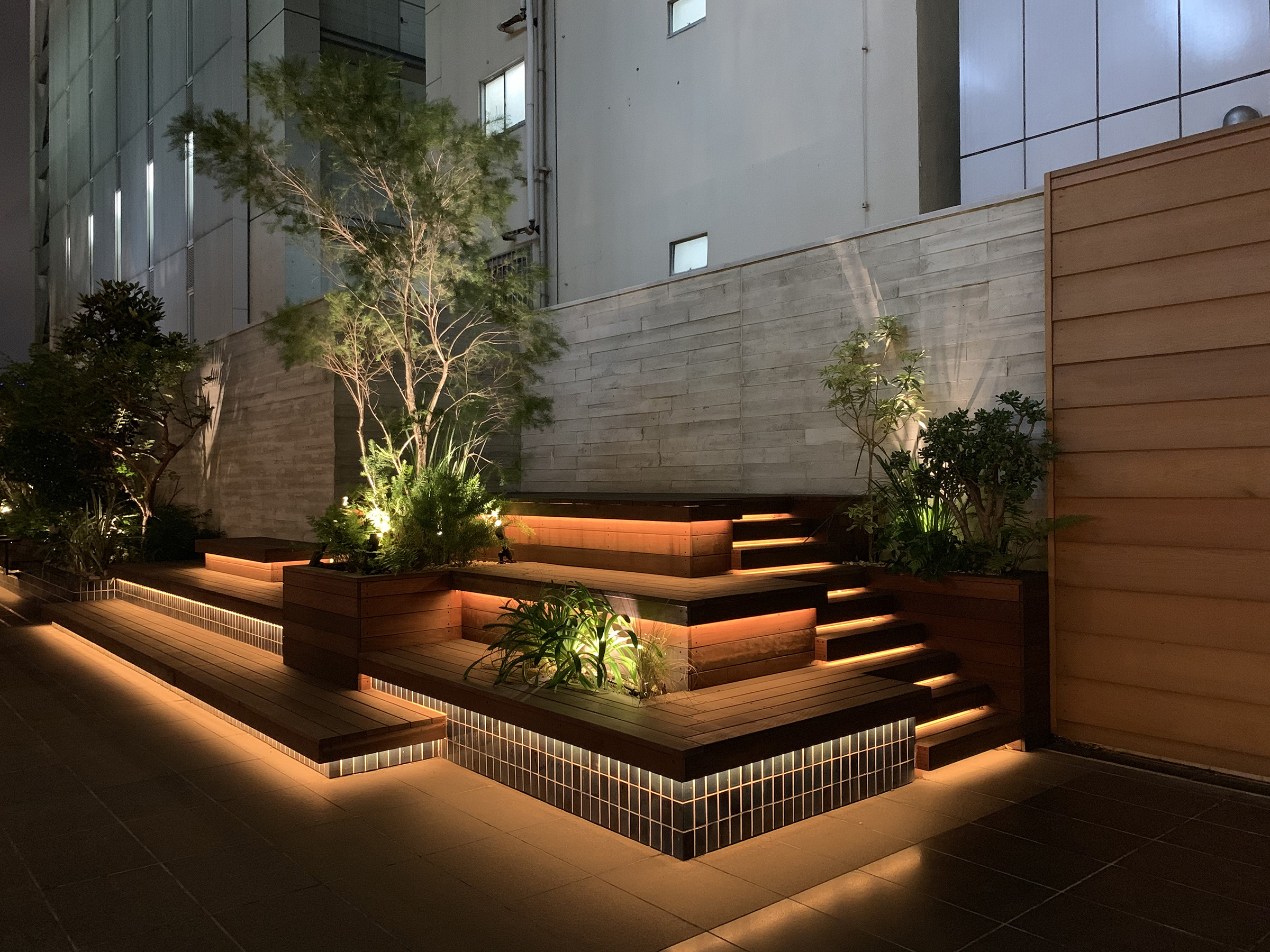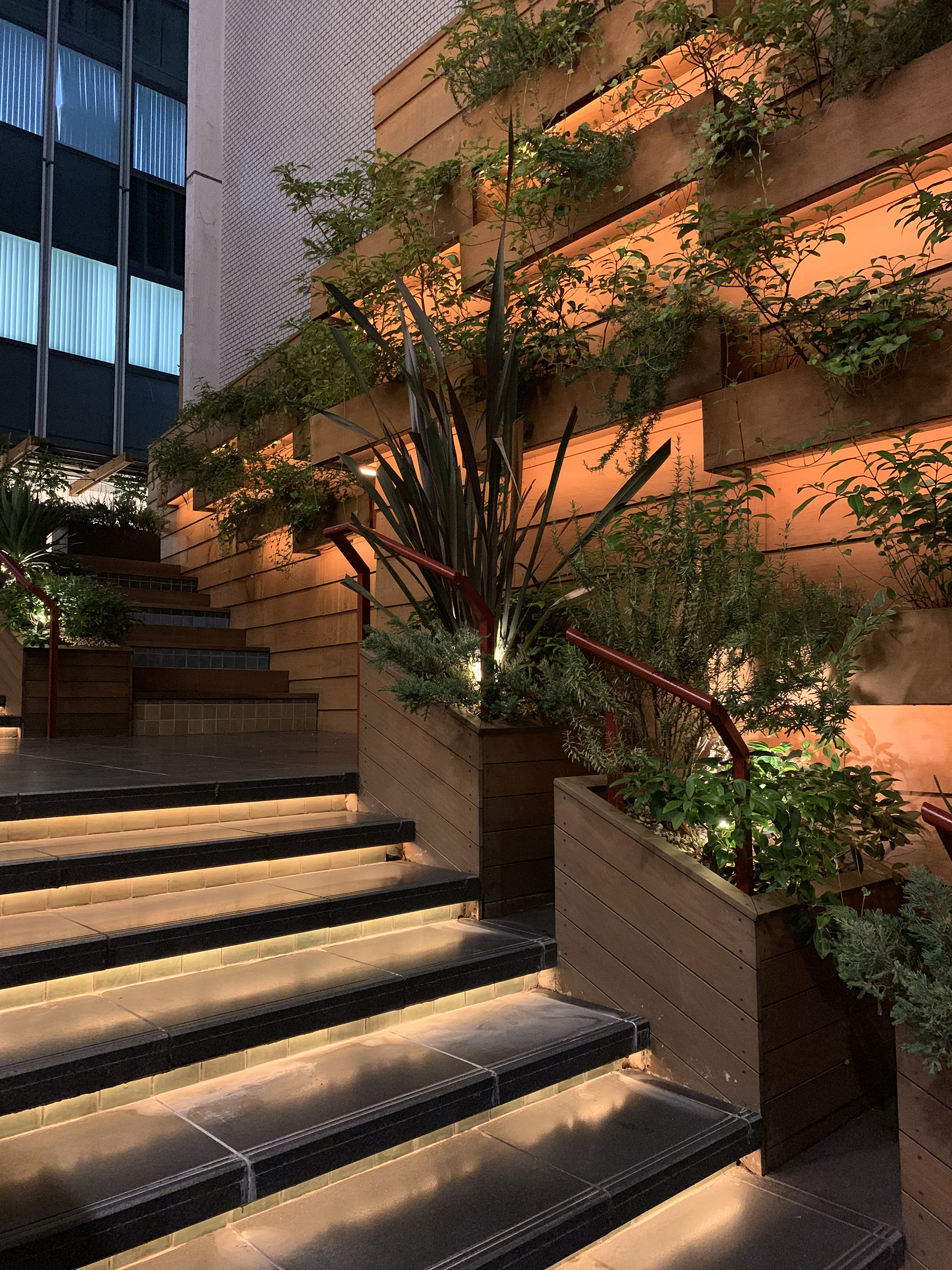 At the ground floor, a spiraling tree installation of lights intersect the three outdoor levels, ending at the second floor terrace where a dance between natural and artificial light is projected through custom pergolas. Integrated lighting serves as a guide into the basement food and beverage areas with a glass feature wall blurring the distinction between interior and exterior space. The executive entrance at the ground floor is encompassed by an undulating sculpture of lights where the elevator lobby creates street presence with wide circular coves, dropped globes and custom wall sconces.