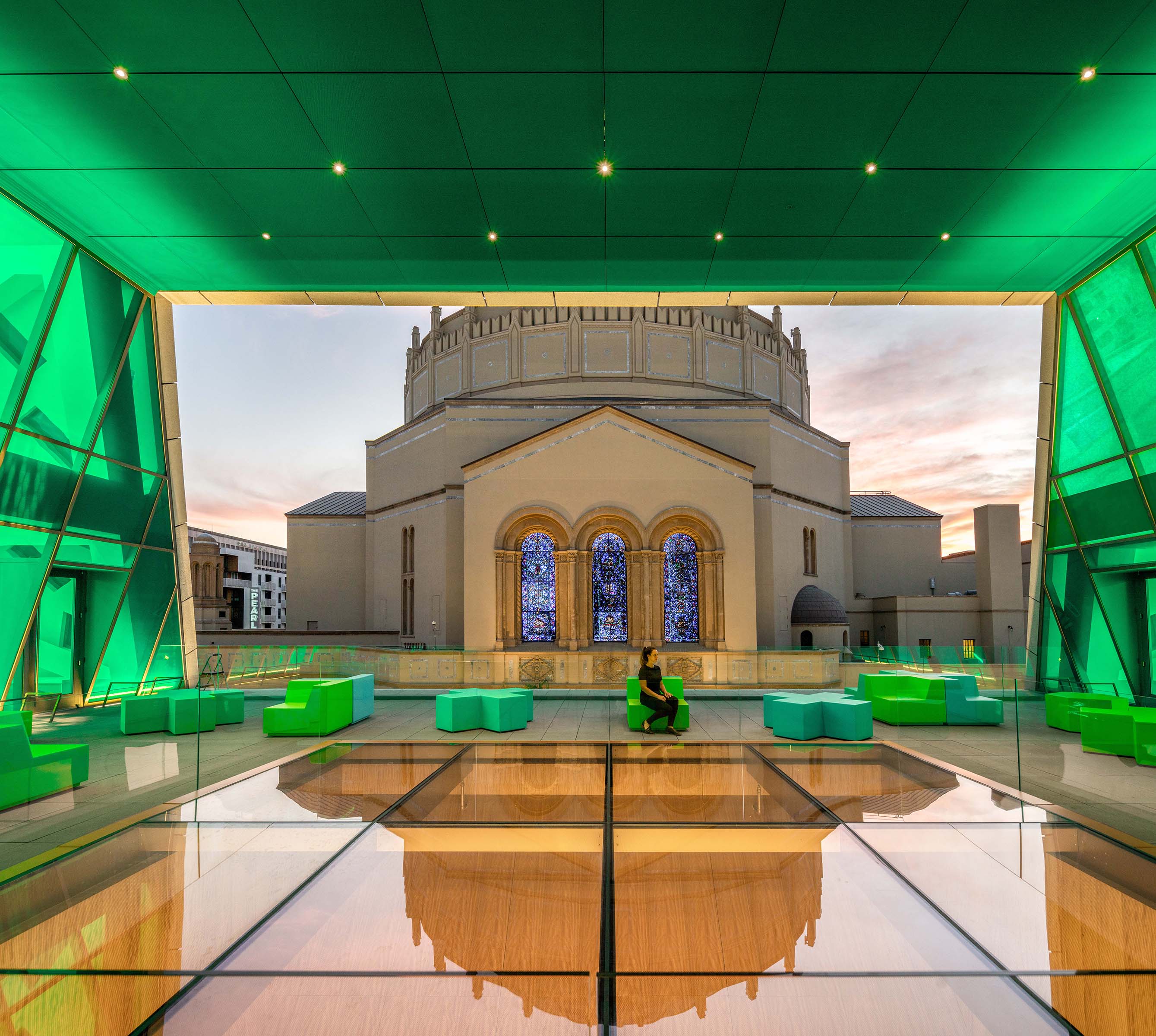 On the ground floor, a large, arched banquet hall invites the public inside. Lined in wood, the space is illuminated to emanate a welcoming atmosphere that extends to the street. On the upper levels, interior and exterior event spaces are positioned to overlook the Temple, and an amphitheater connects to the roof garden. A consistent, unifying system of diffuse and accent lighting runs throughout most interior spaces of the building—from the circulation spaces to the offices and event spaces—to maintain a cohesive overall scheme of illumination as it projects outward to the city.
