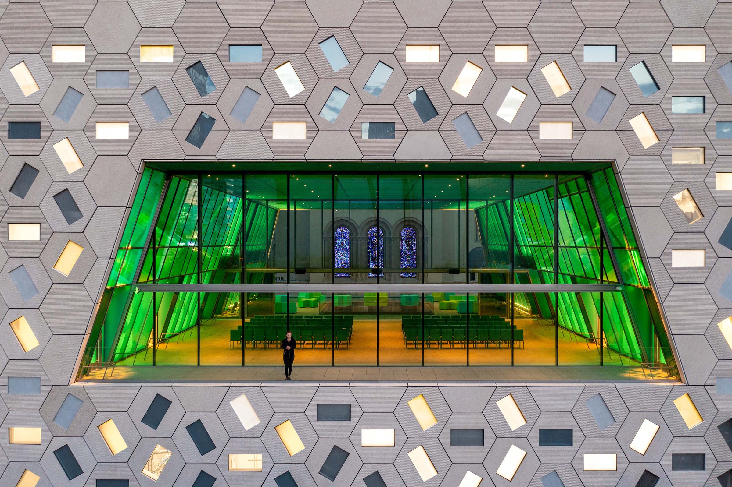 As it rises, the building angles away from the Sanctuary and its adjacent historic school, changing its rectilinear footprint and bringing lightness into the spaces between the buildings. The exterior is illuminated in a soft wash of light, shaping the building as a monolithic whole. It elevates the striking identity of the building, heightening the detailed materiality of its hexagonal facade panels while underscoring the minimalism of the architecture as a whole.