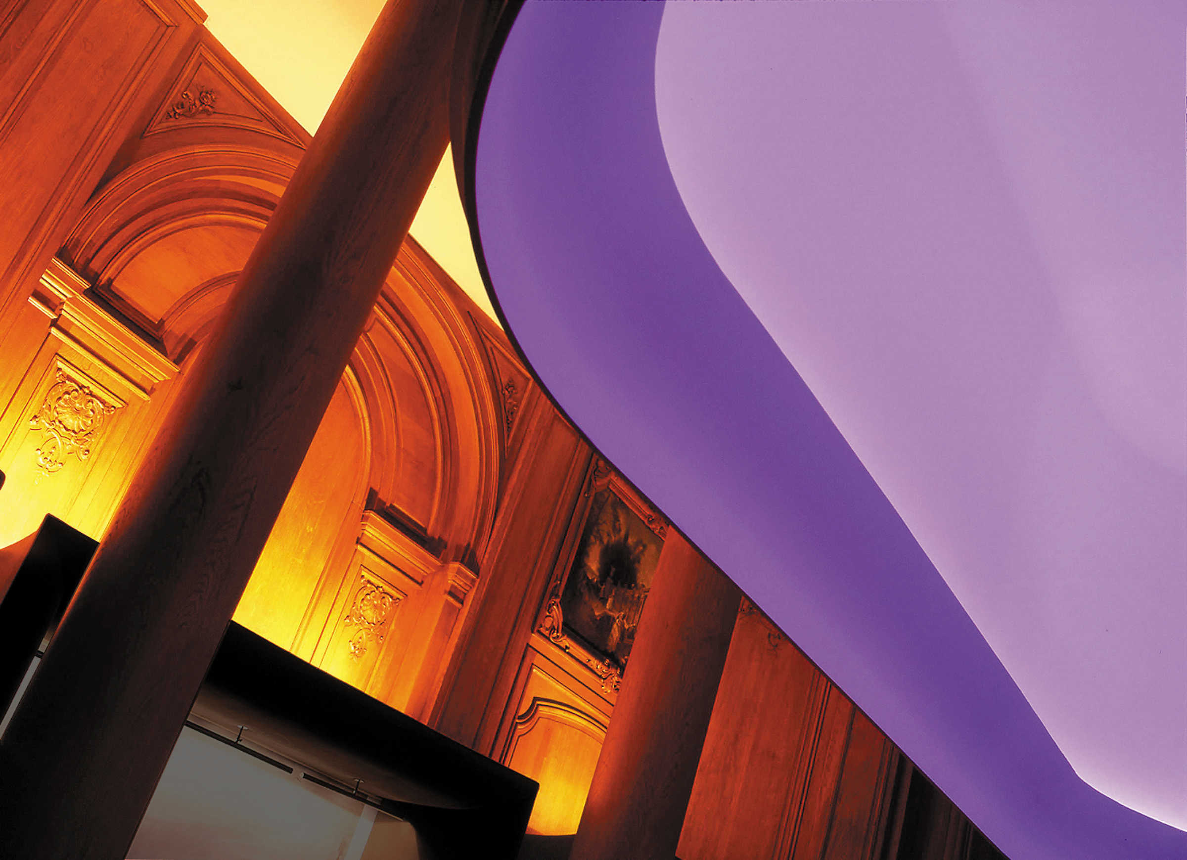 Lighting transforms the bar into fire and ice. The bar itself appears as a block of ice, emanating blue light from within. Conversely, the chandelier above radiates a range of colors created by varying intensity of red and blue lights. The room’s color changes gradually throughout the night, starting with blue in the early evening and culminating in deep red at the end of the night.