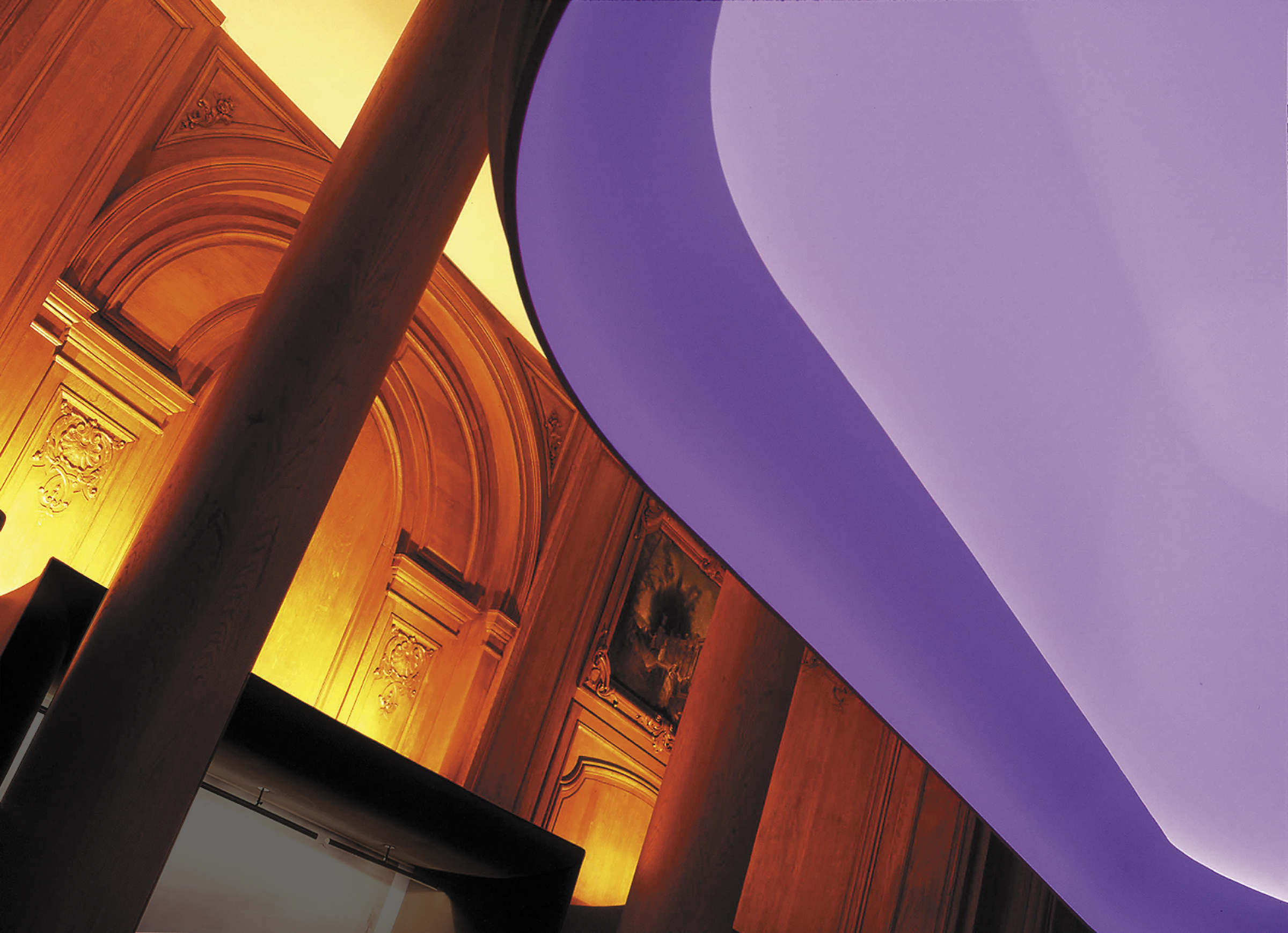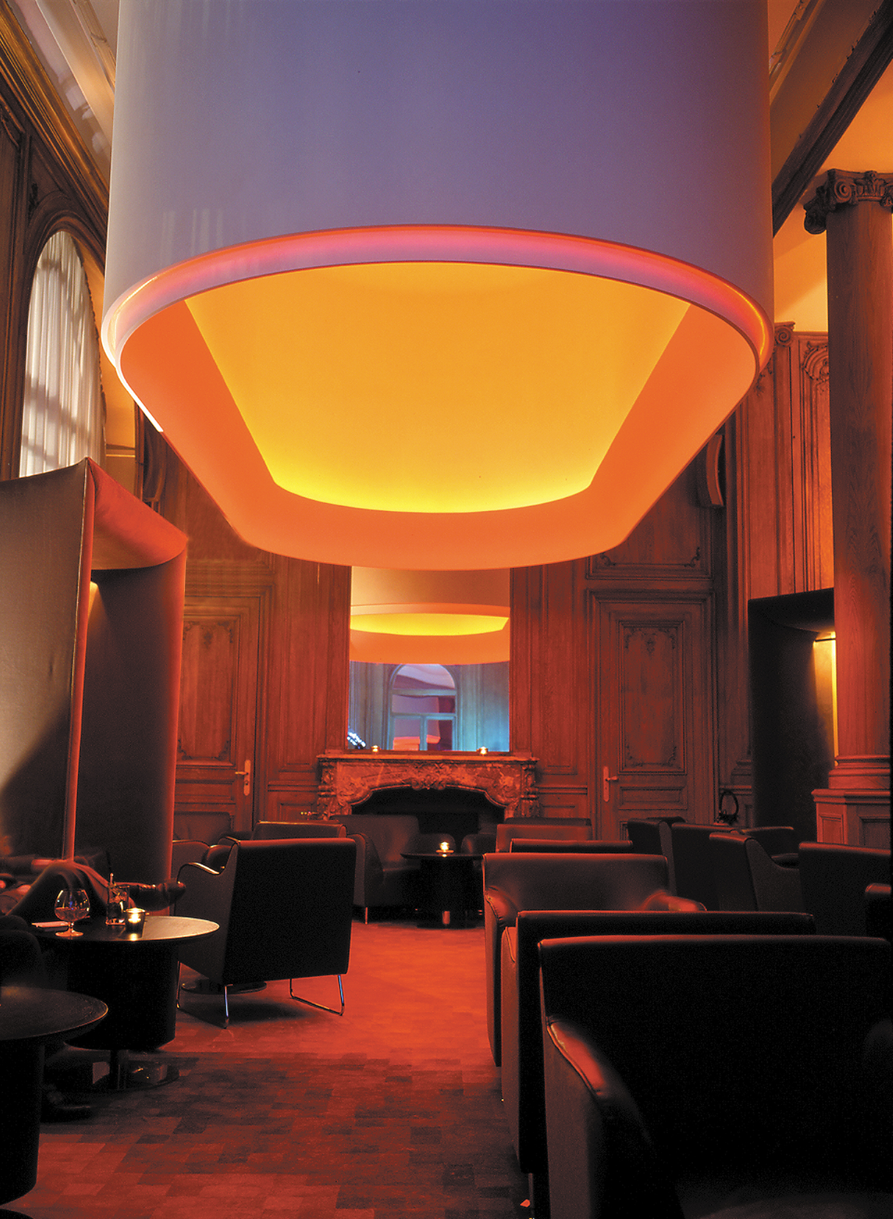Lighting transforms the bar into fire and ice. The bar itself appears as a block of ice, emanating blue light from within. Conversely, the chandelier above radiates a range of colors created by varying intensity of red and blue lights. The room’s color changes gradually throughout the night, starting with blue in the early evening and culminating in deep red at the end of the night.