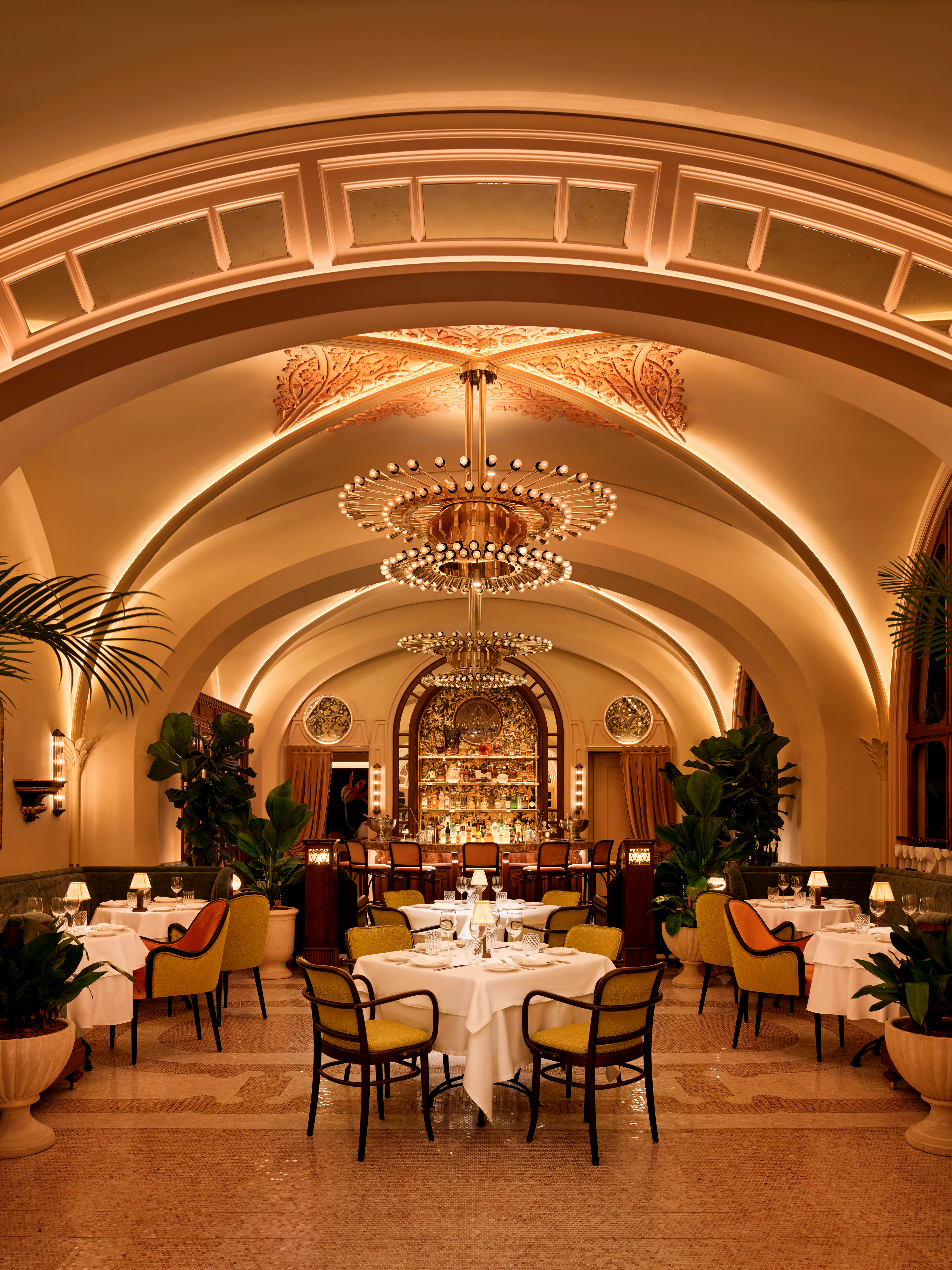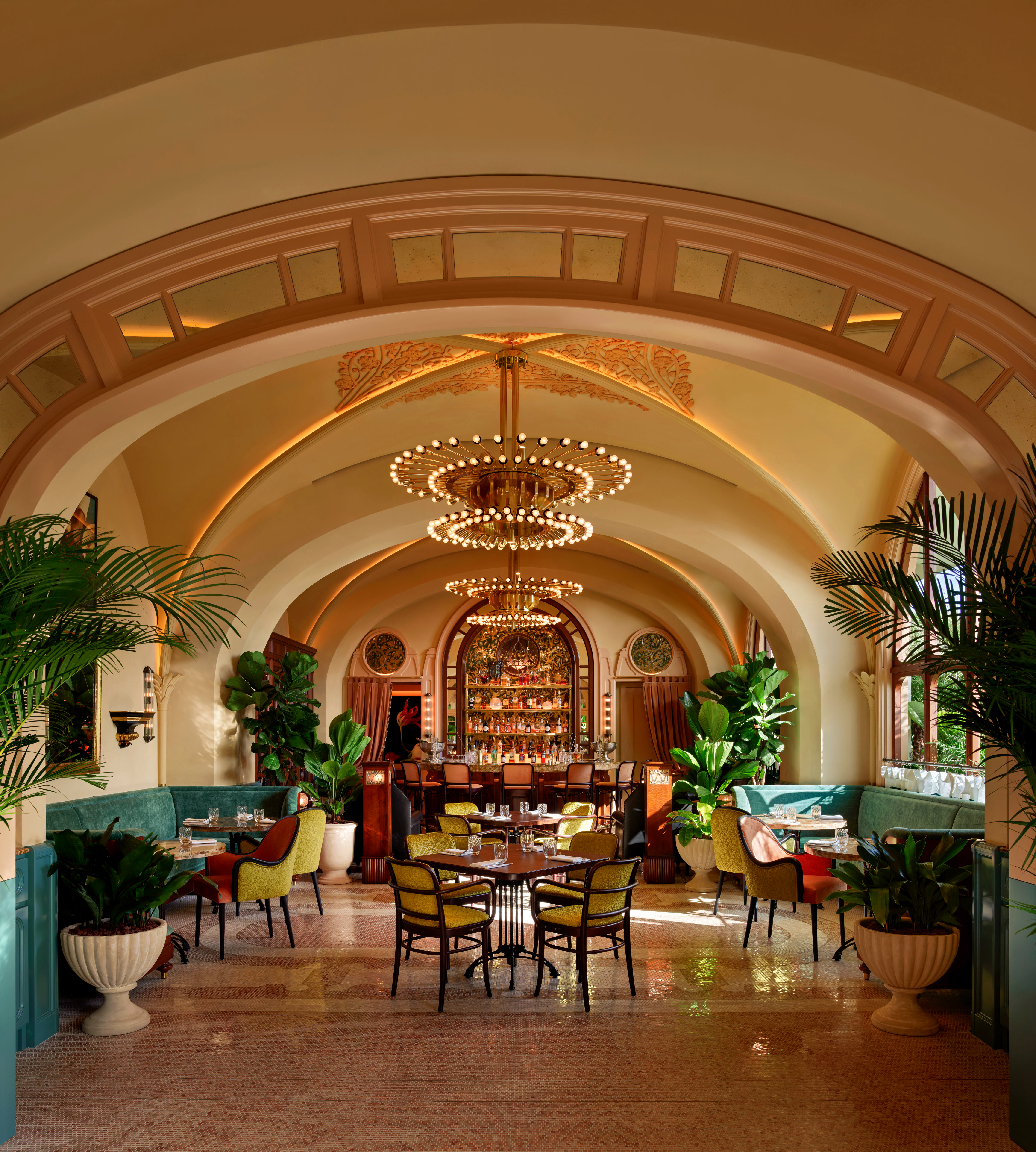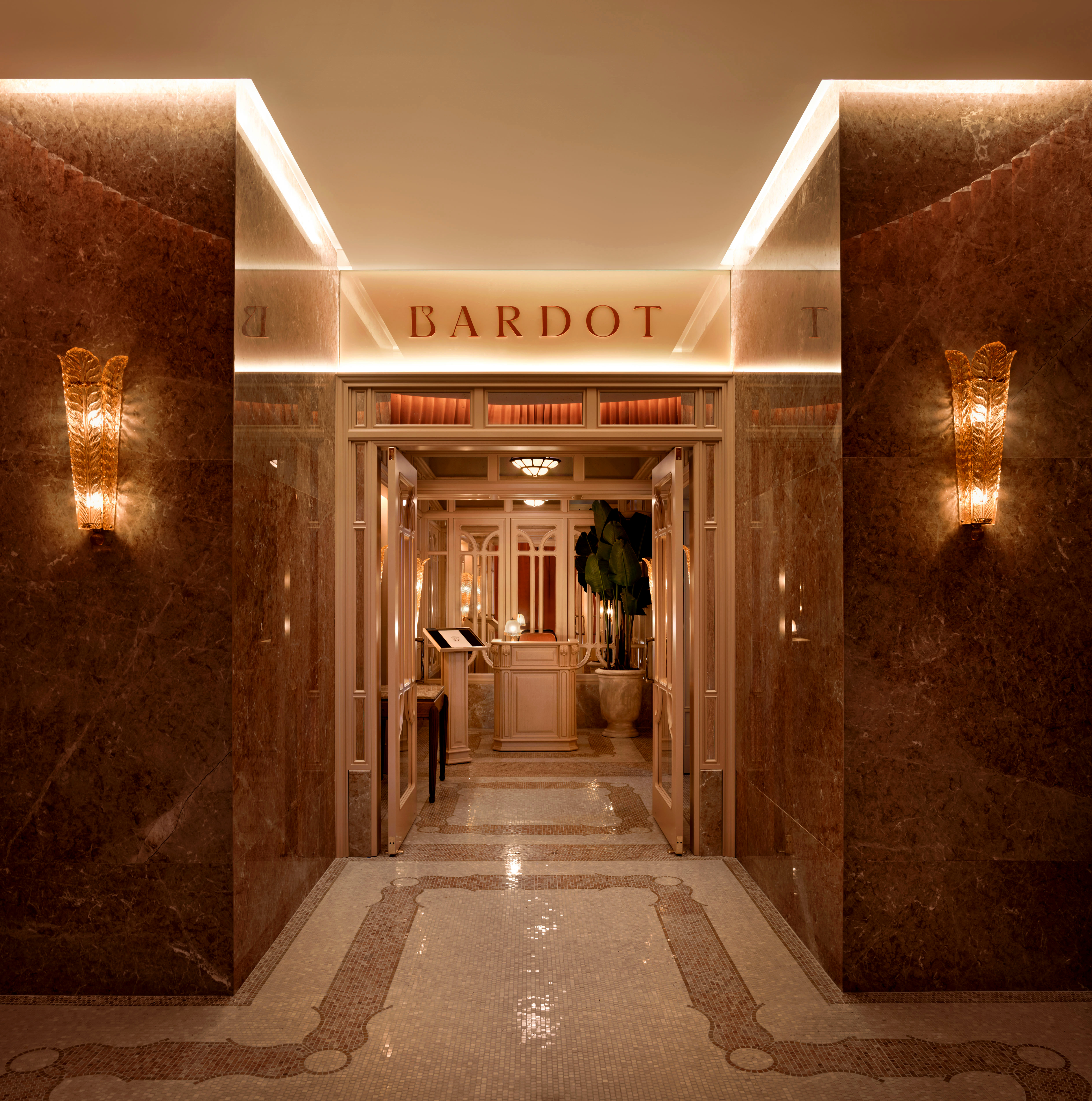 The intent was to create a timeless space, with classical cues reimagined through a contemporary lens. Layers of lighting are embedded within the architecture: soft glows emerge from hidden pockets and integrated details, contrasted with bold decorative fixtures that give the space its clear and distinctive character. By day, Bardot is airy and light-filled; by night, it transforms into a cinematic yet intimate setting—a glowing series of vaulted hideaways and booths, suffused with tones of honey and gold, culminating in the dramatic bar with its multi-level illuminated shelving.
