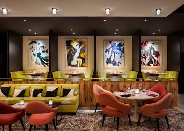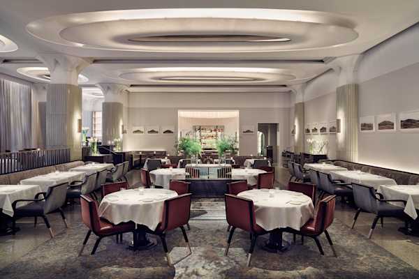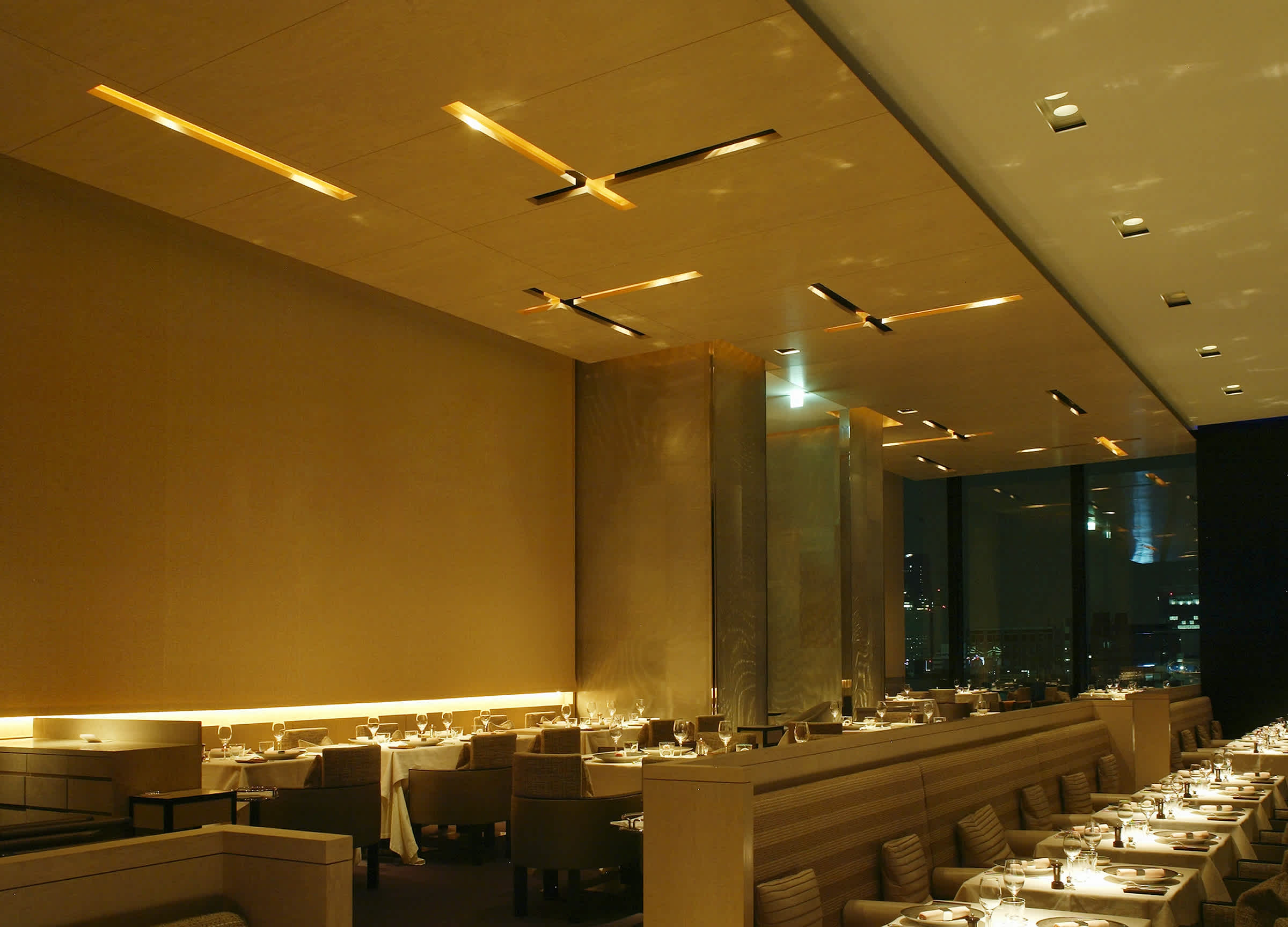 The restaurant reflects the identities of clothier Chanel, in whose building the restaurant resides, and of Alain Ducasse, its star chef. The idea was to create an environment of warmth and intimacy amid the bustle of Tokyo. No lighting objects were used; instead, all of the light sources are hidden, so as not to detract from the sleek aethetic of the space.