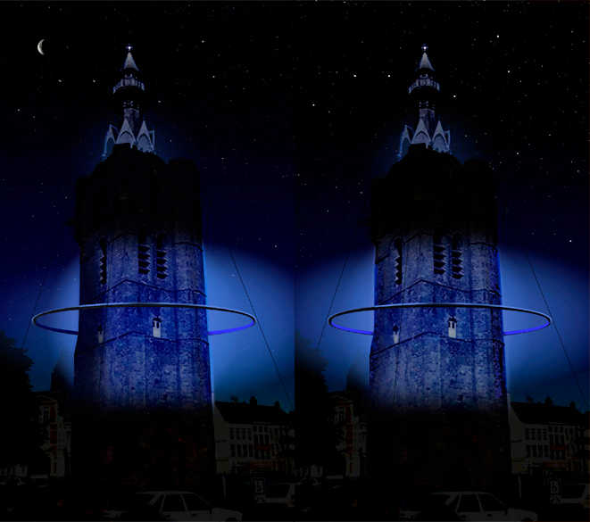 A metal ring floats around the tower, it’s shiny outer surface reflecting the image of the surrounding city during the day, it’s inner surface becoming a glowing halo at night. The light changes according to the current phase of the moon, beginning with a translucent blue during a full moon, adding a brighter white in quarters until the new moon, when the belfry is illuminated by a brilliant white light.