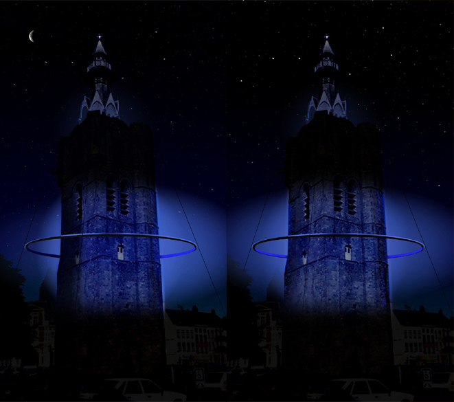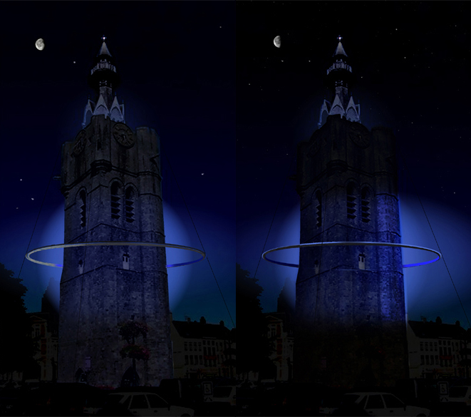 A metal ring floats around the tower, it’s shiny outer surface reflecting the image of the surrounding city during the day, it’s inner surface becoming a glowing halo at night. The light changes according to the current phase of the moon, beginning with a translucent blue during a full moon, adding a brighter white in quarters until the new moon, when the belfry is illuminated by a brilliant white light.