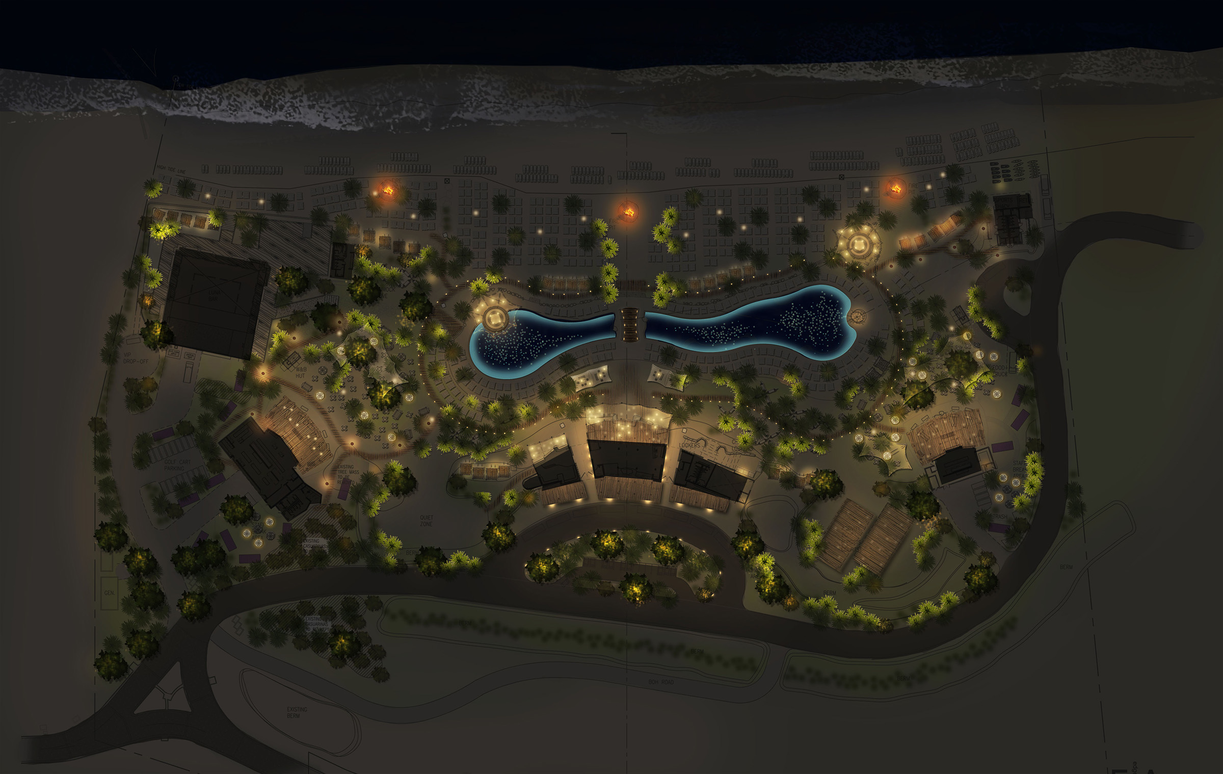 The Bimini Beach Club on the Bahamas highlights the best of beach life, taking inspiration from the most sought-after beach destinations around the world. The lighting is layered and textured to amplify this docked experience, with small-scale fixtures ranging from fire pits to torches.