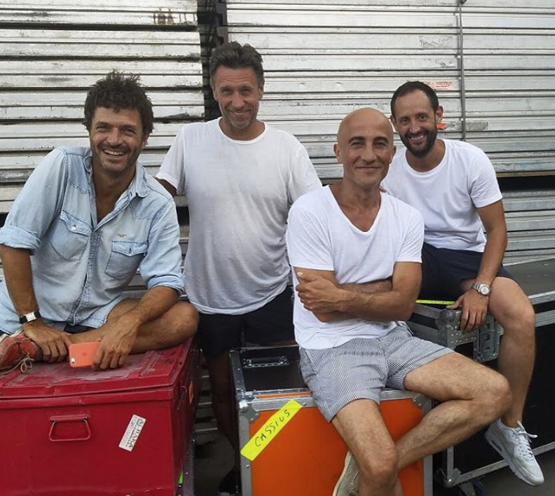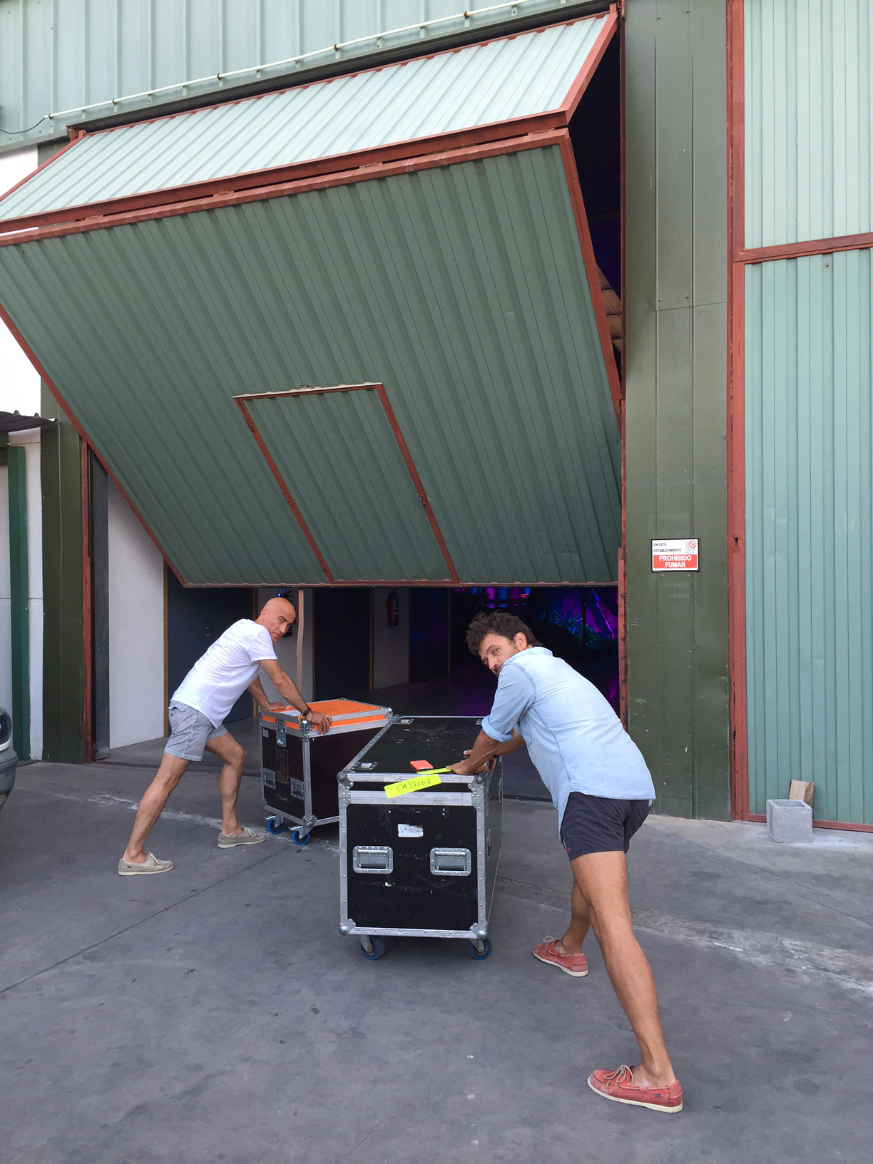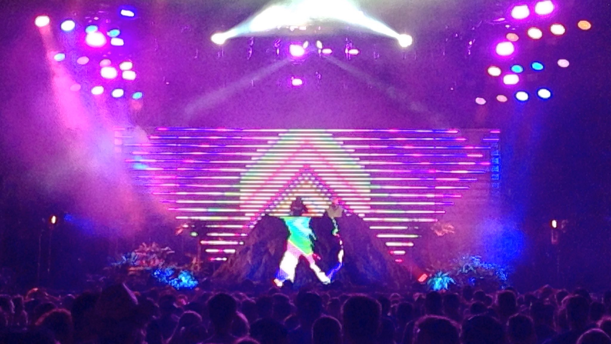 Mimicking the effect of lava travelling down the face of a volcano, a series of billowing LED lights cascade toward the floor in neon colored gradients. Behind the performers, a three-part screen reveals horizontal bars of light that produce minimal interpretations of Ibifornia’s rising sun–occasionally undulating from its center, perfectly synchronized with the changes in each composition. In the spirit of classic stage-lighting, L’Observatoire carefully balances roaming beams with more eccentric clusters of “falling” light, creating the illusion of naturally occurring phenomena on stage.