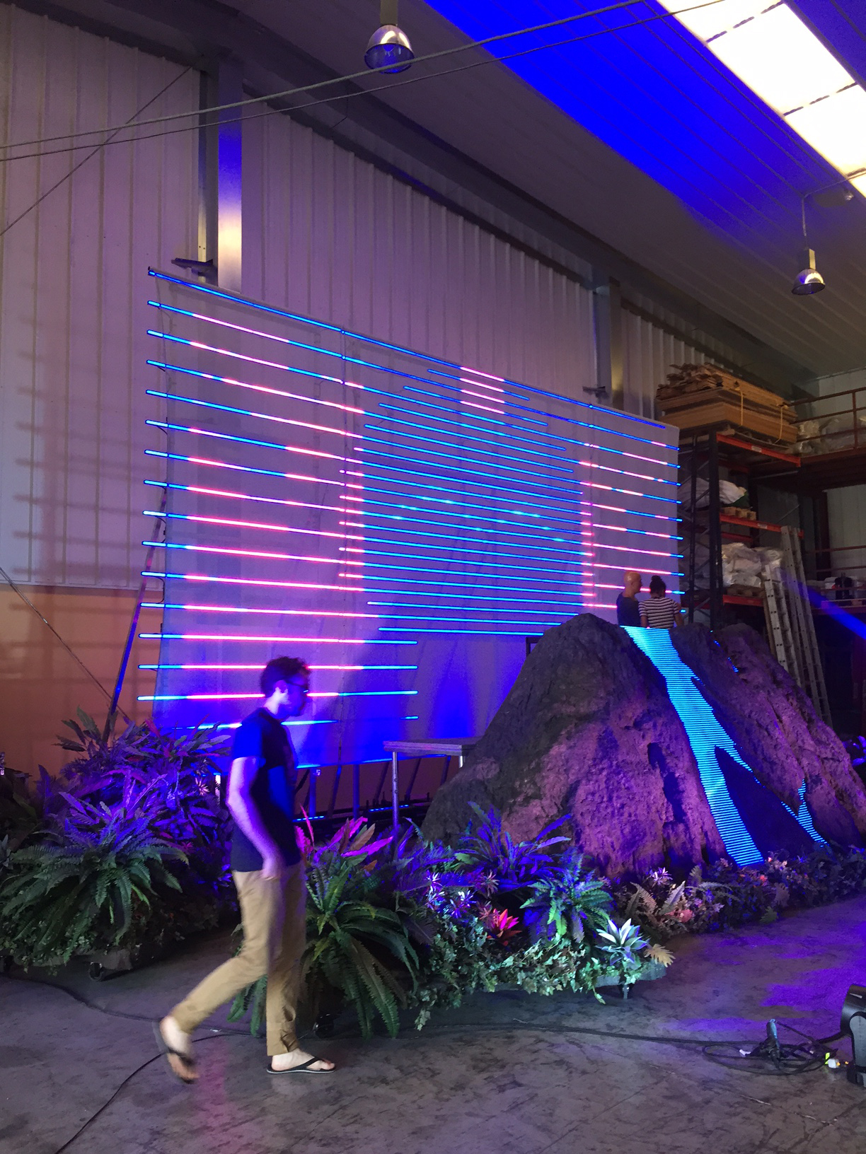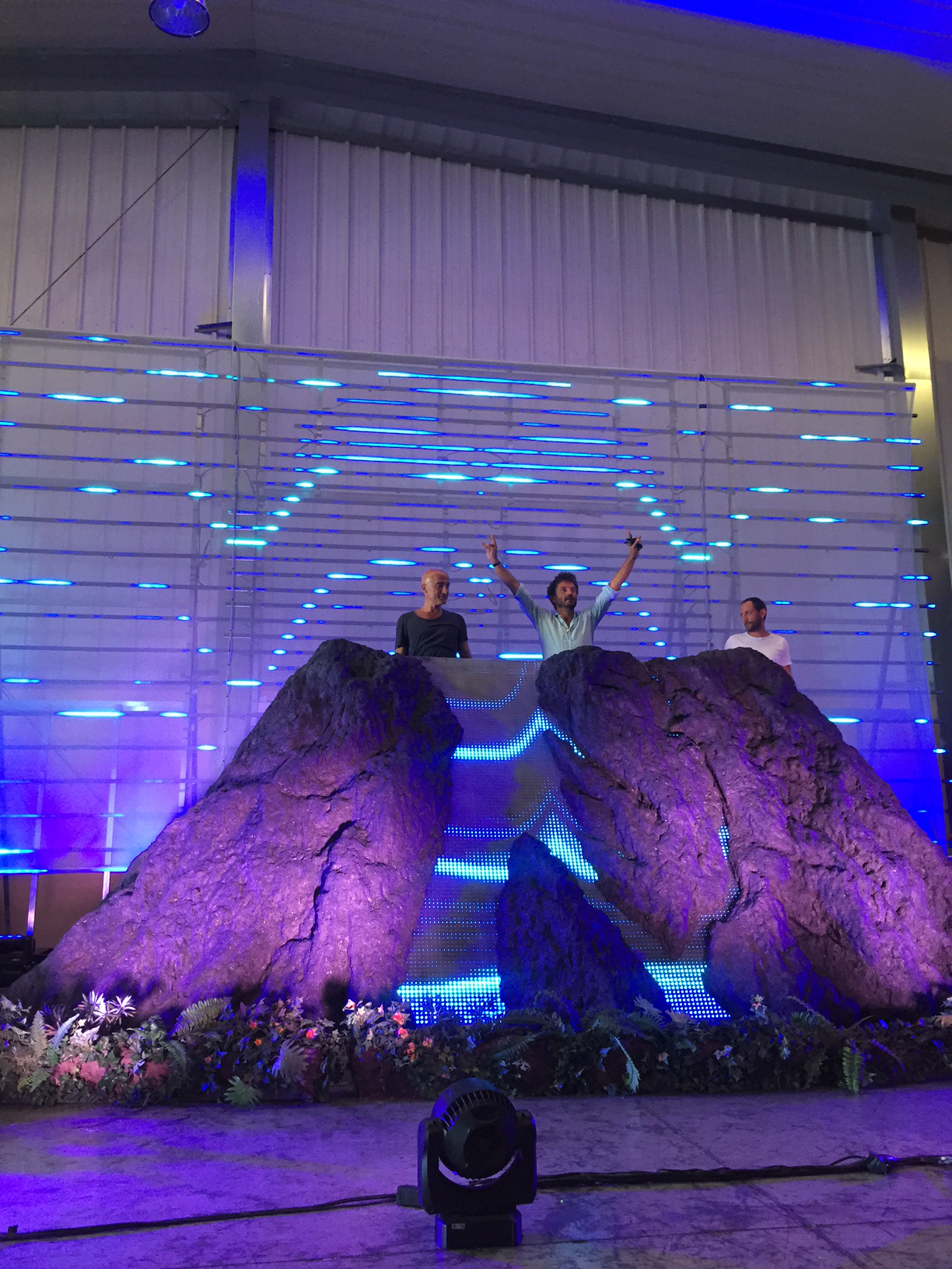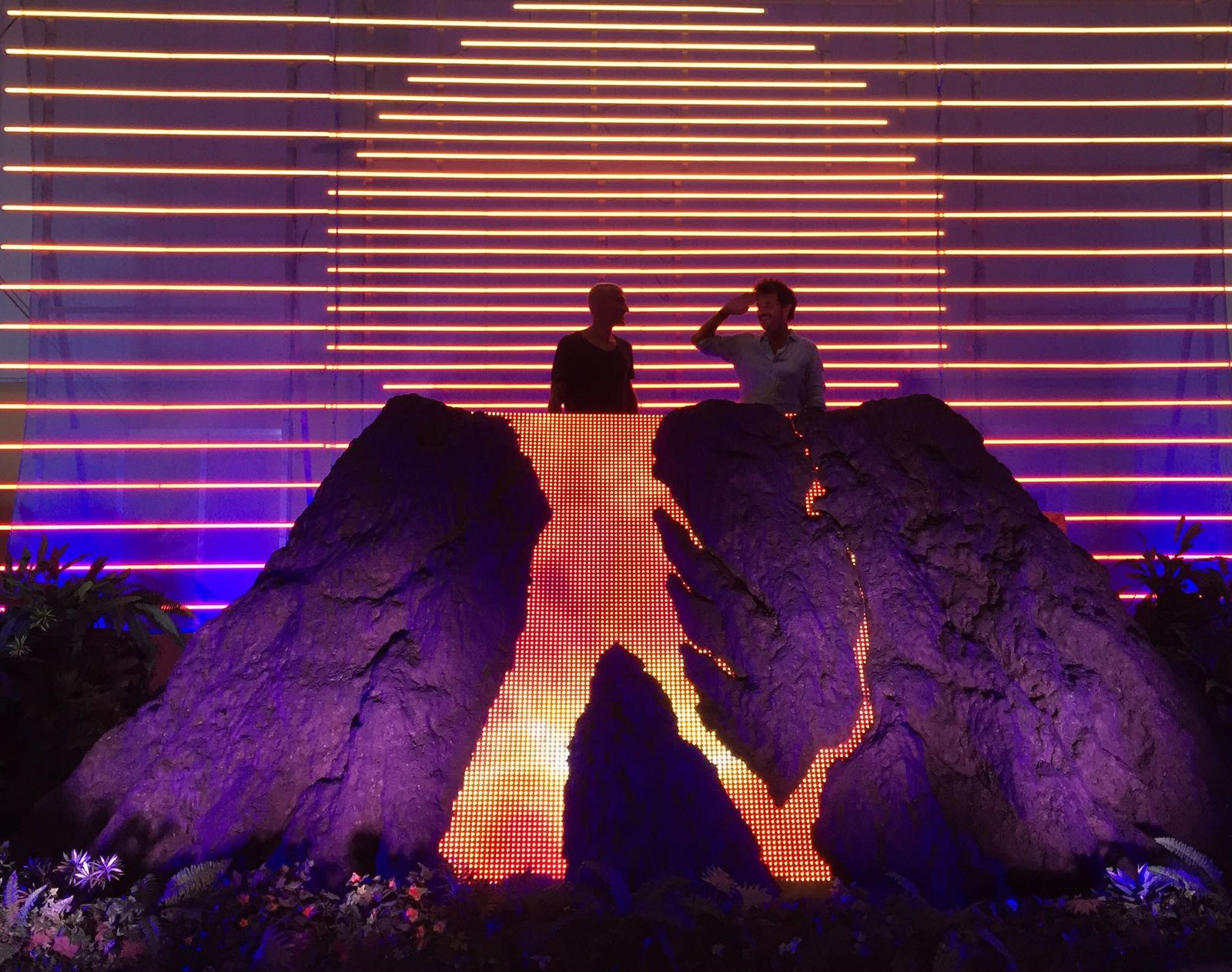 In 2016, L’Observatoire International collaborated with French musical duo Cassius to develop animated stage lighting for their Ibifornia tour. A contraction of Ibiza and California, Ibifornia is described by the DJs as “a place where the sun rises high and the horses run free.” Reminiscent of Ibiza’s neighboring mythical island of Es Vedrà, the performance area is comprised of a large sculptural volcano from which the group performs. Imaginative flora made up of brightly colored flowers and tropical ferns fill the stage, creating a distinctive contrast between the blue, yellow, and magenta tones of the lighting scheme.
