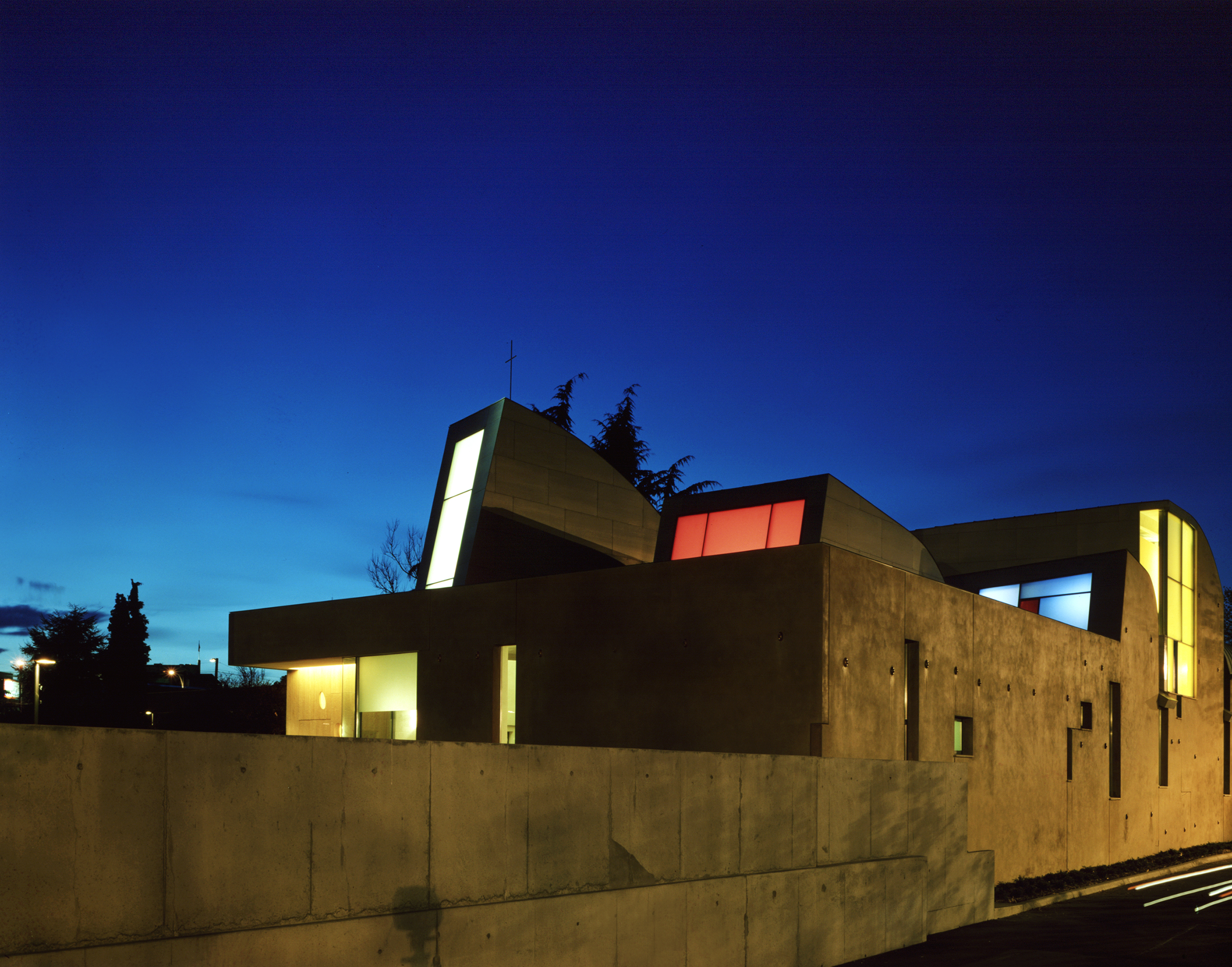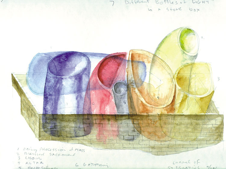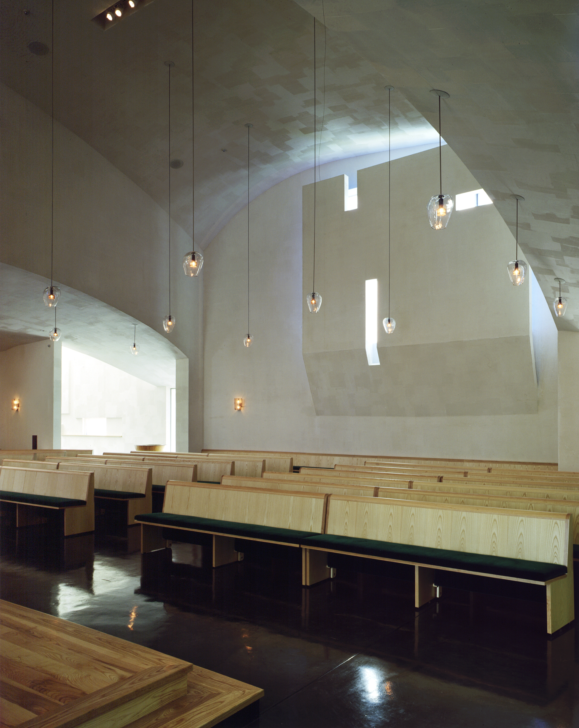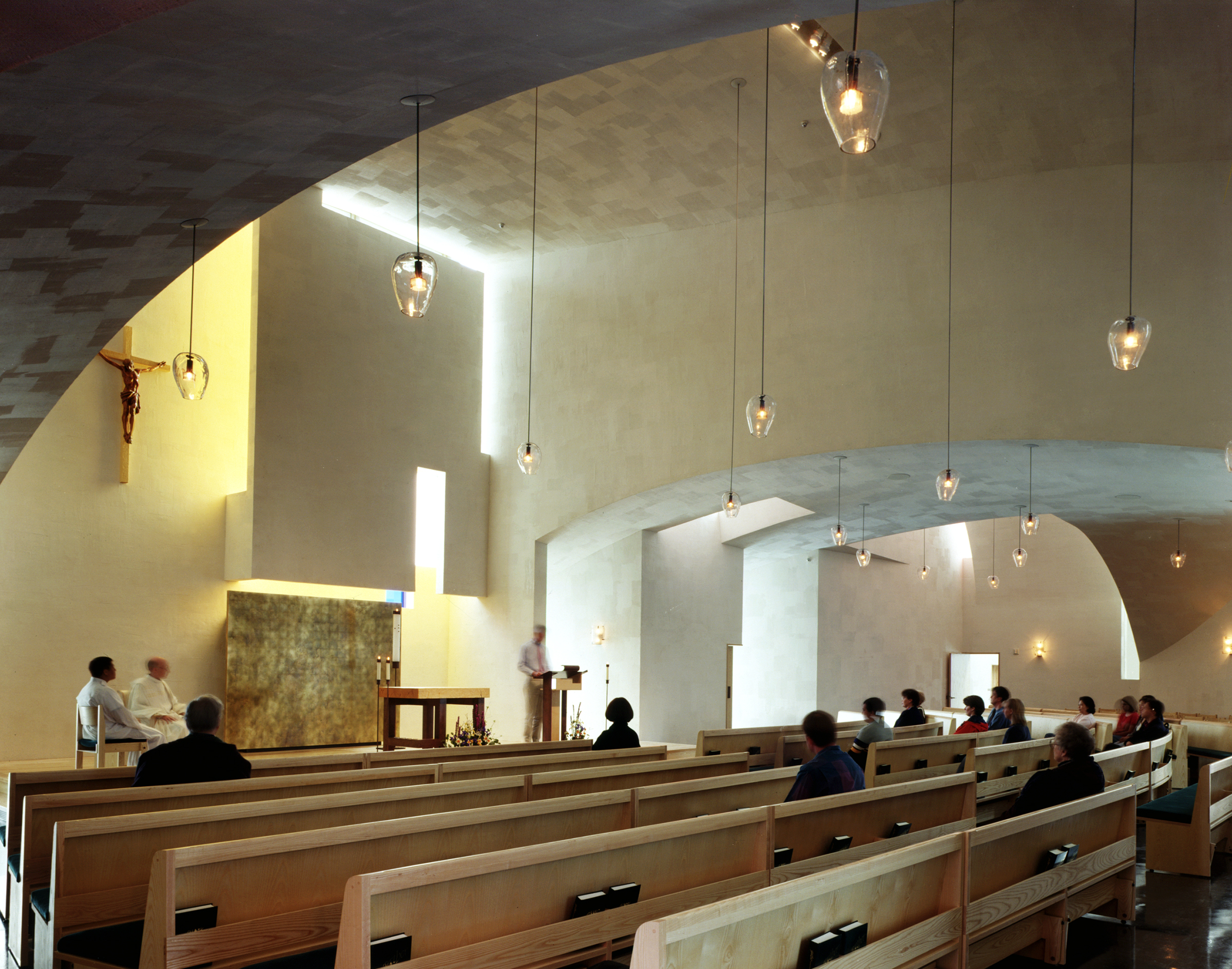 The concept of this Jesuit chapel, situated at both the literal and figurative heart of the downtown Seattle University campus, is as a “gathering of different lights”–relating to both the different people who come to the university as well as the different liturgical elements of the Jesuit ceremony. All harks back to St. Ignatius’s founding words: “A light must come down from above.”