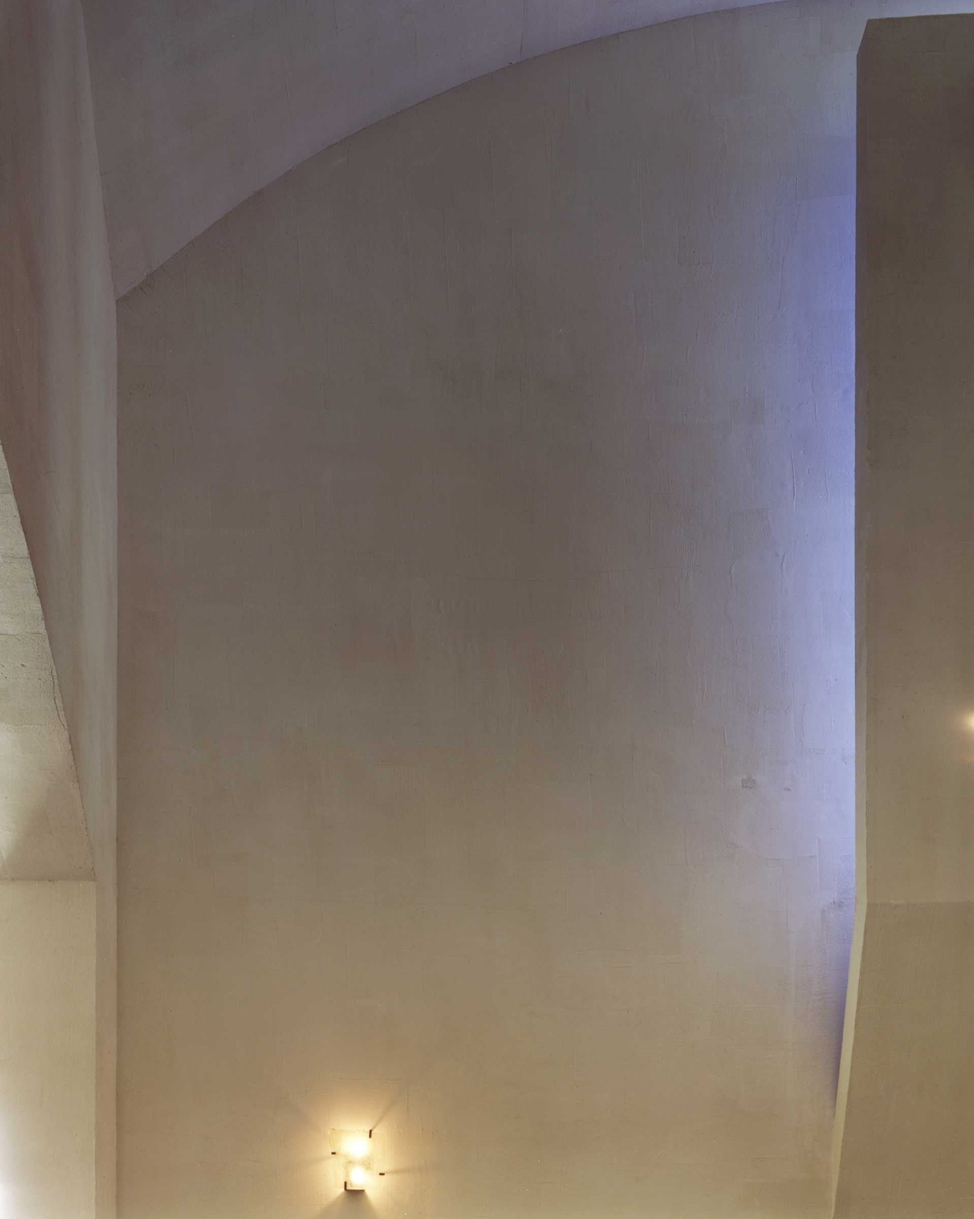 As a space designed for reflection and meditation, the lighting concept engages an intentionally serene mood. Here, the lighting concept responds to architect Steven Holl’s notion of “Seven Bottles of Light in a Stone Box,” in which each light corresponds to an aspect of Jesuit Catholic worship. This effect is realized through lighting embedded behind baffles, reflecting colored surfaces to create a colored glow. In addition, suspended fixtures and wall sconces designed by Holl dim to emulate the warmth of candlelight.