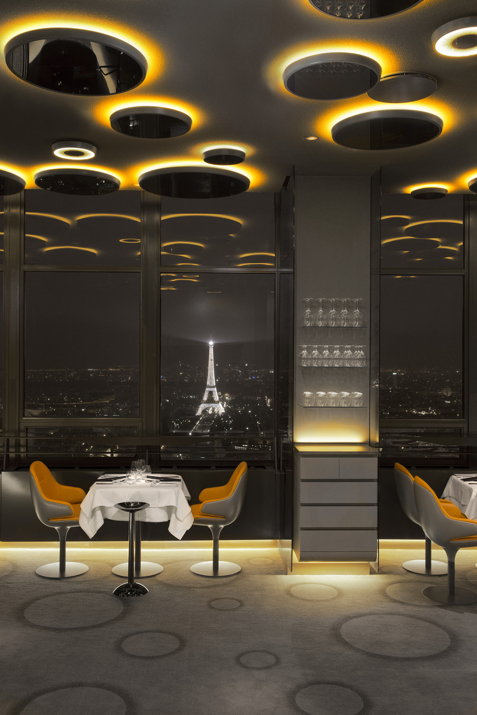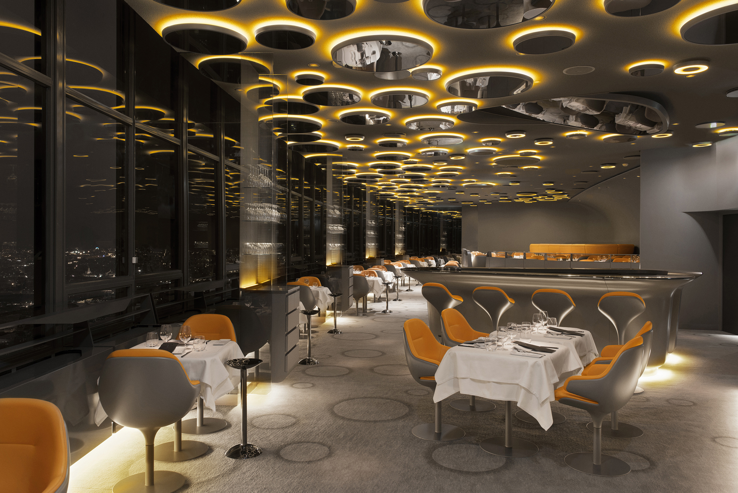 This beautiful metropolitan restaurant plays with visuality in an arresting manner. Starting with a stark exterior, diners enter into an ethereal space. The ceiling was designed with reflection in mind. The backlit ceiling mirrors reflect the city streets and give the restaurant a liquid effect. All other lighting is kept below the railing, generating a warm, yet chic, atmosphere. The largest challenge arose in the reflection of light on the windows at nighttime. The restaurant is raised 190m above the city, and overly bright lights would create a ruinous glare. This problem was solved by the inventive use of lights and mirrors. The space uses 2200k amber temperature lamps to subtly highlight the mirrored ceiling fixtures. Some are lined with linear LEDs, leading them to disappear into the ceiling. Others are mounted under a fixture, making them “float”. While the lights were initially designed only for night use, they proved so popular that they are now left on in daylight. Fortunately, LEDs are cost effective and easily maintained. While a mixture of LED and halogen dichroic lights are used, the halogen lights are steadily dimmed throughout the night to the point where they consume barely more energy than an LED. Daytime dining affords guests a flawless view, free of glare and with low contrast. The honey lamp color is an integral part of the composition, and was developed in collaboration with the interior designer. The color LEDs and mirrored fixtures give the restaurant a distinctive feel. By working with visual effects, the lighting designers realized a restaurant with a beautiful view, inside and out. The fluidity, warmth, and elegance of the space turn an ordinary night out into a sublime experience.