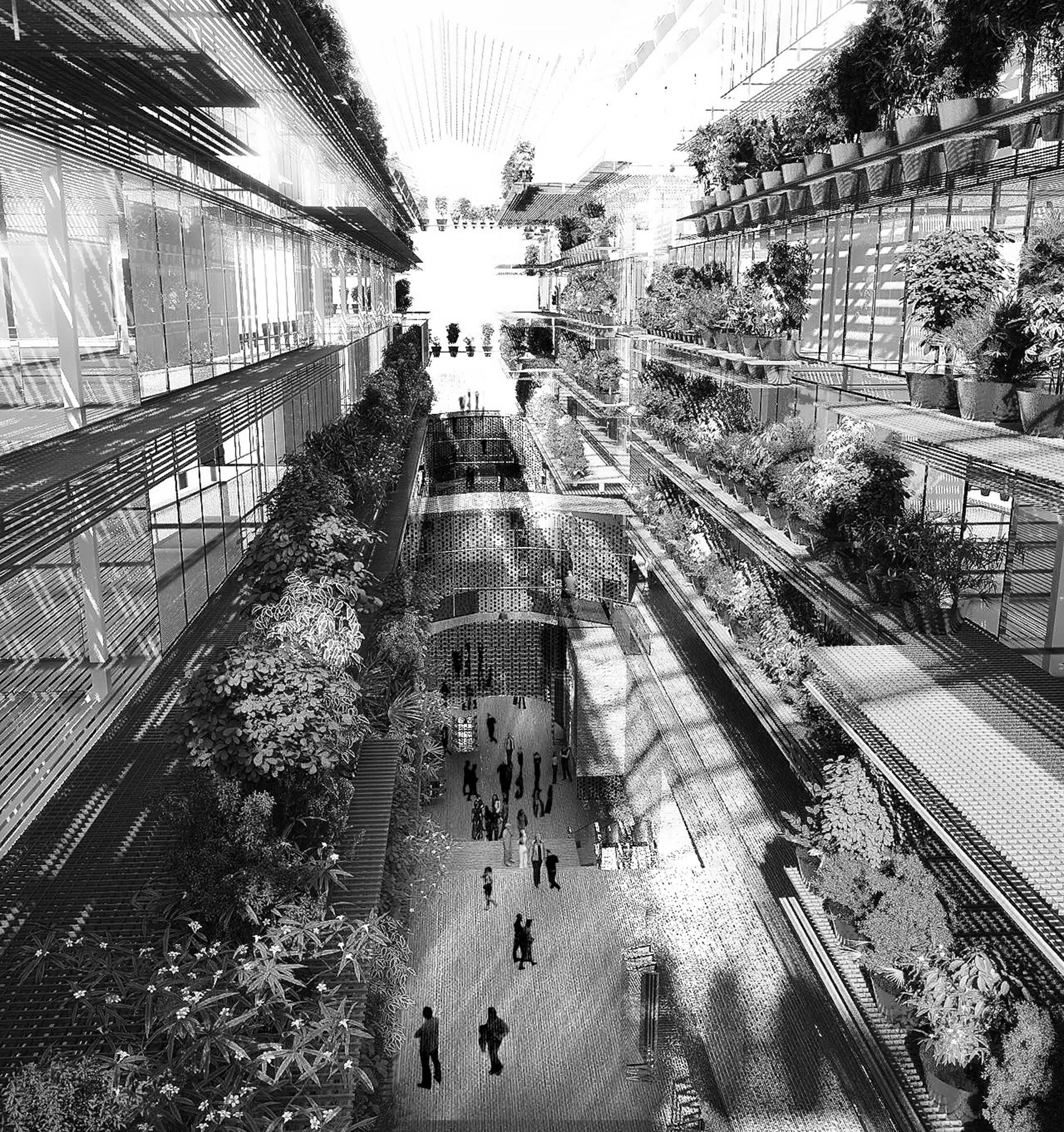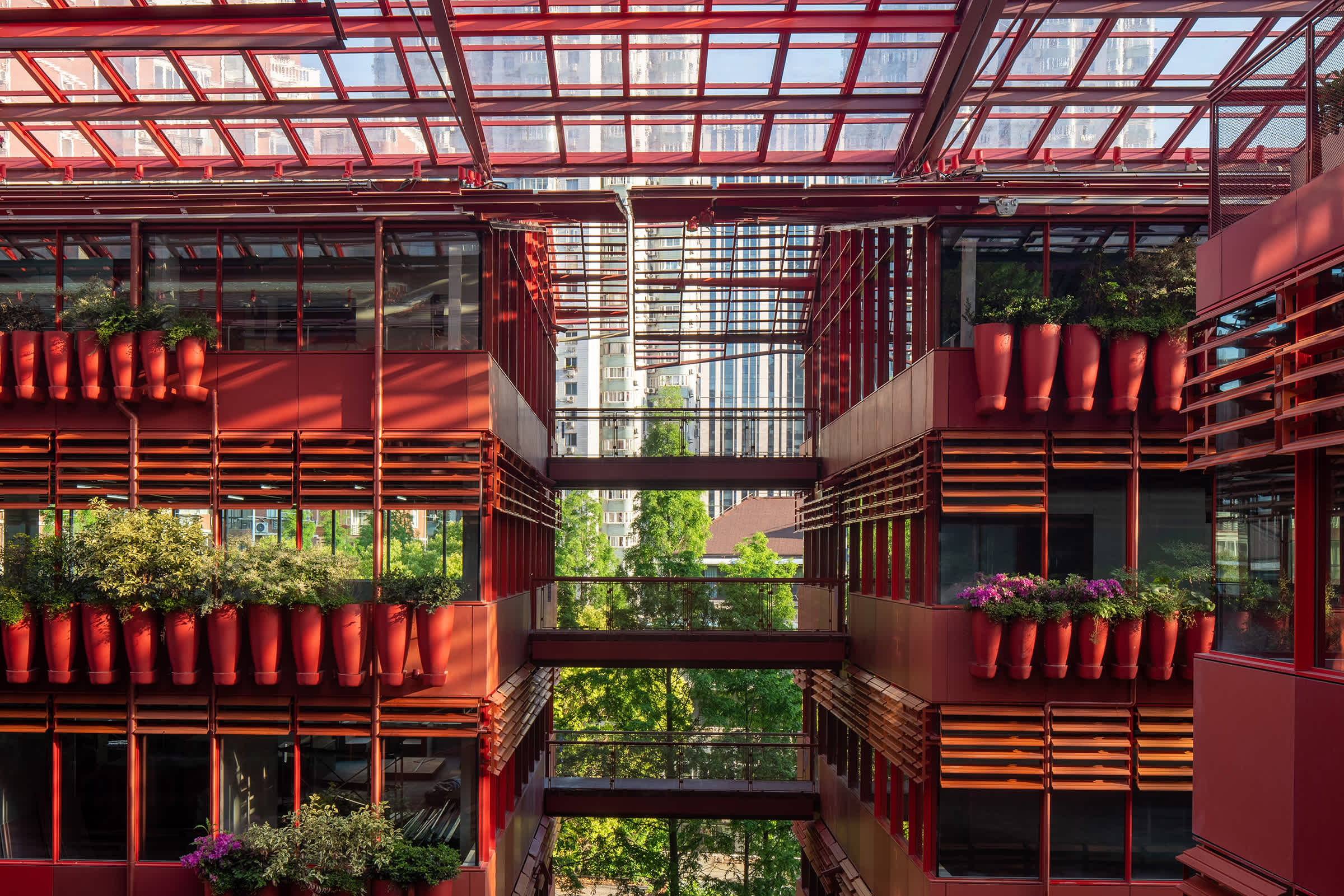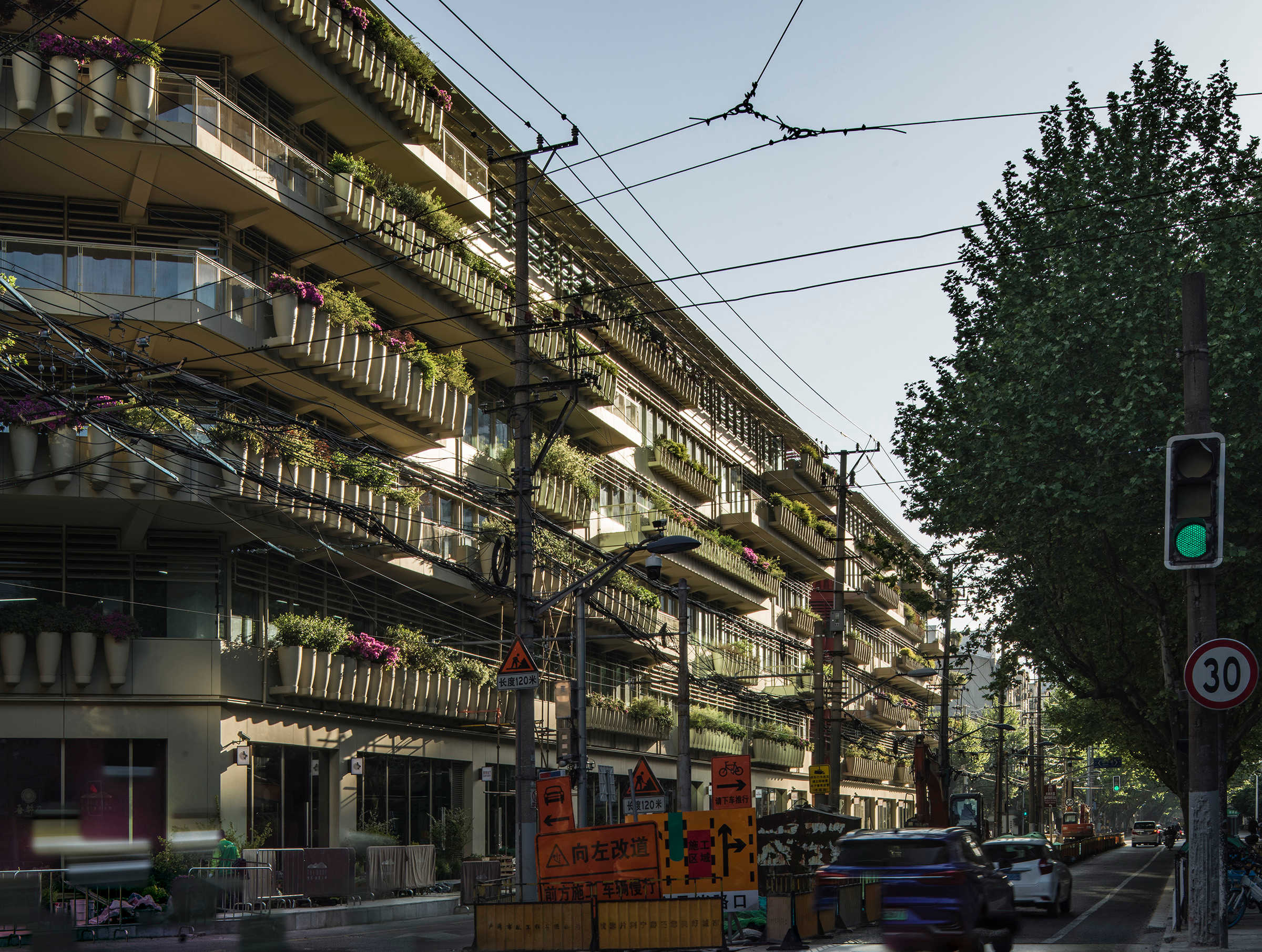 The exterior, in a grayish-beige color, offers glimpses through the two entrances on Ma Dang and Dan Shui streets of a surprising array of lights, colors, and vegetation. A shopping street on two levels, sequenced by overhead walkways and small bridges, is submerged between two flowery walls made up of rows of earthenware jars planted with different species, both green and colored. The complementarity between the shops facing each other and the activities of the offices and the restaurants up under the roofs creates a familiar, naturally animated street––setting pleasing walks as a target and offering an inviting itinerary between Ma Dang and Dan Shui.