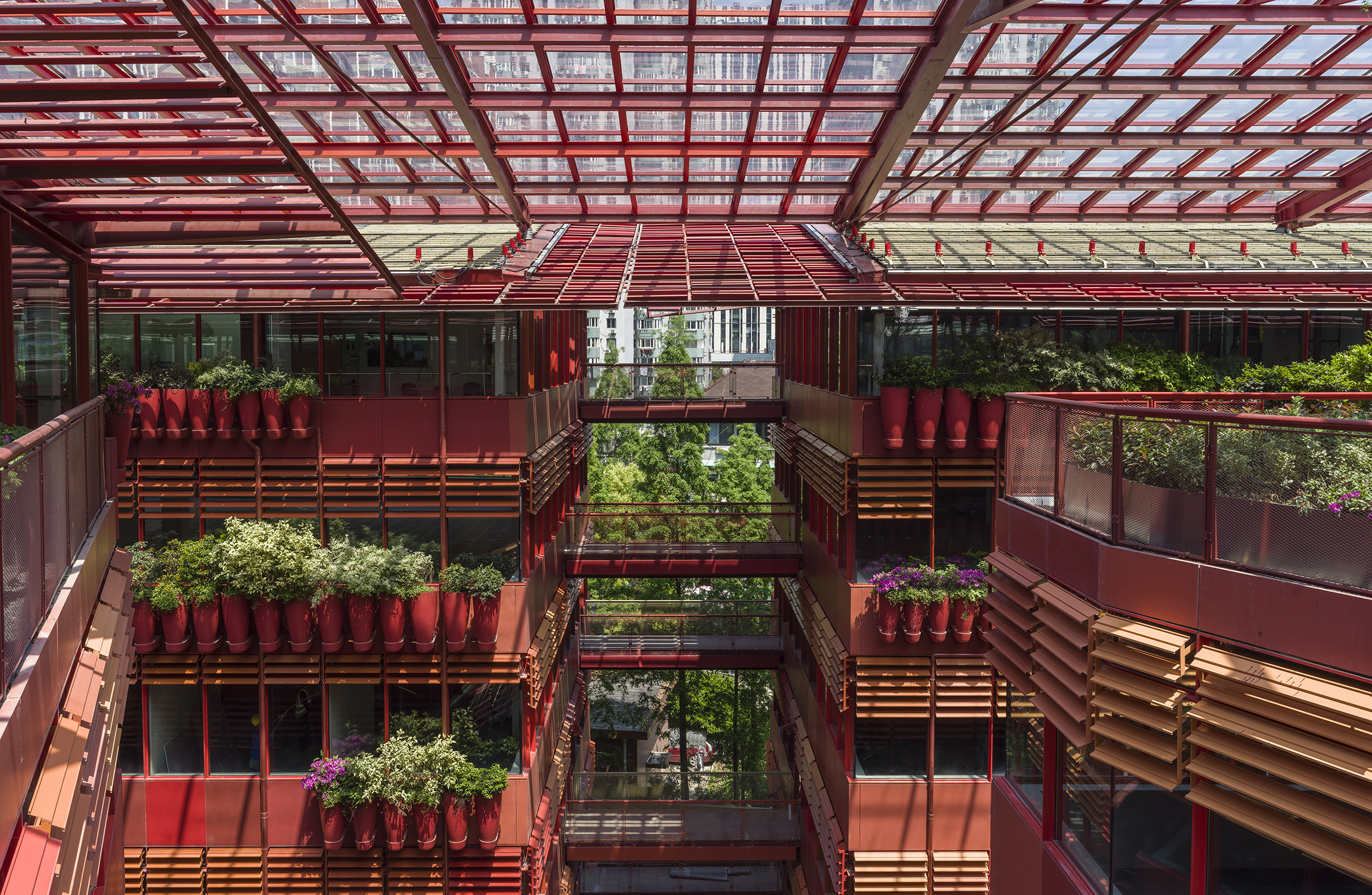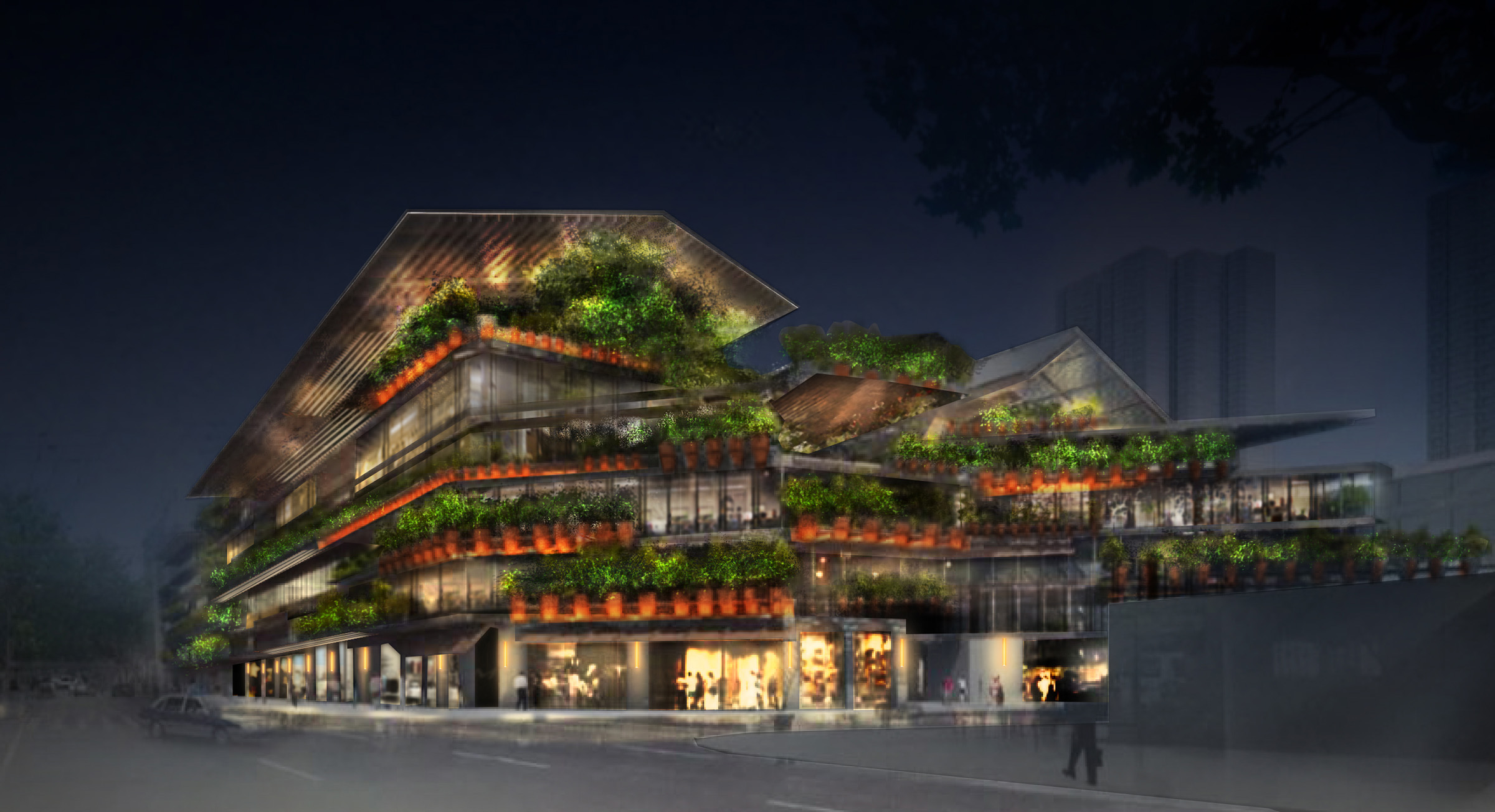 The exterior, in a grayish-beige color, offers glimpses through the two entrances on Ma Dang and Dan Shui streets of a surprising array of lights, colors, and vegetation. A shopping street on two levels, sequenced by overhead walkways and small bridges, is submerged between two flowery walls made up of rows of earthenware jars planted with different species, both green and colored. The complementarity between the shops facing each other and the activities of the offices and the restaurants up under the roofs creates a familiar, naturally animated street––setting pleasing walks as a target and offering an inviting itinerary between Ma Dang and Dan Shui.