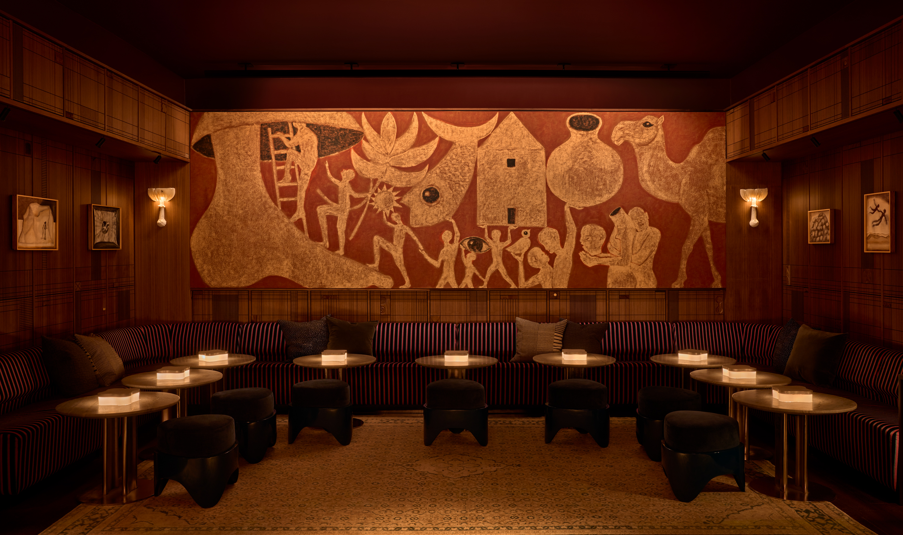 Clemente's vibrant murals, awash in shades of rust, black, and gold, envelop the space. The lighting design ensures these artworks are not merely viewed, but experienced. Subtle illumination brings their intricate details to life, drawing guests into the art itself.