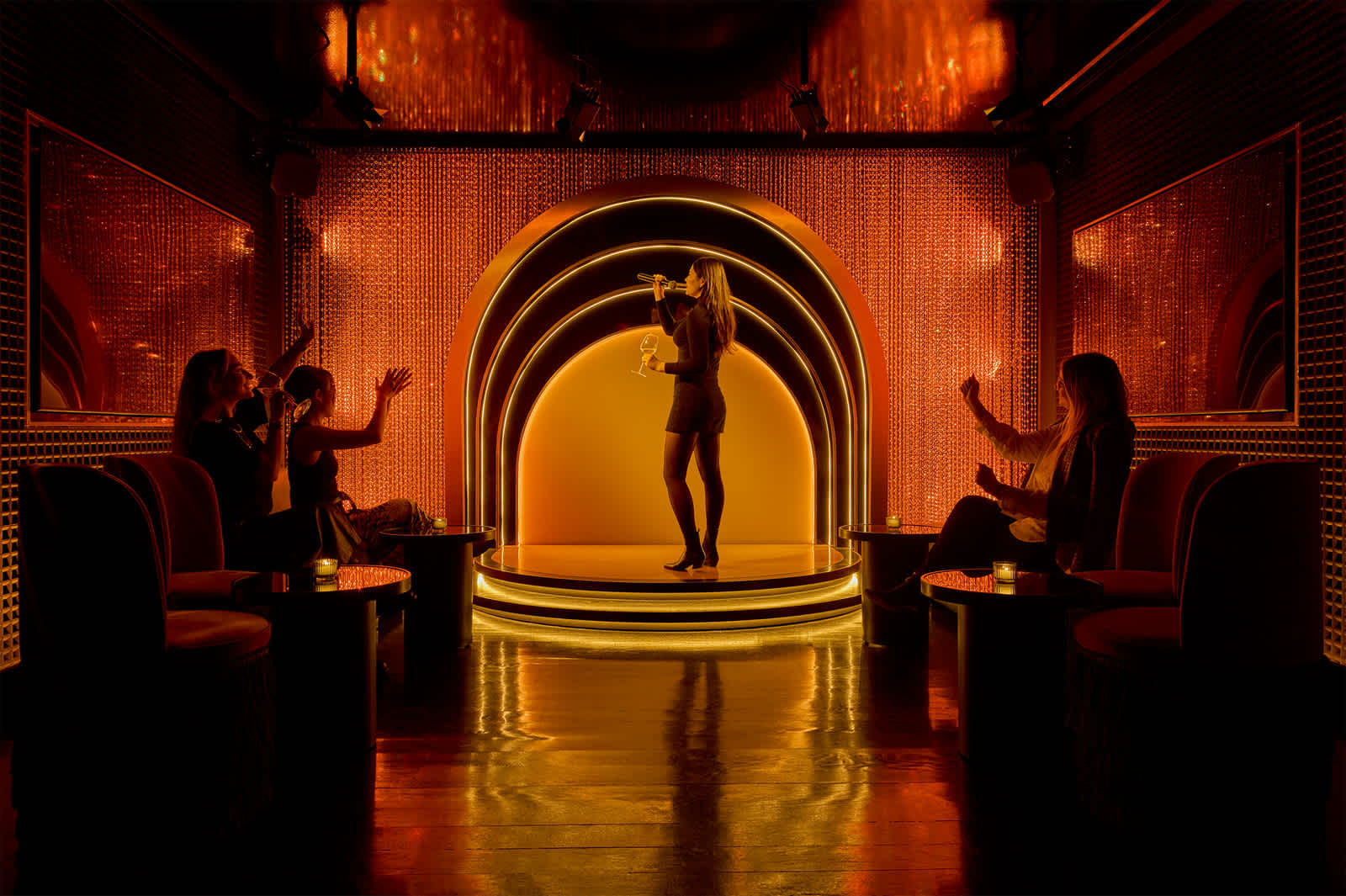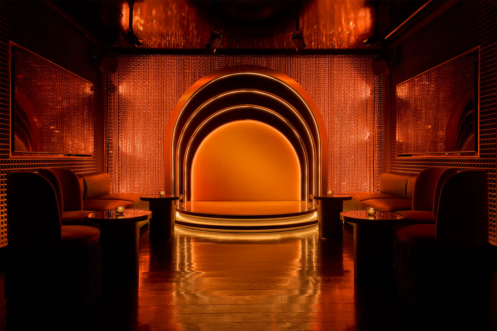 The flow of the dining room is accentuated by a series of illuminated “ghost” arches crafted from cast glass and bronze metal, providing a unique architectural touch. Theater lights positioned along the banquettes add further intrigue, while a mirrored wall at the room’s end creates a captivating infinity effect.