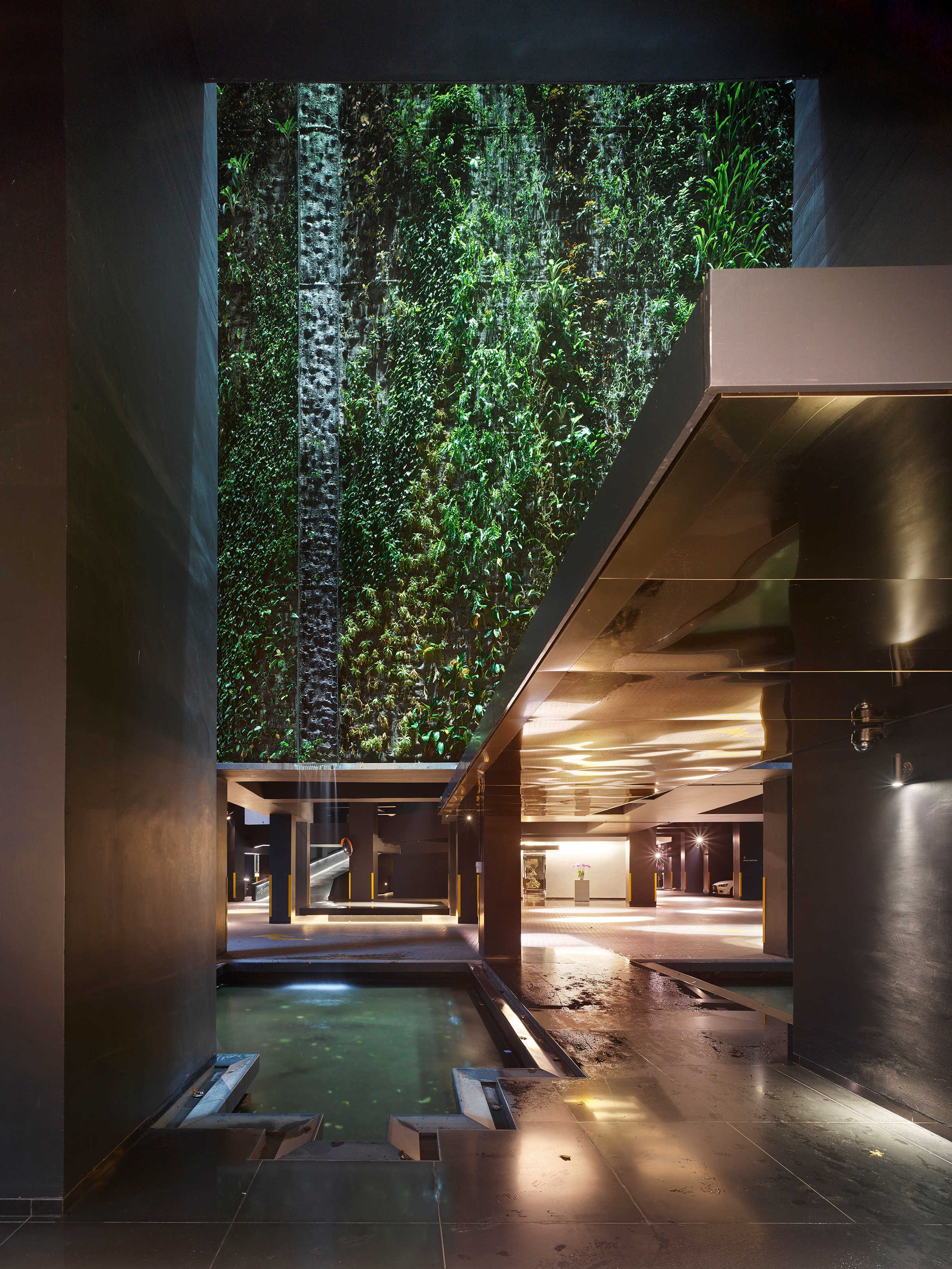Building on Nouvel's theme of infinity, the lighting serves to accentuate the verticality of the structure and suggests the notion of a never-ending tower. At the crown, a sunlight reflector and cantilevered panel of mirrors are supported by bright lights that shoot through the water of the rooftop pool to reflect off the mirrored panels. This creates a bright, shimmering glow from which all the facade lights and plants drip. Lights are also placed along the facade in a vertical pattern to create the effect of trickling and dripping down the sides of the building. Within the intricate facade design of catwalks, trellises, and plants, a spotlight is placed behind each planter and shines from the top down.