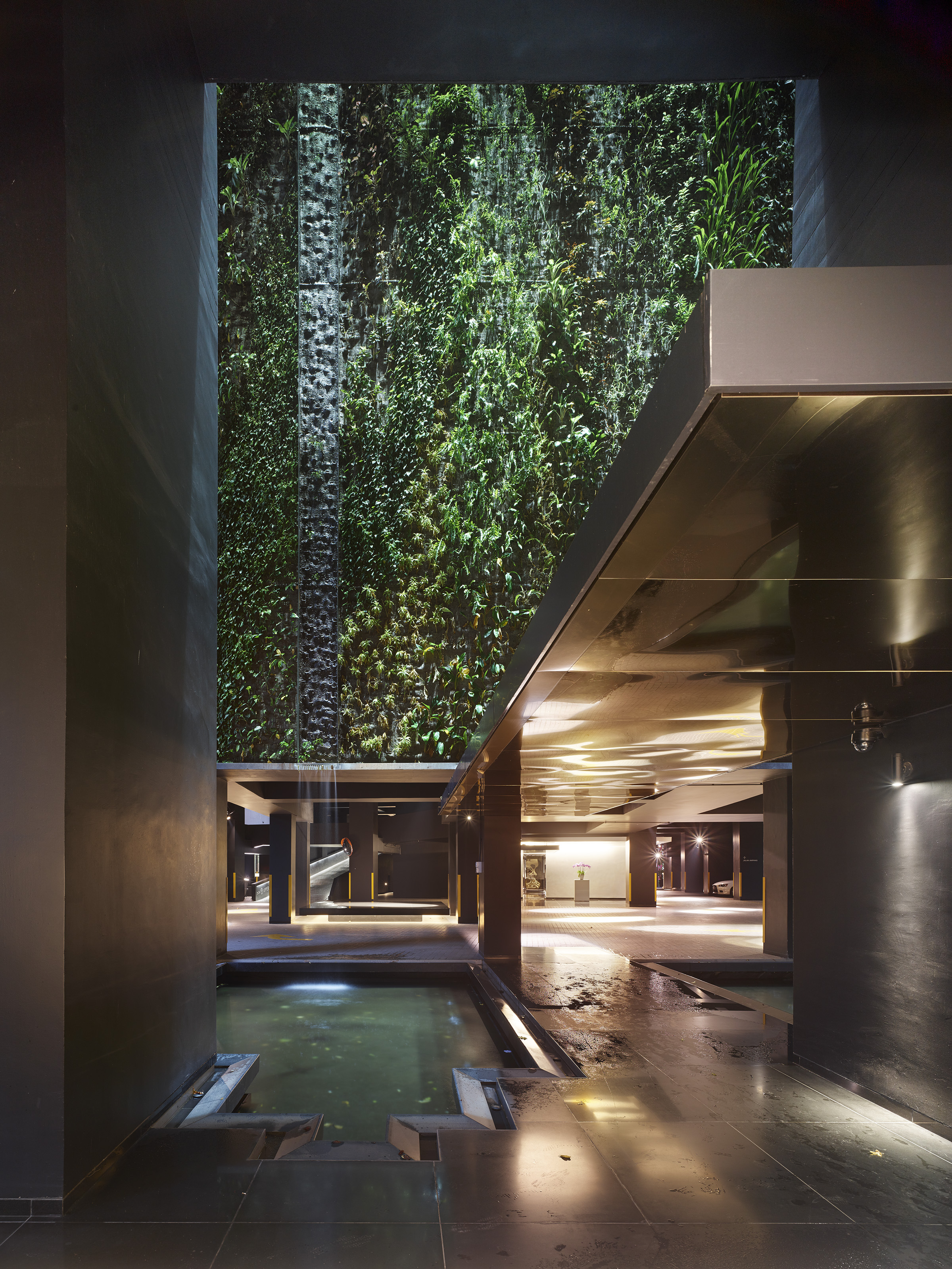 Building on Nouvel's theme of infinity, the lighting serves to accentuate the verticality of the structure and suggests the notion of a never-ending tower. At the crown, a sunlight reflector and cantilevered panel of mirrors are supported by bright lights that shoot through the water of the rooftop pool to reflect off the mirrored panels. This creates a bright, shimmering glow from which all the facade lights and plants drip. Lights are also placed along the facade in a vertical pattern to create the effect of trickling and dripping down the sides of the building. Within the intricate facade design of catwalks, trellises, and plants, a spotlight is placed behind each planter and shines from the top down.