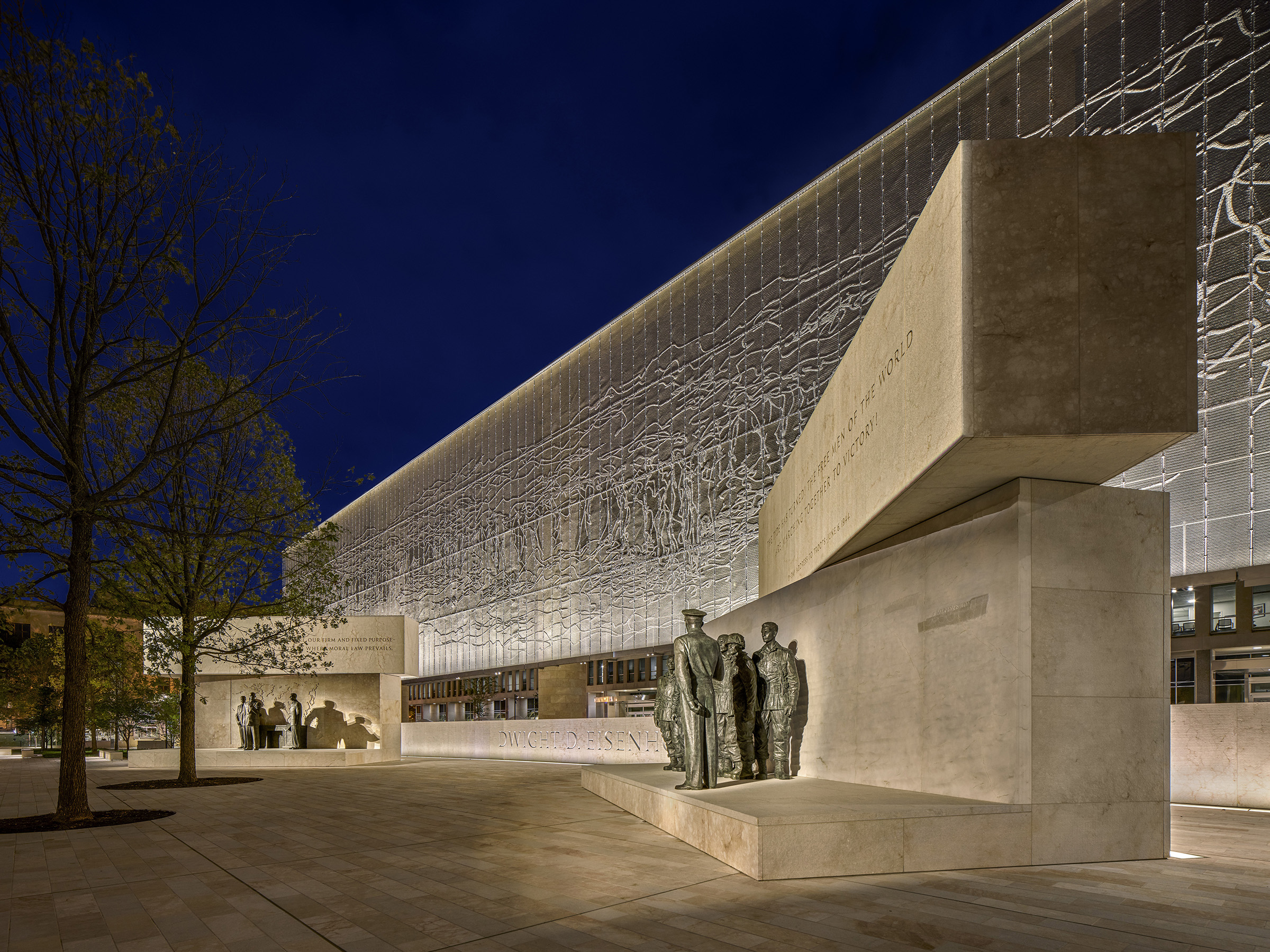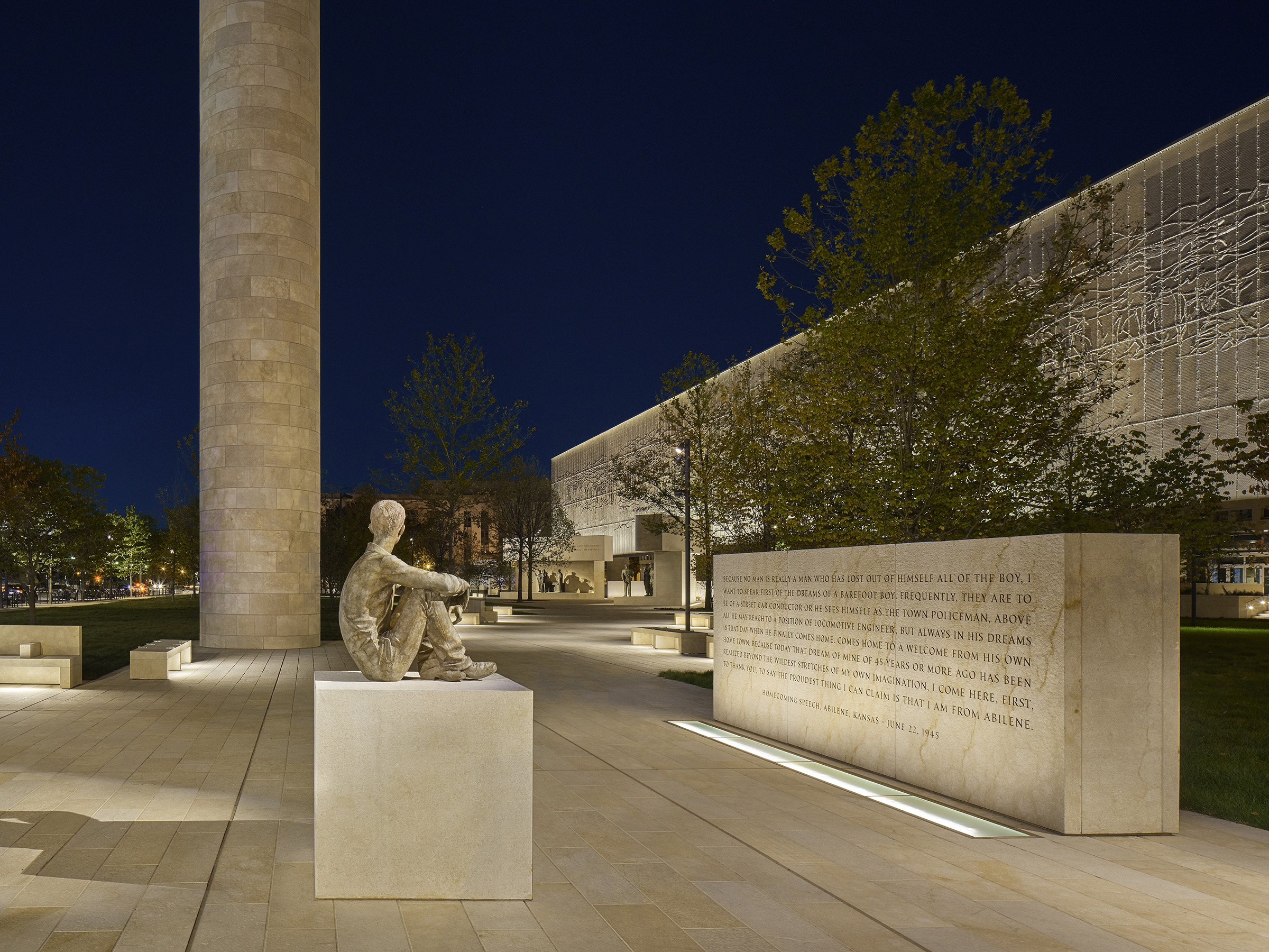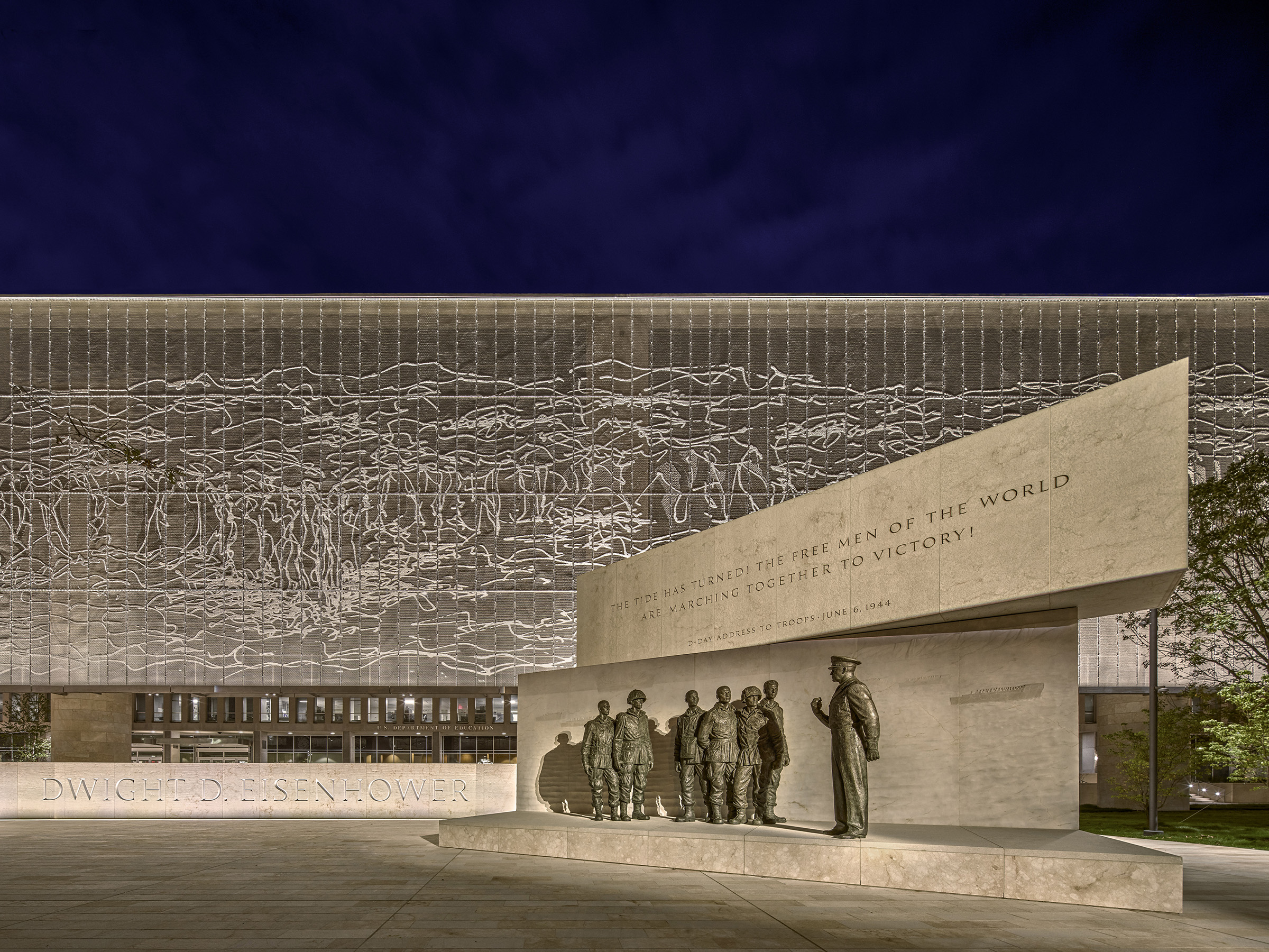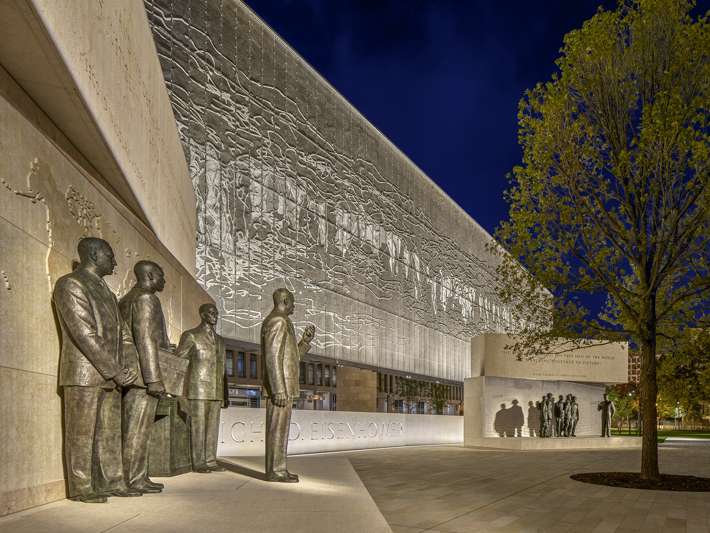 The central elements in the Memorial Core—bronze sculptures by Sergey Eylanbekov, President Eisenhower’s quotes on the inscription wall, and the tapestry screen—are lit for dramatic effect through framing projectors mounted on thirty-foot-tall poles.