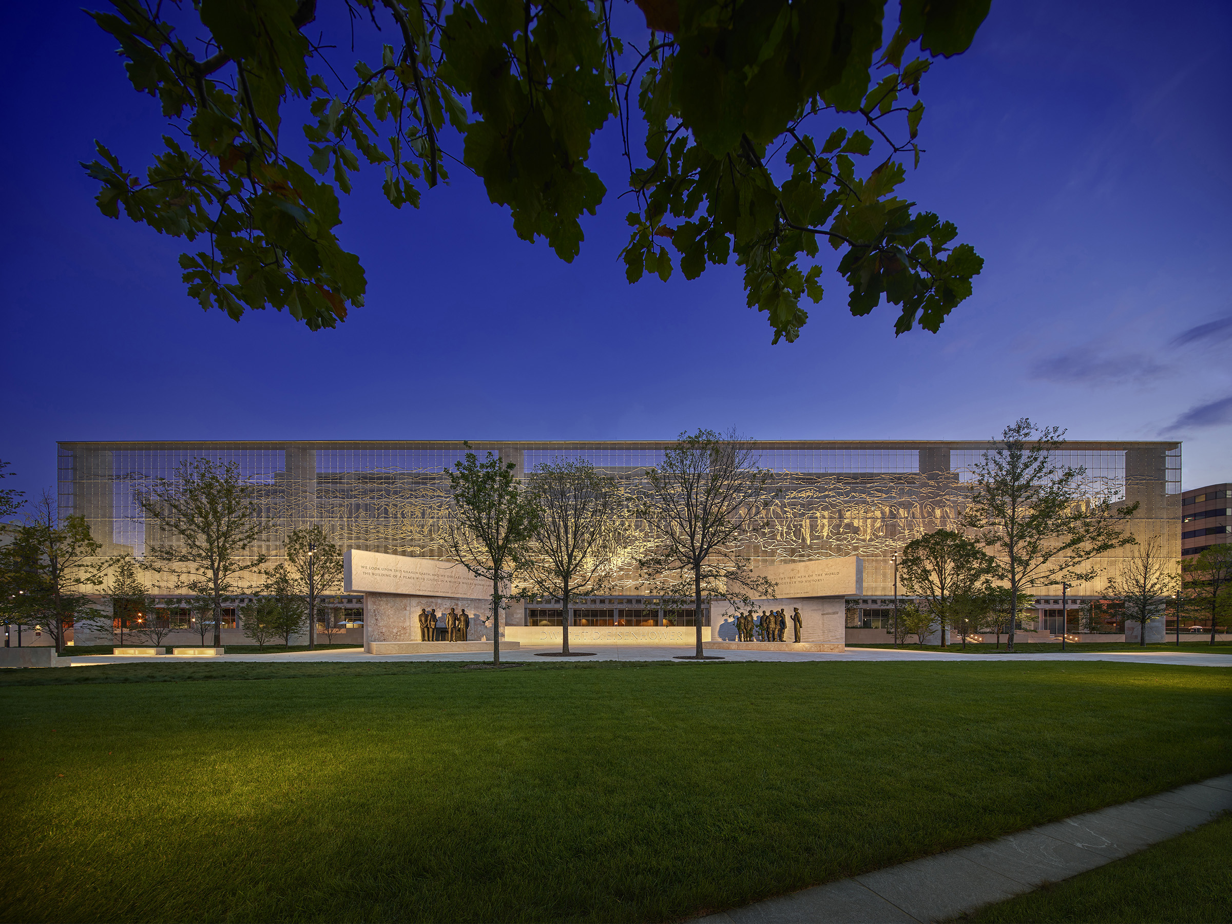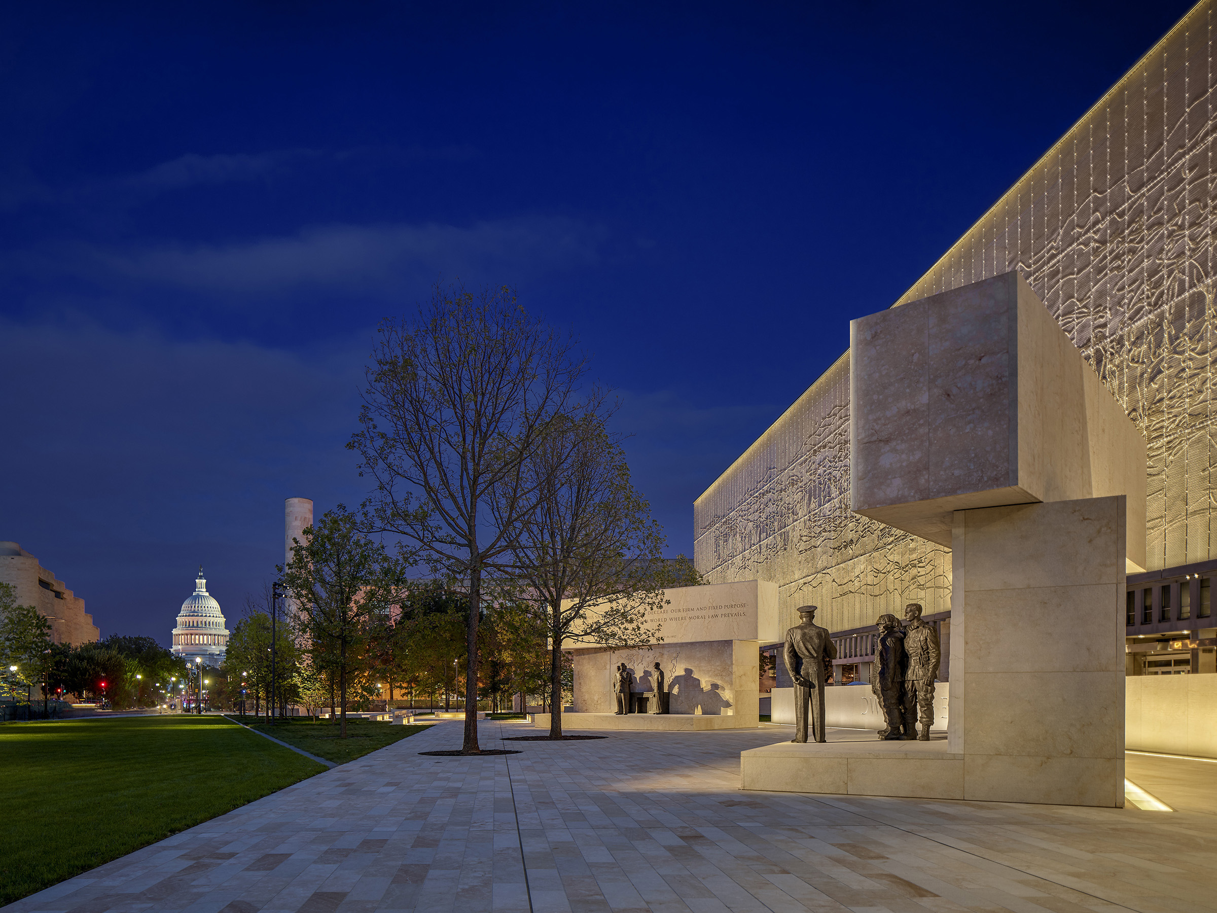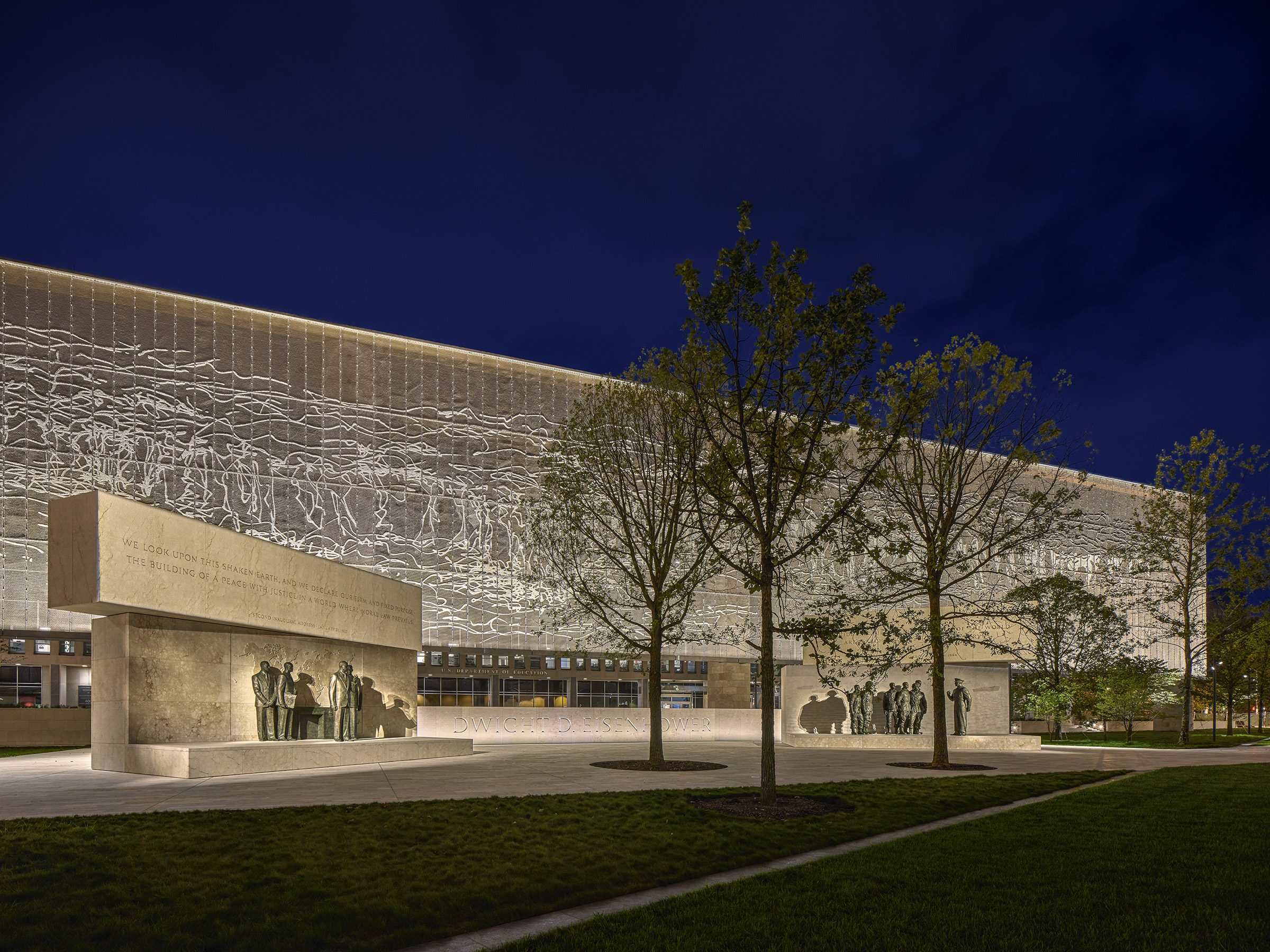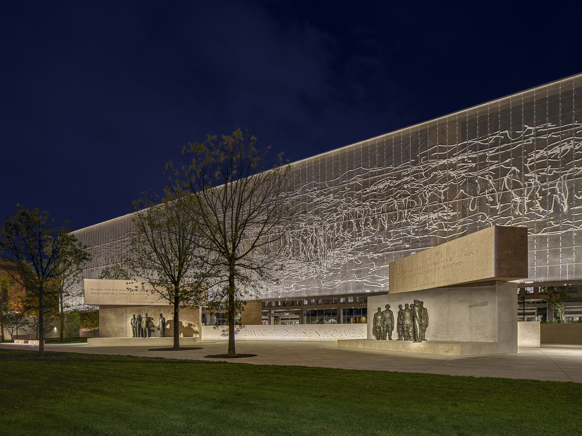 The central elements in the Memorial Core—bronze sculptures by Sergey Eylanbekov, President Eisenhower’s quotes on the inscription wall, and the tapestry screen—are lit for dramatic effect through framing projectors mounted on thirty-foot-tall poles.