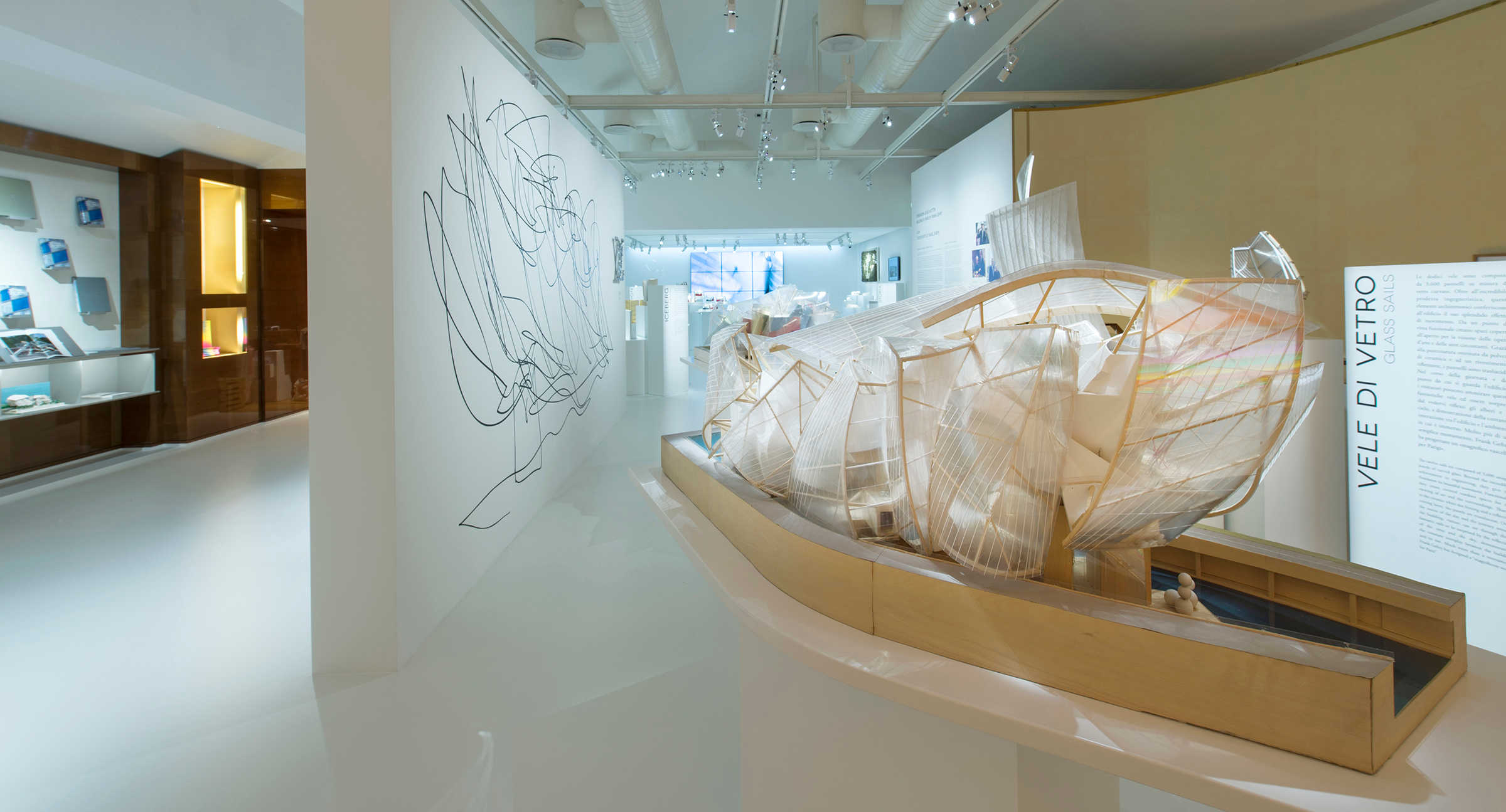 The exhibition presents a selection of scale models created during the project by the Gehry Partners Studio. They are organized by groups to retrace studies for various aspects of the building: integration in the site, architectural program, project design, interior spaces, the “icebergs” and the glass sails. Prepared at the request of Bernard Arnault, Chairman and Chief Executive Officer of the LVMH Group and Chairman of the Fondation Louis Vuitton, this exhibition was conceived by Frank Gehry’s teams in close collaboration with the Fondation. The models are grouped to evoke schools of fish, a favorite symbol of Mr. Gehry.
