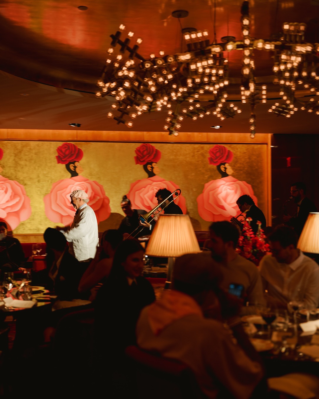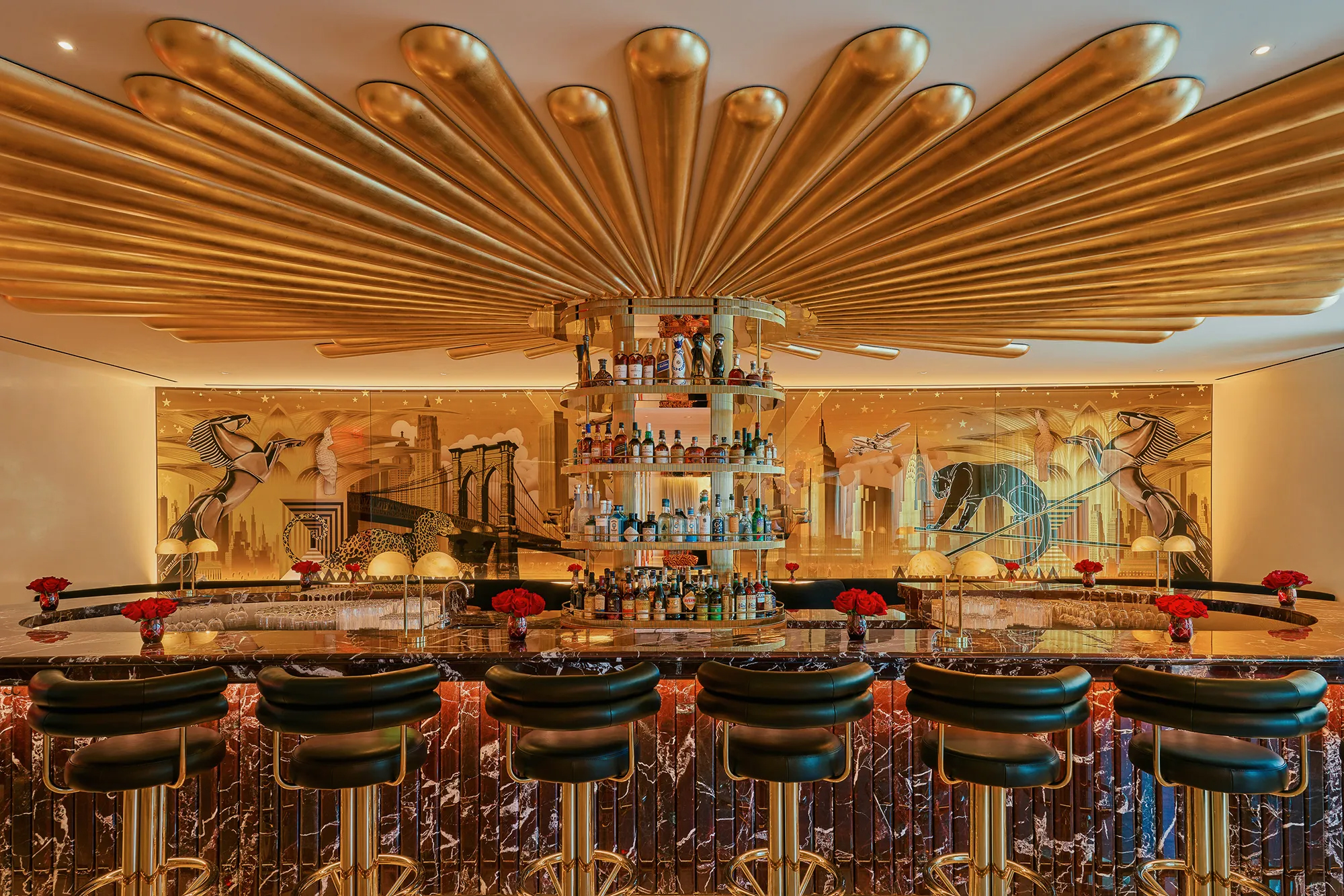 Those venturing to the second floor are met with a rich, reflective red and golden palette. The main bar glows from within: integrated millwork lighting reveals gold-leaf petals, while accent light softly grazes the banquettes and custom back wall featuring a mirrored artwork by Juan Gatti. This is not just a bar—it’s a golden stage, where every detail sparkles in perfect harmony.