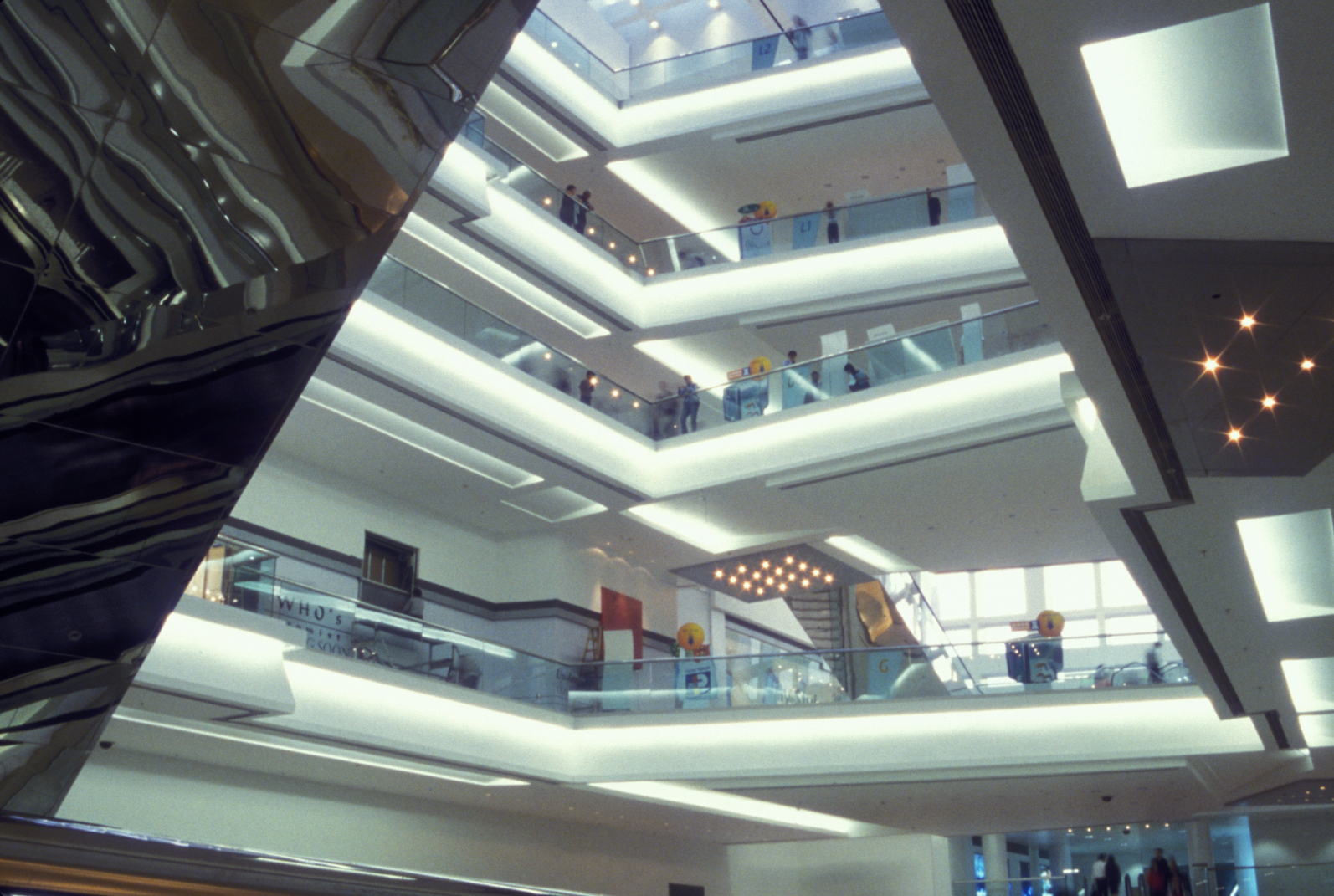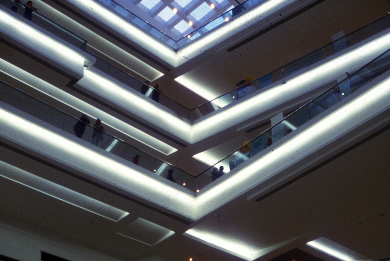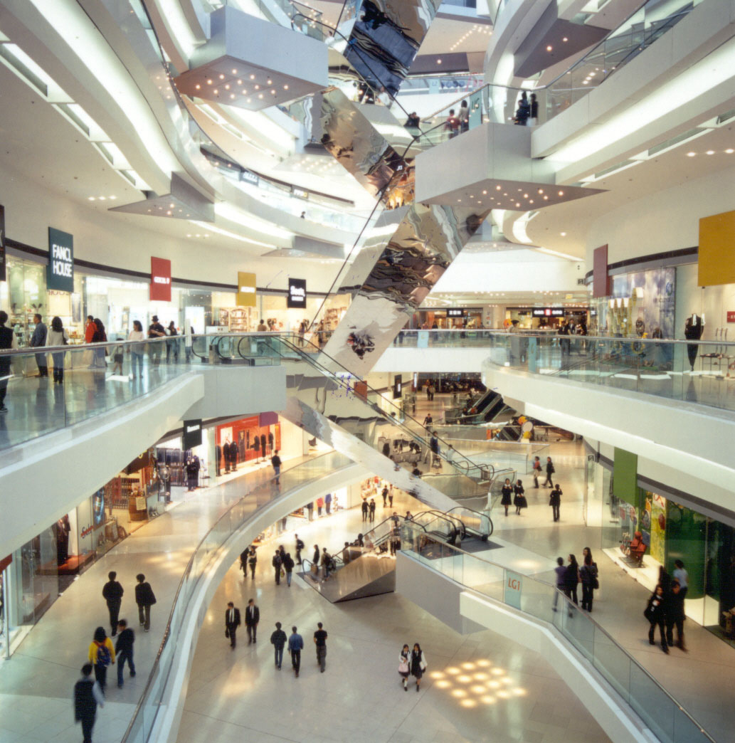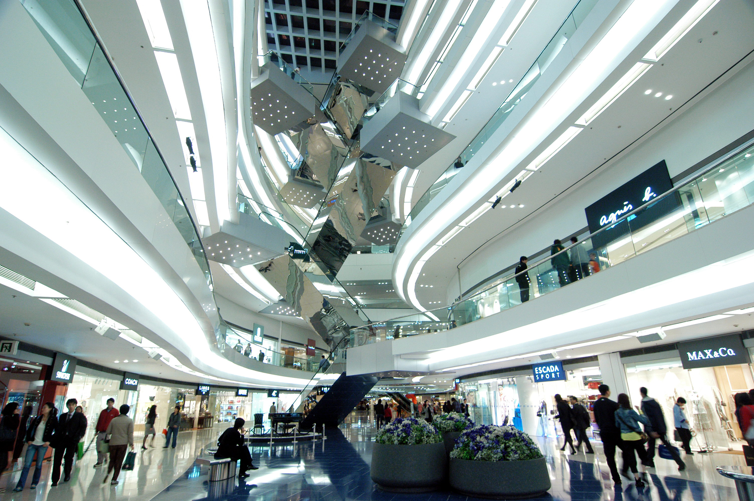 The shopping mall boasts restaurants, a cinema, and Hong Kong’s largest ice rink. Lighting brings a strong design sensibility to commercial areas executed on a large scale. The lighting concept for the shopping mall emphasizes the identity of its diverse program, as well as orientation throughout the building. Inside of the shopping mall, wave-like forms emanate light, composing a river which is identical on every floor. In addition, a canyon is devised from breaks in the ceiling which also shed light, yet their design changes on each level.