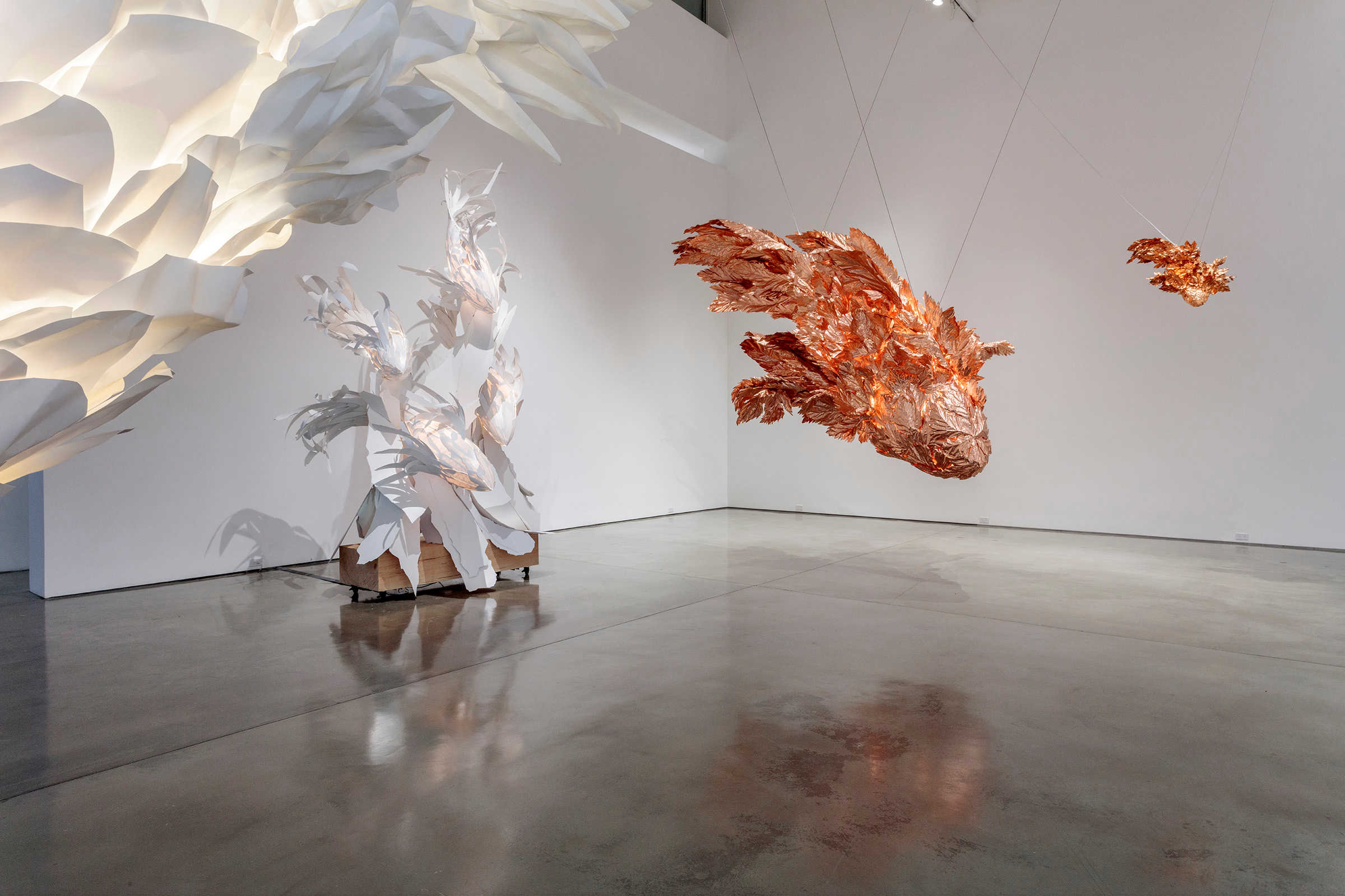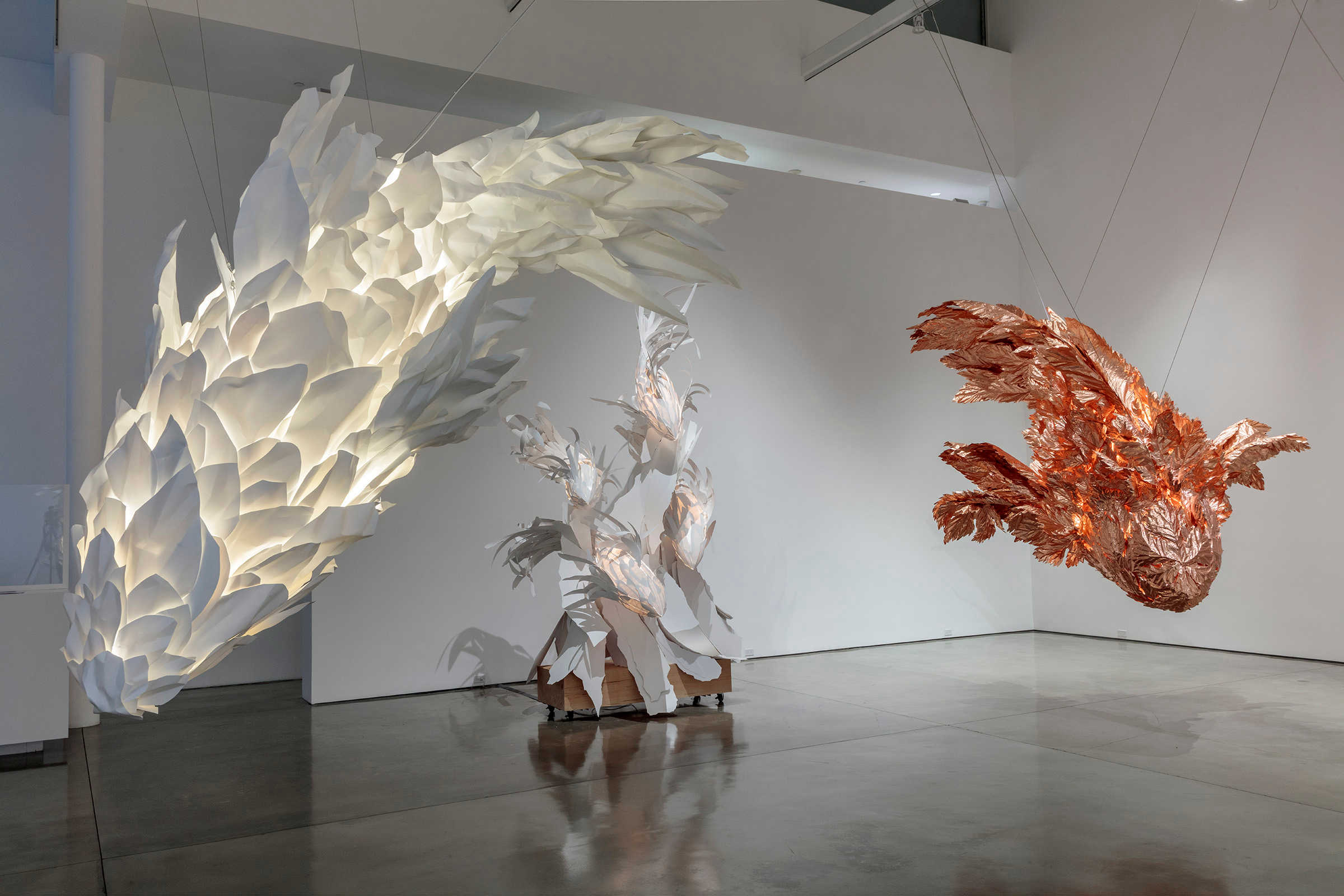 When I built the first model of the fish, I saw in it the movement that I was looking for. It was startling that a static object could express motion in such a dynamic way. —Frank Gehry Gagosian is pleased to present Spinning Tales, an exhibition of new work by renowned architect Frank Gehry. It pairs large-scale elaborations on the Fish Lamps series with a new installation, Wishful Thinking (2021), and is Gehry’s eighth exhibition with the gallery since 1999. Celebrated for his groundbreaking architectural designs, Gehry has also produced significant bodies of sculpture and furniture, from Easy Edges (1969–73) and Experimental Edges (1979–82)—chairs and tables made from layers of corrugated cardboard—to bentwood furniture items designed for Knoll (1989–92). The Fish Lamps evolved from a 1983 commission by the Formica Corporation to utilize ColorCore, a type of plastic laminate. After accidentally breaking off a shard of the material, Gehry was inspired by its scale-like appearance; molding wire armatures into piscine forms, he affixed ColorCore fragments to them. In the main gallery, three outsize, internally illuminated Fish Lamps sculptures are suspended from the ceiling in dynamic, twisting poses, as if swimming through water. In these works, Gehry has used polyvinyl and copper for the first time. These central forms are surrounded by lively, colorful sculptures that are more baroque in their ornamentation. While these sculptures are autonomous works, the “perfect form” of the creature that they emulate reappears throughout Gehry’s architectural oeuvre, lending itself to the undulating profiles of buildings including the Guggenheim Bilbao, Spain (1997), and the Walt Disney Concert Hall, Los Angeles (2003). Filling the upstairs gallery is the immersive installation Wishful Thinking, based on a scene from Alice’s Adventures in Wonderland. Gehry renders the Mad Hatter’s tea party as a group of ten surreal figures, twice life-size. Fashioned from brilliantly painted metal, Gehry’s abstracted interpretations of Carroll’s original characters surround an internally lit table, the glowing heart of the scene. Three overlapping woven steel “tapestries” of trees evoke the episode’s forest setting, while a mirror on the opposite wall implicates the viewer. The crumpled surfaces of Wishful Thinking’s figures establish a new visual connection with some of Gehry’s best-known designs.