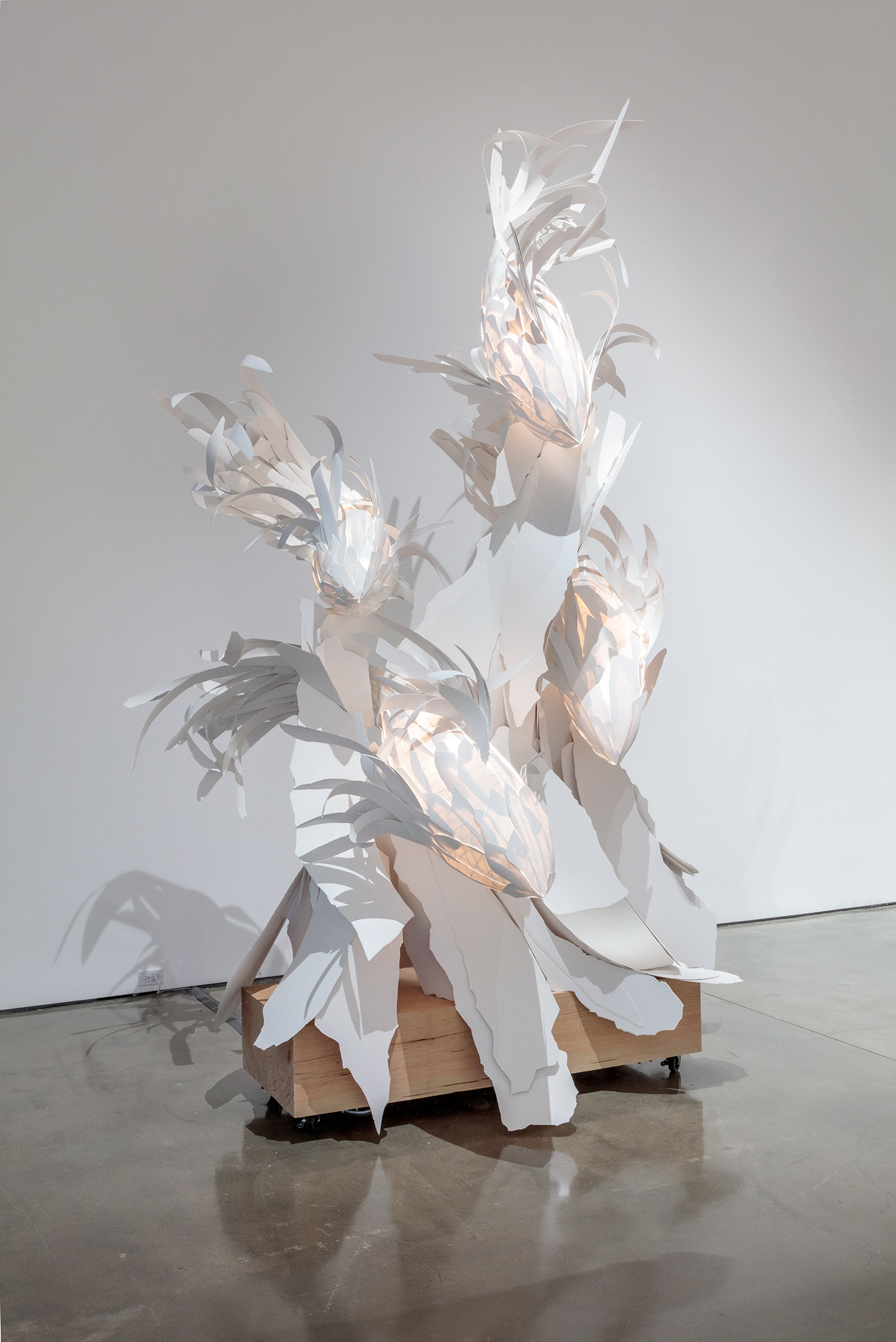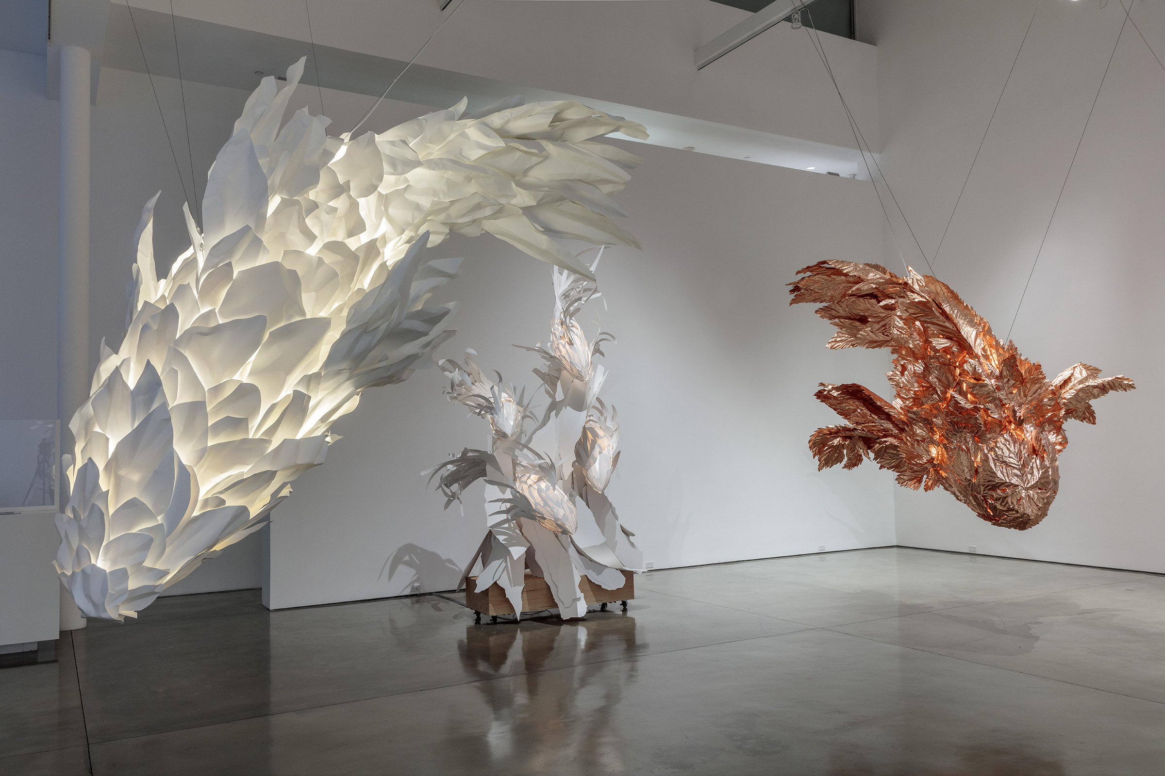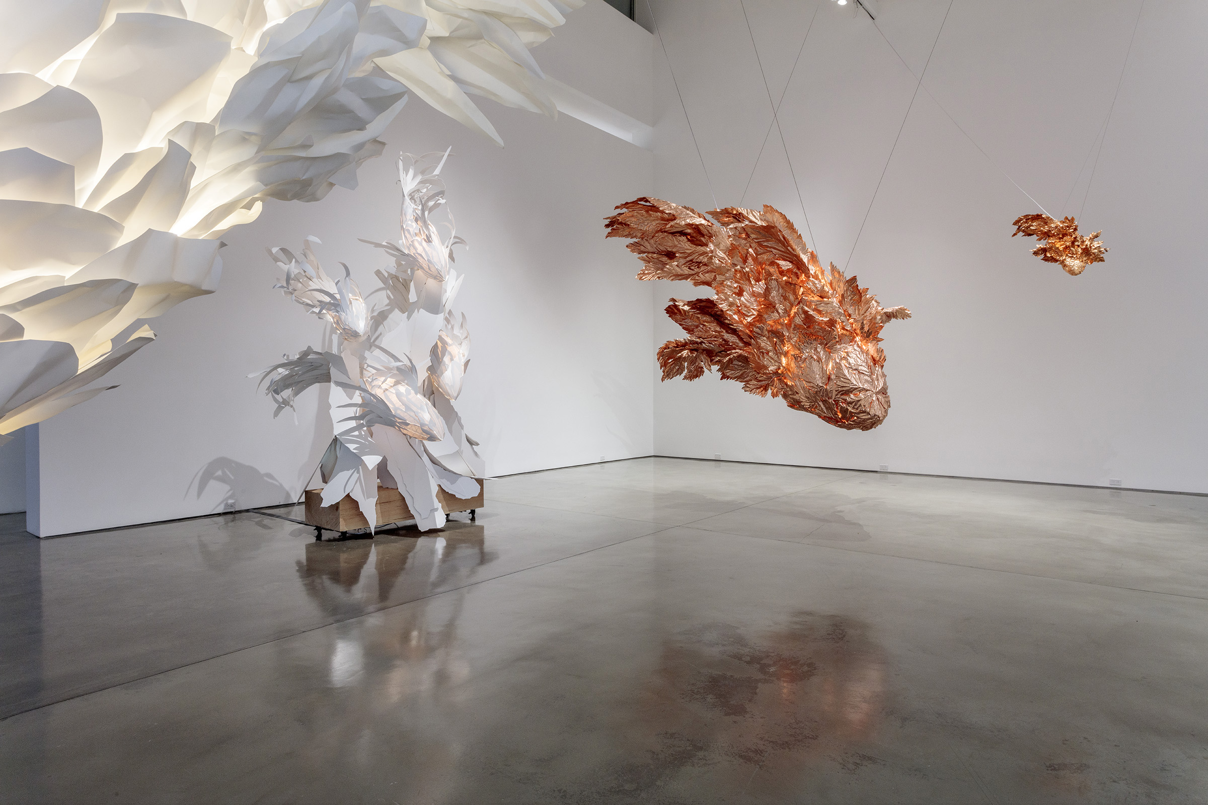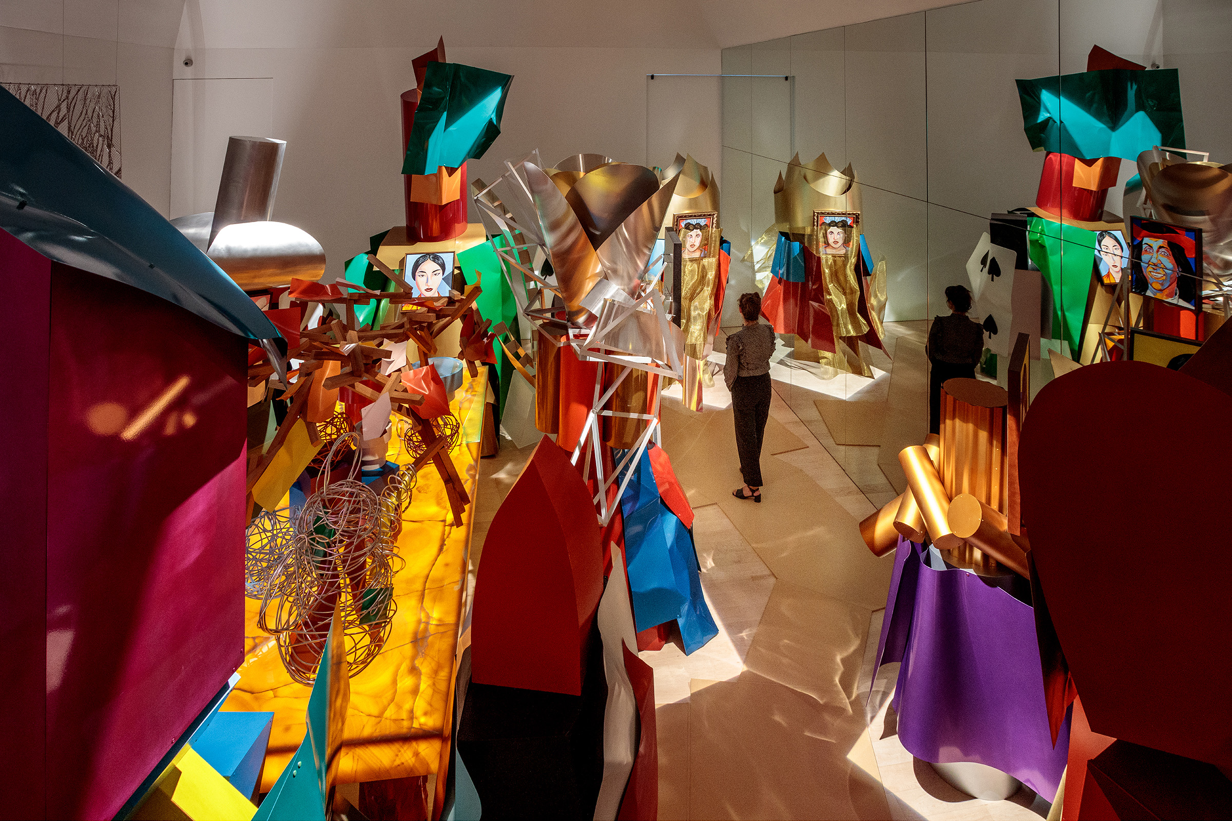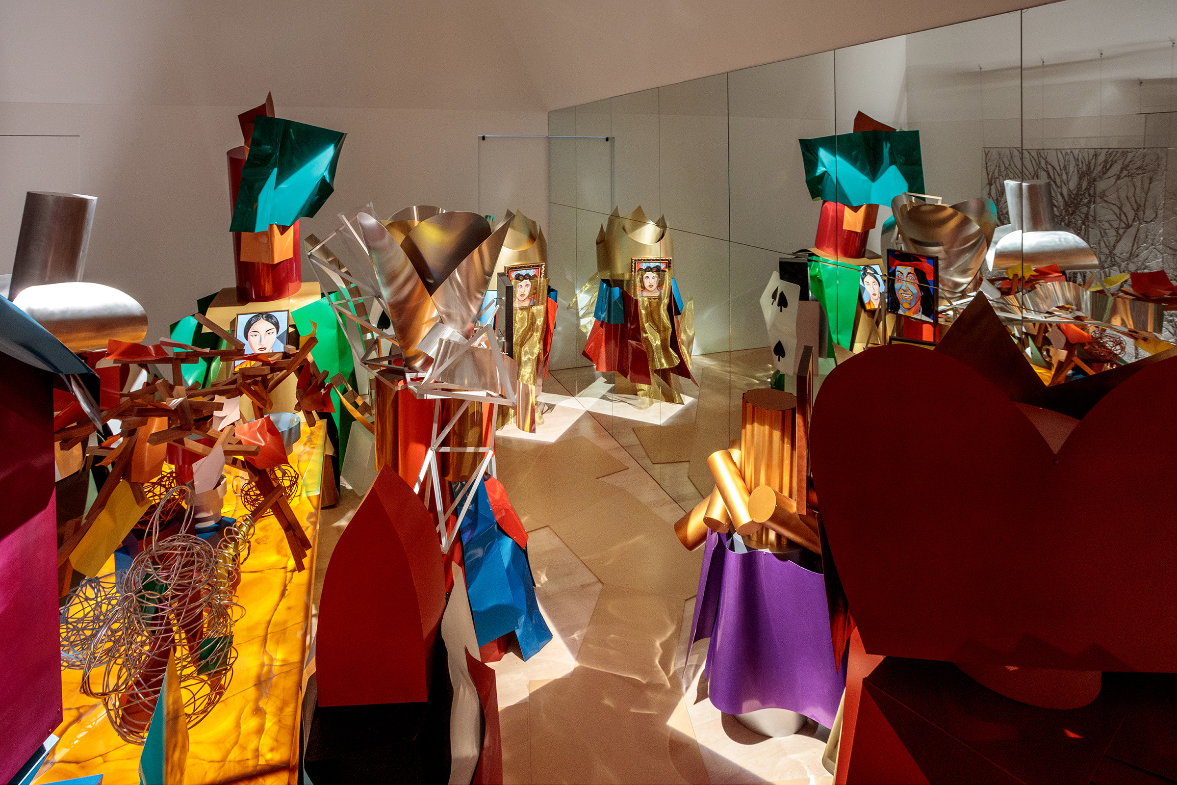 When I built the first model of the fish, I saw in it the movement that I was looking for. It was startling that a static object could express motion in such a dynamic way. —Frank Gehry Gagosian is pleased to present Spinning Tales, an exhibition of new work by renowned architect Frank Gehry. It pairs large-scale elaborations on the Fish Lamps series with a new installation, Wishful Thinking (2021), and is Gehry’s eighth exhibition with the gallery since 1999. Celebrated for his groundbreaking architectural designs, Gehry has also produced significant bodies of sculpture and furniture, from Easy Edges (1969–73) and Experimental Edges (1979–82)—chairs and tables made from layers of corrugated cardboard—to bentwood furniture items designed for Knoll (1989–92). The Fish Lamps evolved from a 1983 commission by the Formica Corporation to utilize ColorCore, a type of plastic laminate. After accidentally breaking off a shard of the material, Gehry was inspired by its scale-like appearance; molding wire armatures into piscine forms, he affixed ColorCore fragments to them. In the main gallery, three outsize, internally illuminated Fish Lamps sculptures are suspended from the ceiling in dynamic, twisting poses, as if swimming through water. In these works, Gehry has used polyvinyl and copper for the first time. These central forms are surrounded by lively, colorful sculptures that are more baroque in their ornamentation. While these sculptures are autonomous works, the “perfect form” of the creature that they emulate reappears throughout Gehry’s architectural oeuvre, lending itself to the undulating profiles of buildings including the Guggenheim Bilbao, Spain (1997), and the Walt Disney Concert Hall, Los Angeles (2003). Filling the upstairs gallery is the immersive installation Wishful Thinking, based on a scene from Alice’s Adventures in Wonderland. Gehry renders the Mad Hatter’s tea party as a group of ten surreal figures, twice life-size. Fashioned from brilliantly painted metal, Gehry’s abstracted interpretations of Carroll’s original characters surround an internally lit table, the glowing heart of the scene. Three overlapping woven steel “tapestries” of trees evoke the episode’s forest setting, while a mirror on the opposite wall implicates the viewer. The crumpled surfaces of Wishful Thinking’s figures establish a new visual connection with some of Gehry’s best-known designs.