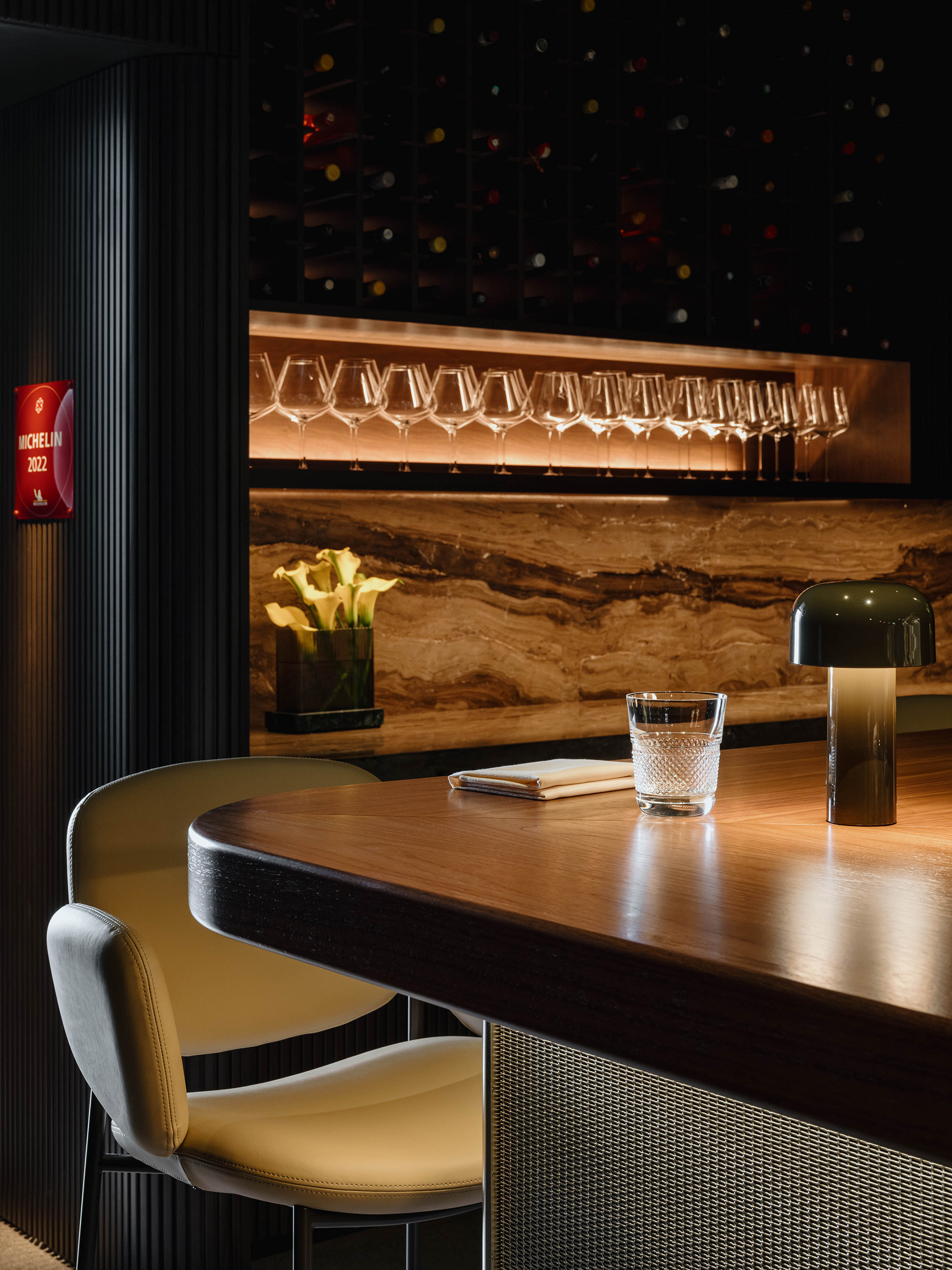 Lighting plays an essential role in enhancing the presence and vibrancy of the interior finishes as well as each dish on every plate. The subtle art lighting also provides controlled attention to the rotating artwork, which is part of the front gallery. Despite limited space, the newly designed sommelier wall manages to showcase the extensive wine selection. The wall is illuminated dimly to provide a distant glow.