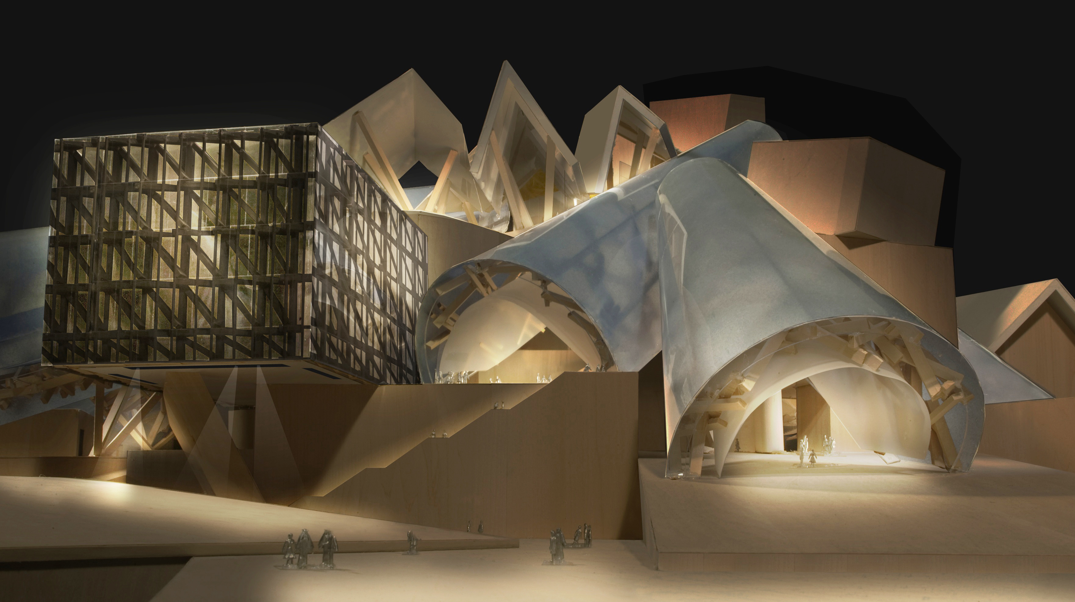 Gehry created clusters of galleries connected by catwalks that center on a common courtyard, and additional vertical clusters of galleries that allow for a variety of vertical and horizontal exhibition spaces, providing unprecedented curatorial flexibility. Monumentally scaled cones provide natural cooling and ventilation of the courtyards in a nod to traditional Middle Eastern wind towers.
