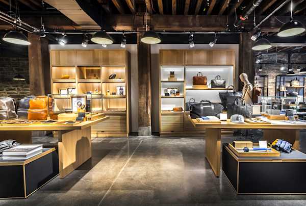 Within the store, a clean, minimal palette sets the tone, with monochrome yet textural materials such as wood and stone evoking the evolution of Hennessy containers—from their original cognac barrels to today’s distinctive faceted glass bottles. Throughout the space, multiple layers of light combine to create a “liquid atmosphere.” To achieve the effect, the design team focused on lighting the bottles and indirectly illuminating the space with amber light, contrasting with the store’s strong black and white color palette, resulting in an ambience that’s inviting and fluid for visitors, and that seamlessly highlights the products on display. The first layer of ambient illumination utilizes indirect lighting integrated into architecture and millwork to wash surfaces and textures, providing an overall diffuse glow. Outside the store, for example, two different entry façades are defined by illuminated logo signage to increase brand visibility, combined with general lighting that enhances flow into the space. Each exterior entry point also contains illuminated recessed display niches that can be used on a rotational basis to showcase the brand’s products, as well as for collaborations or temporary installations from visiting artists. Once inside, the theme continues with additional niches highlighted by diffuse integrated lighting, as well as a series of cove fixtures that wash shelves and display tables.