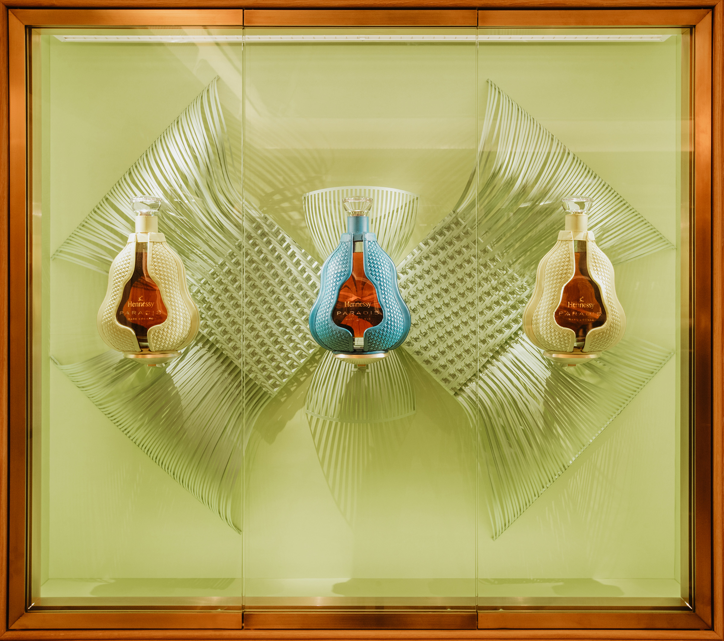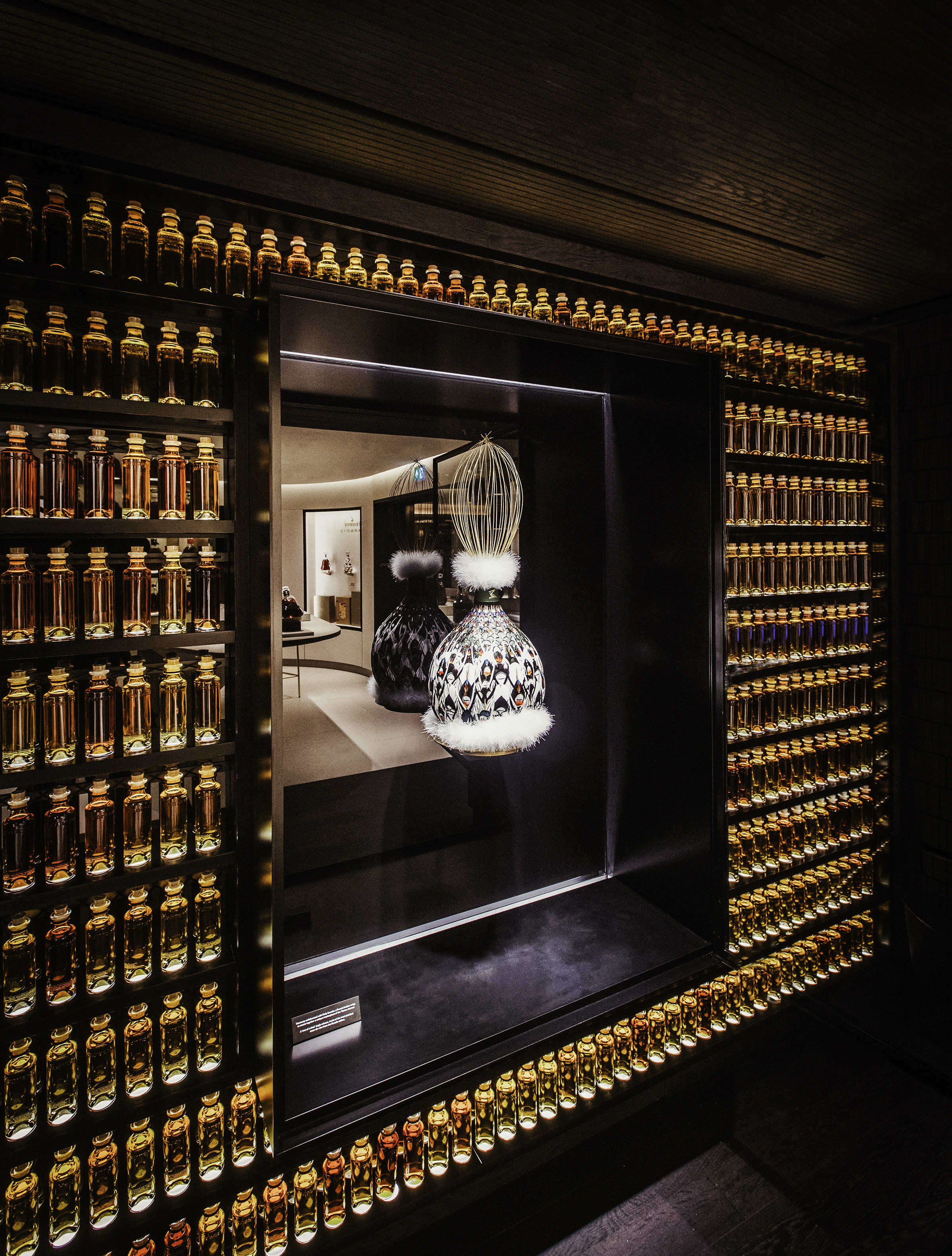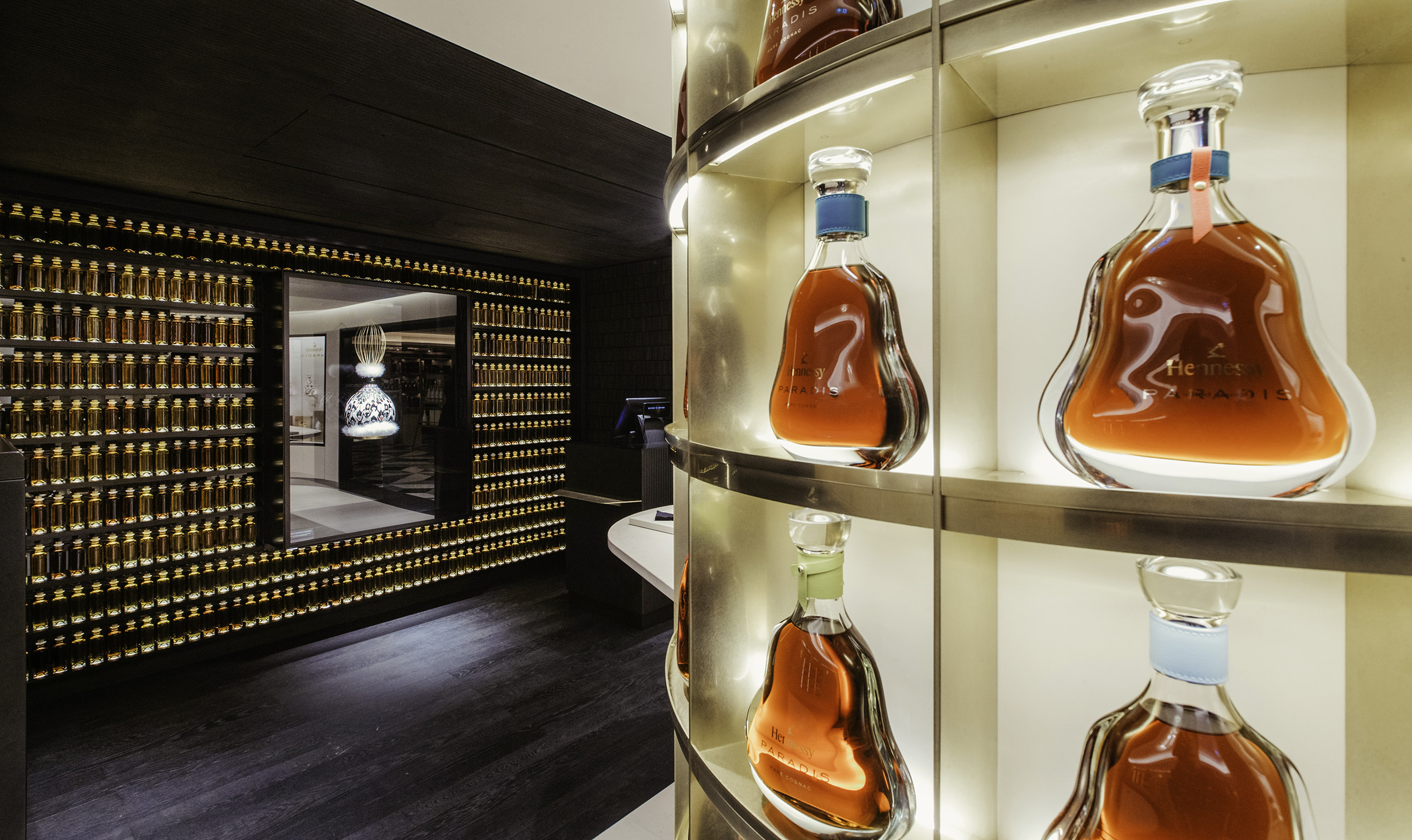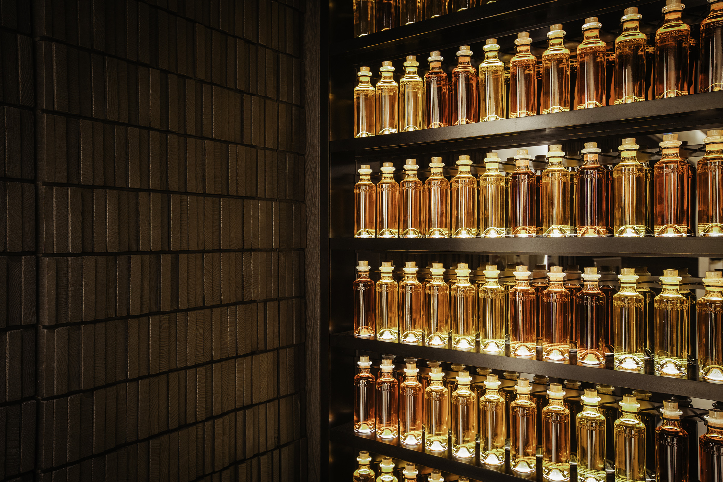Finally, a third product layer creates a unique spatial character by highlighting the items on display. The nature of Hennessy’s liquid products and faceted glass bottles resulted in the design team integrating light sources into the cognac bottles and vials, based on additional mock-ups and testing to validate the concept. The subsequent scheme enhances the amber tones of the cognac while also capturing the faceted nature of the glass. Additional illumination integrated into a screen behind an artistic glass Paradis silhouette reinforces the dynamic transformation of light through the dozens of bottles on display.