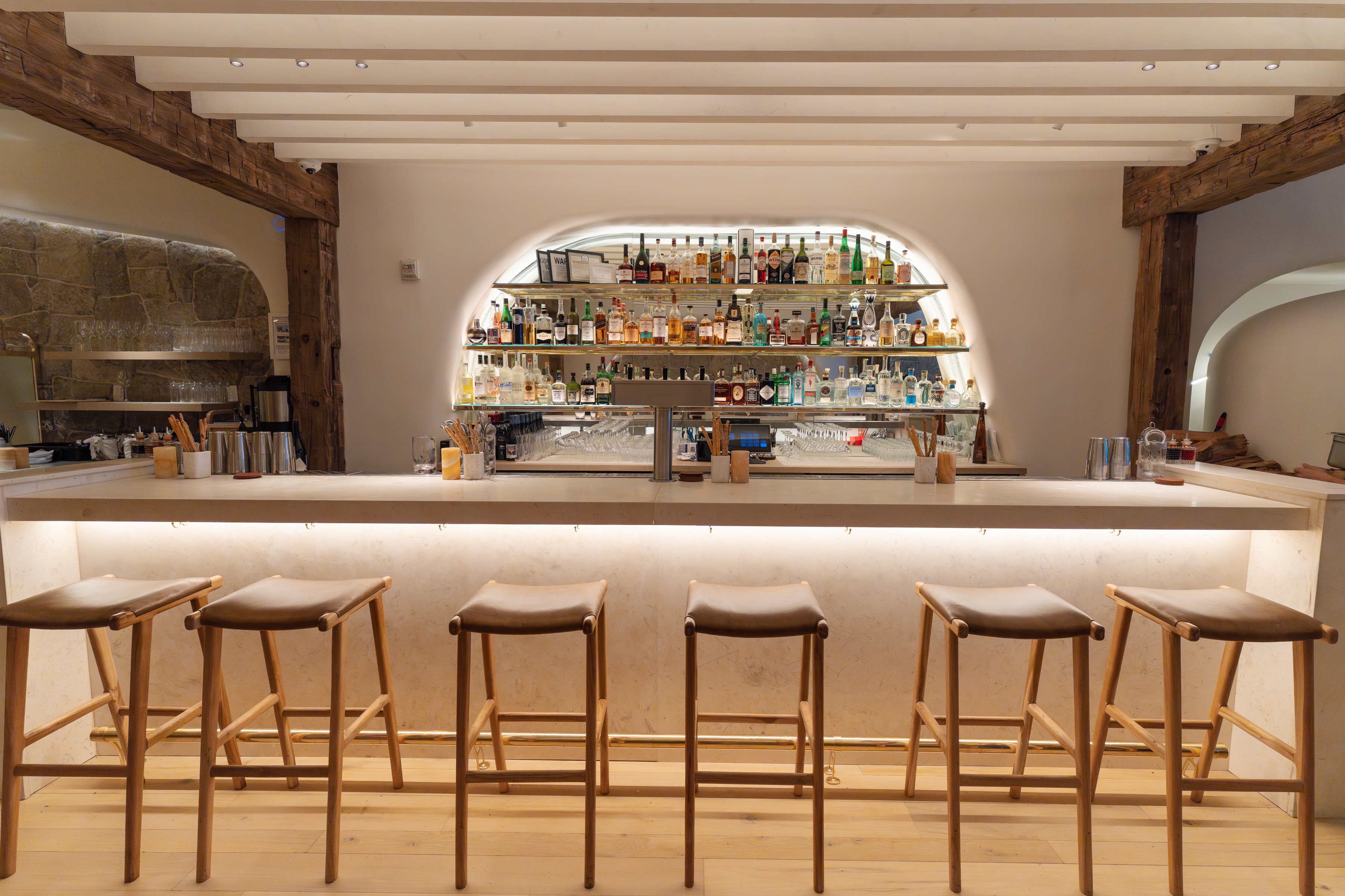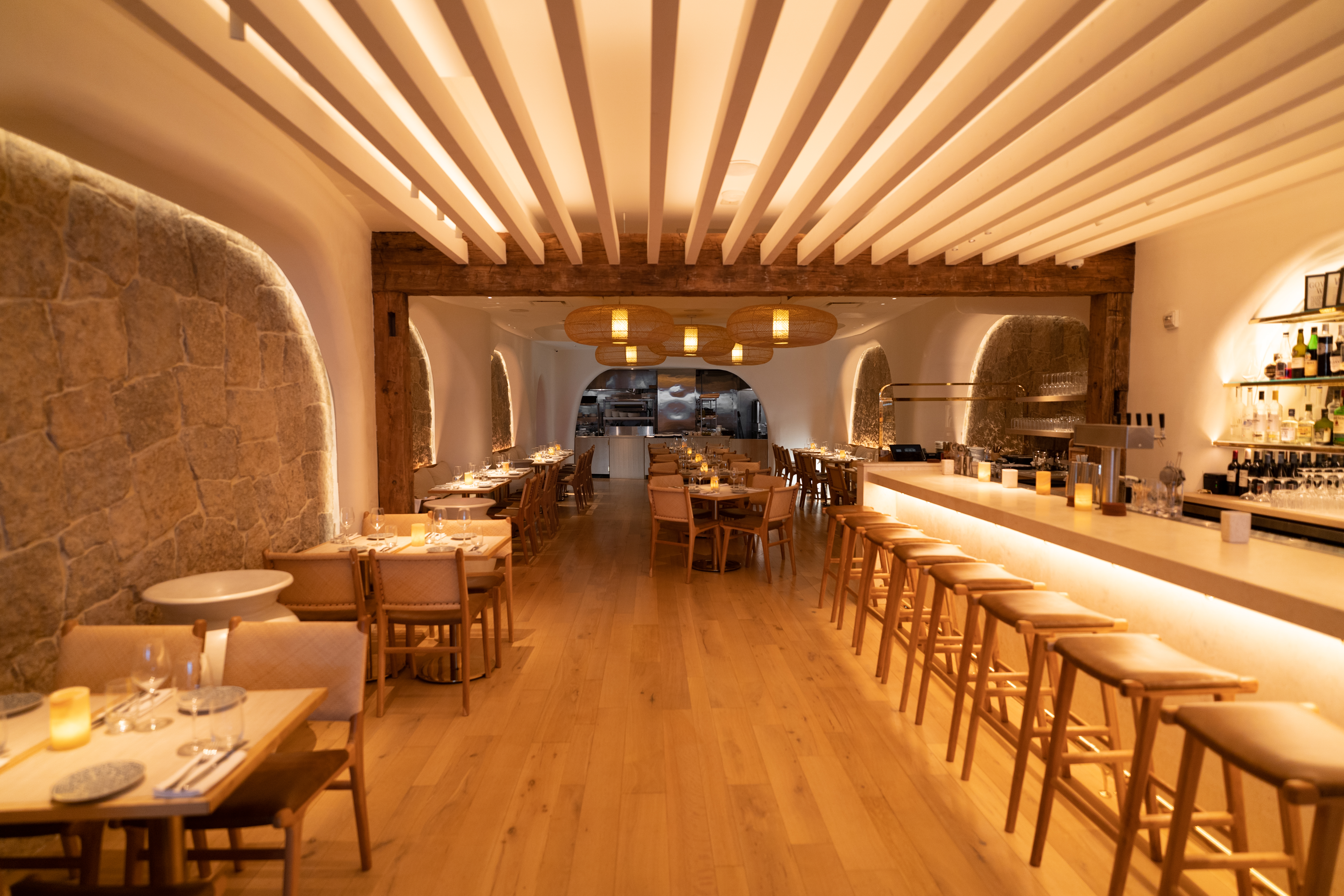 Timber beams and cut stone walls ground the fully renovated space, while the furnishings and decorative rattan/straw light fittings give a feeling of breeziness. The restaurant and pizza bar feature two large pizza ovens, full bar, and open kitchen along with a private mezzanine event space, with soft indirect light behind the timber and stone elements and an intimate, candle-like glow to each table.