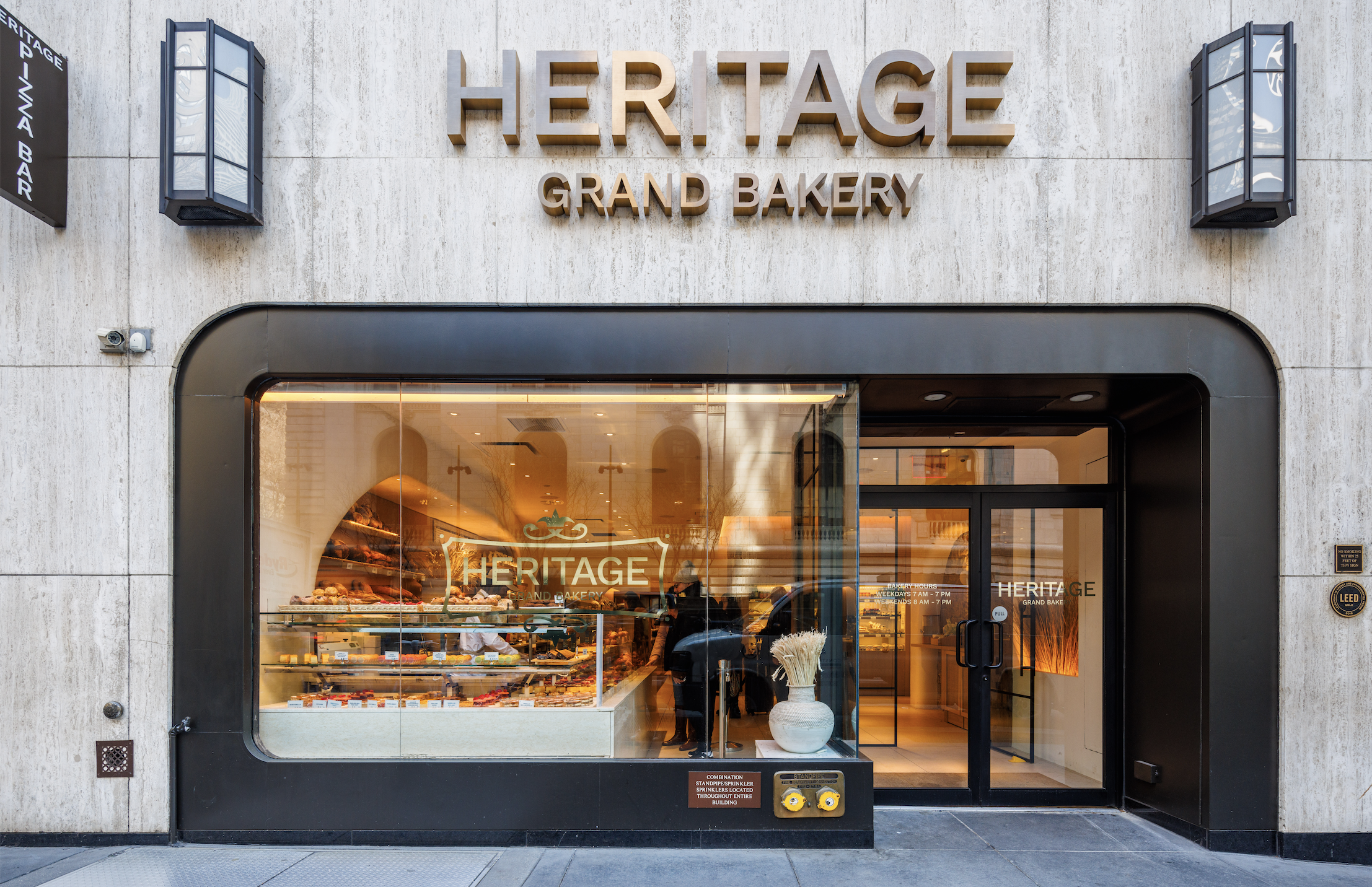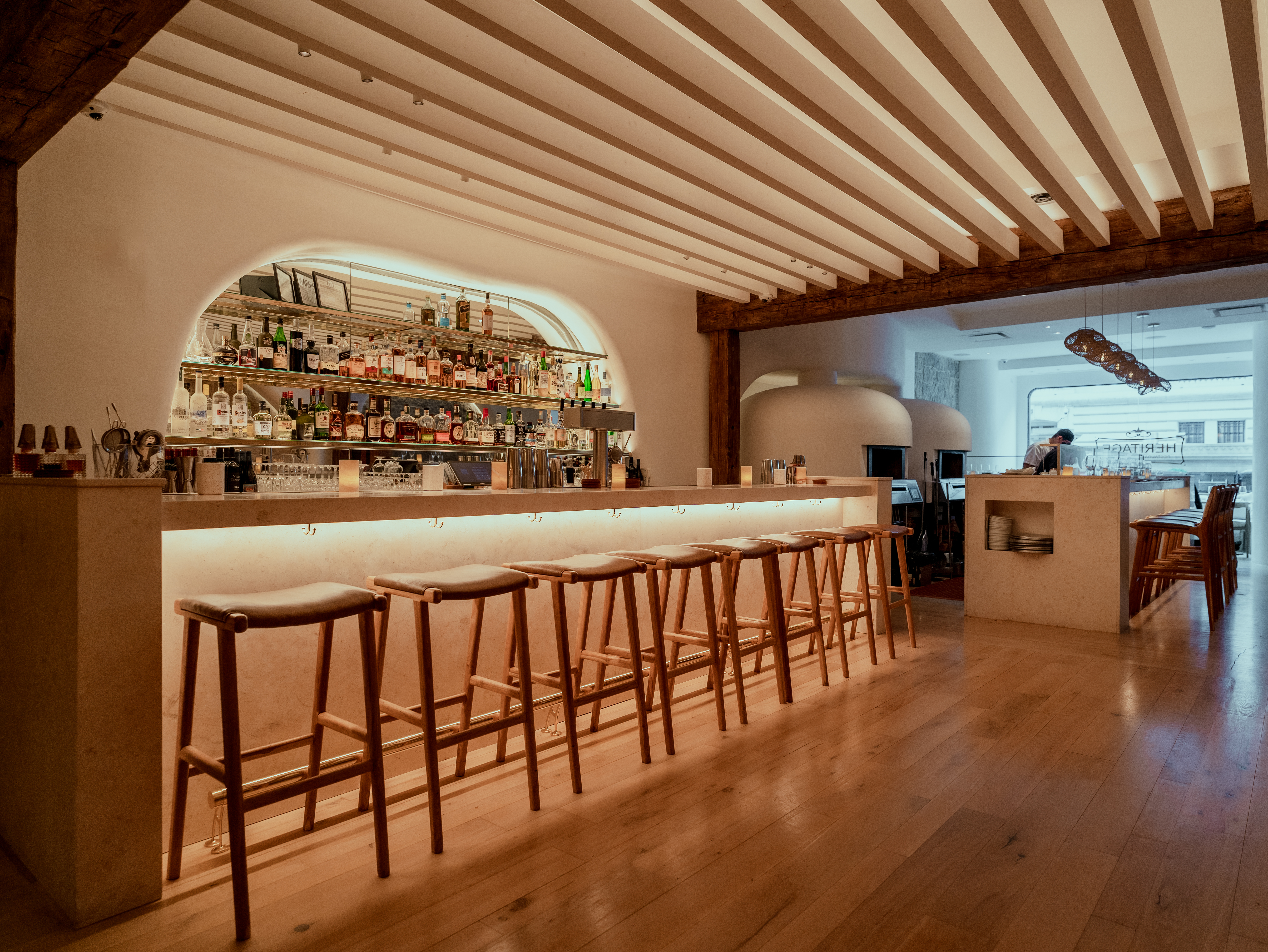 Located off of Bryant Park, Heritage Grand Bakery features Mediterranean-inspired cuisine using ancient grains and traditional techniques. The interior design by Silvia Zofio, with brand manager Patricia Joseph, visualizes this ancestral culinary experience. Smooth, curved white plaster formwork is articulated throughout with touches of earthiness and atmospheric warmth.