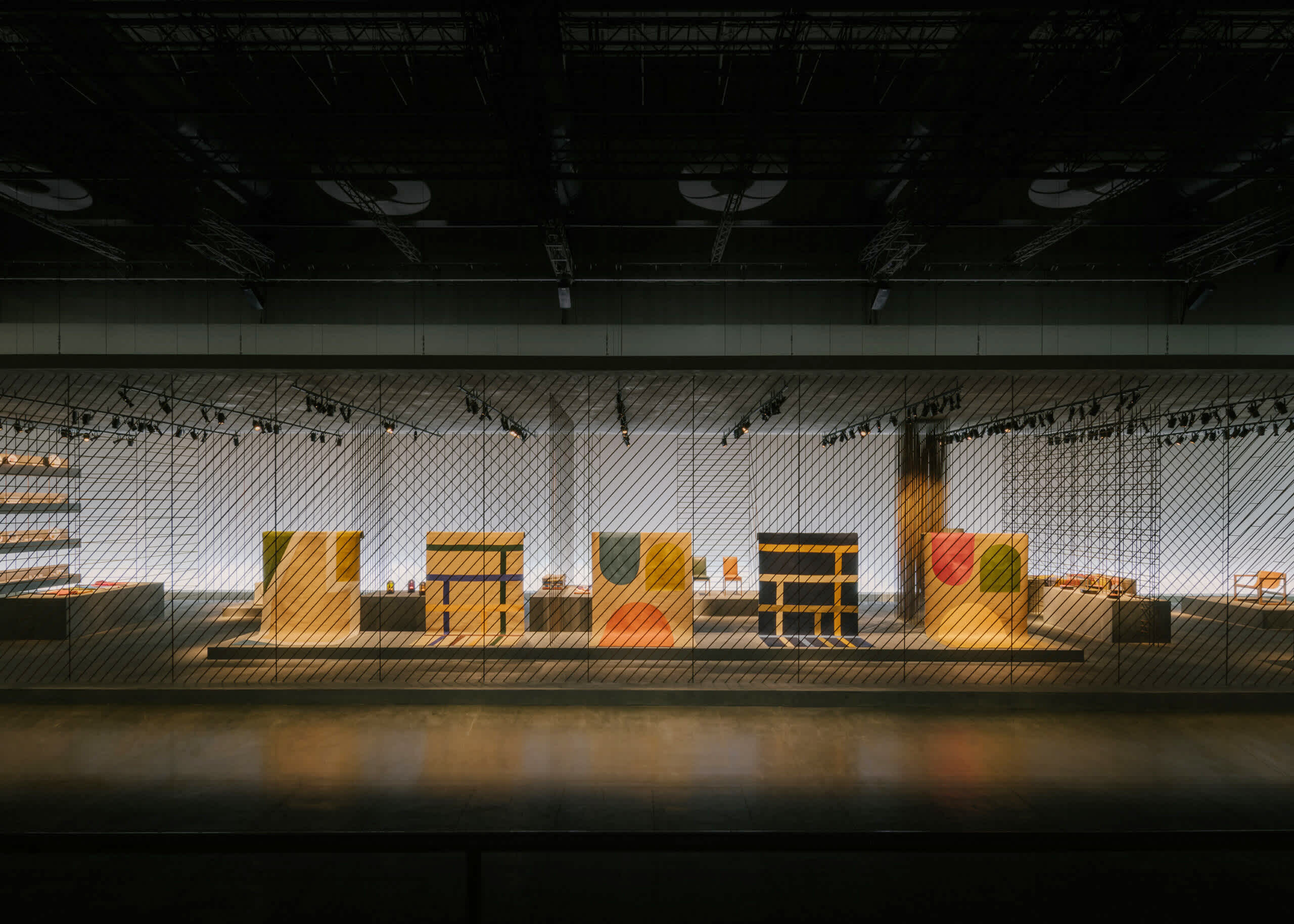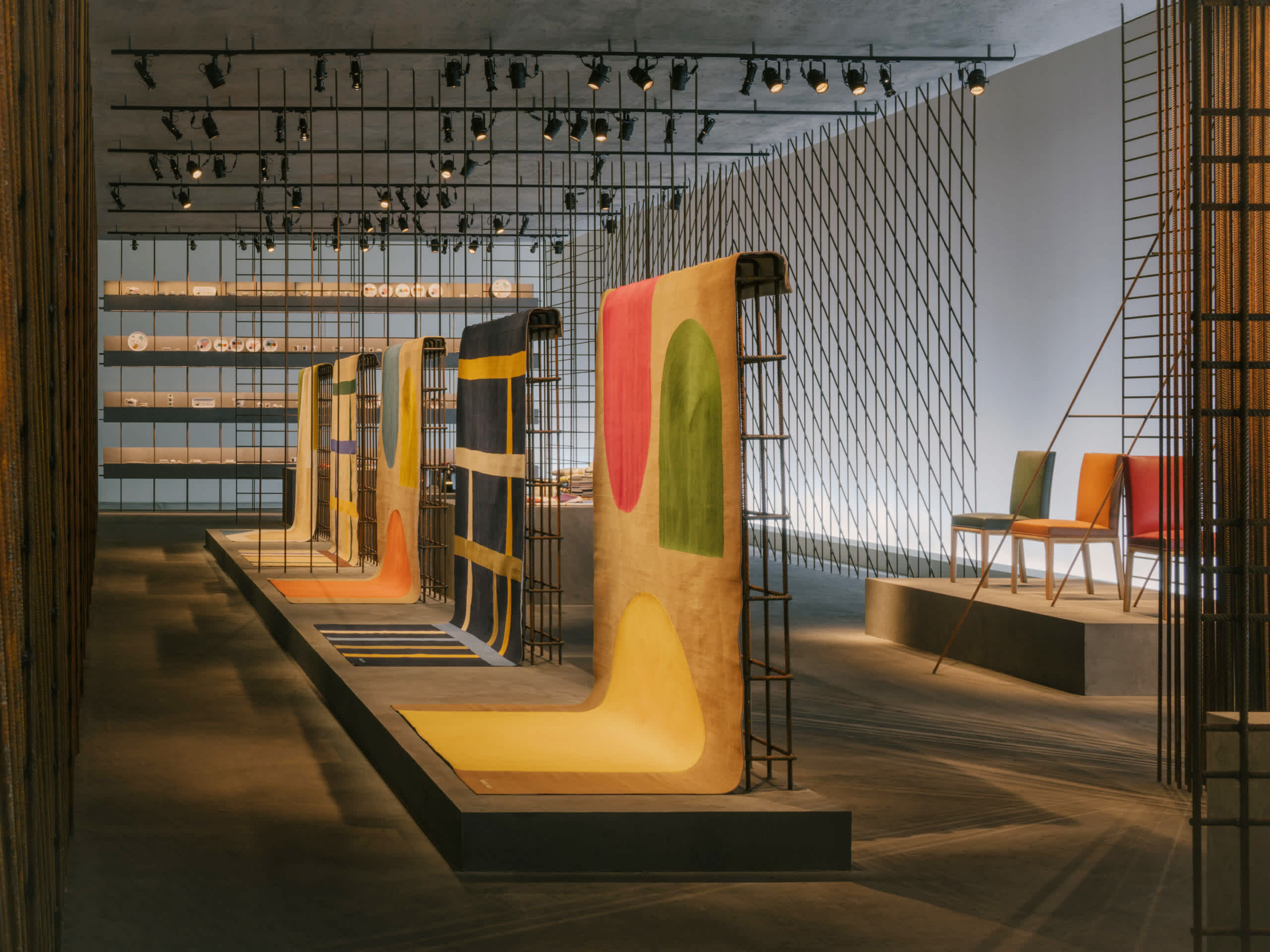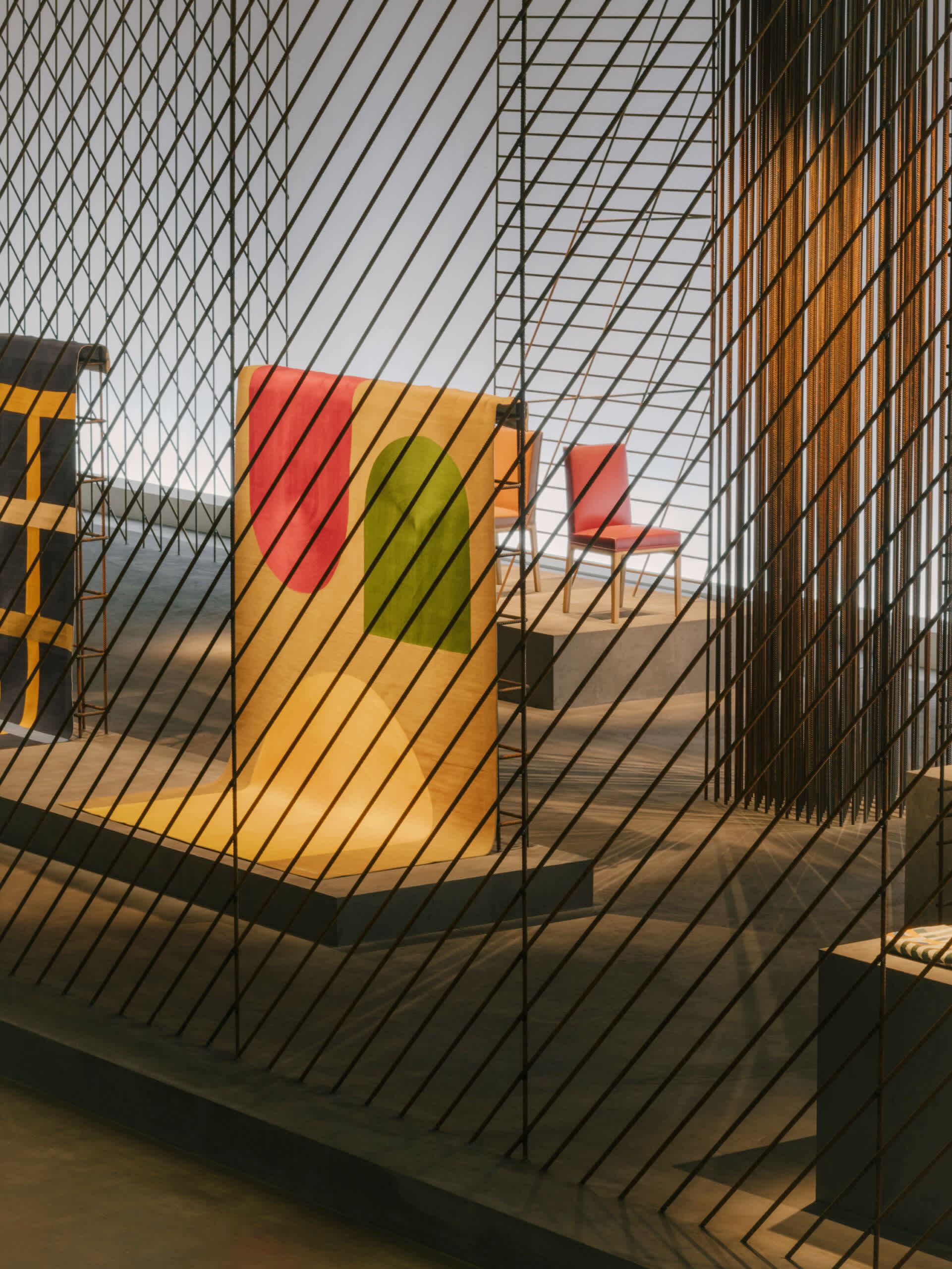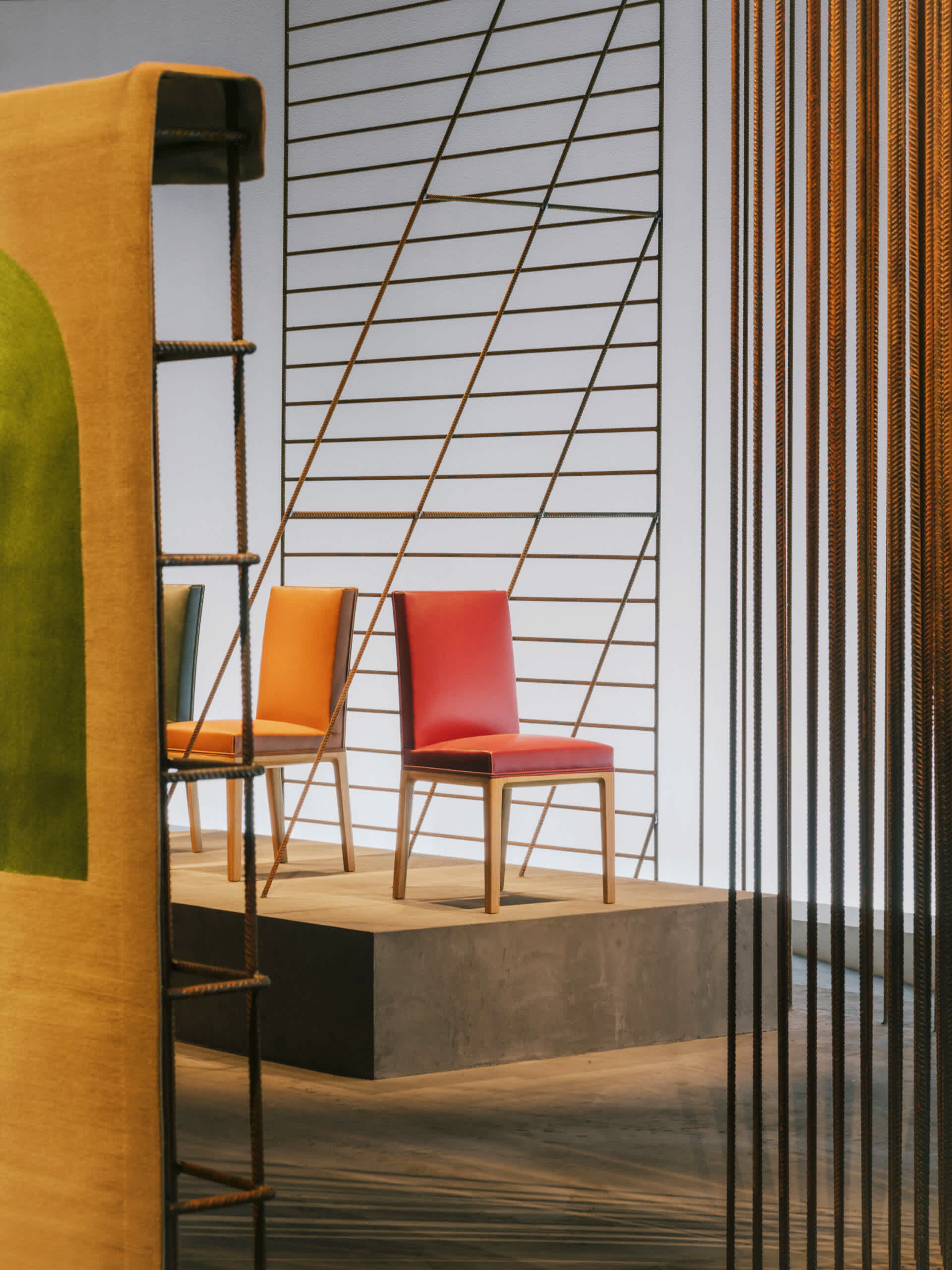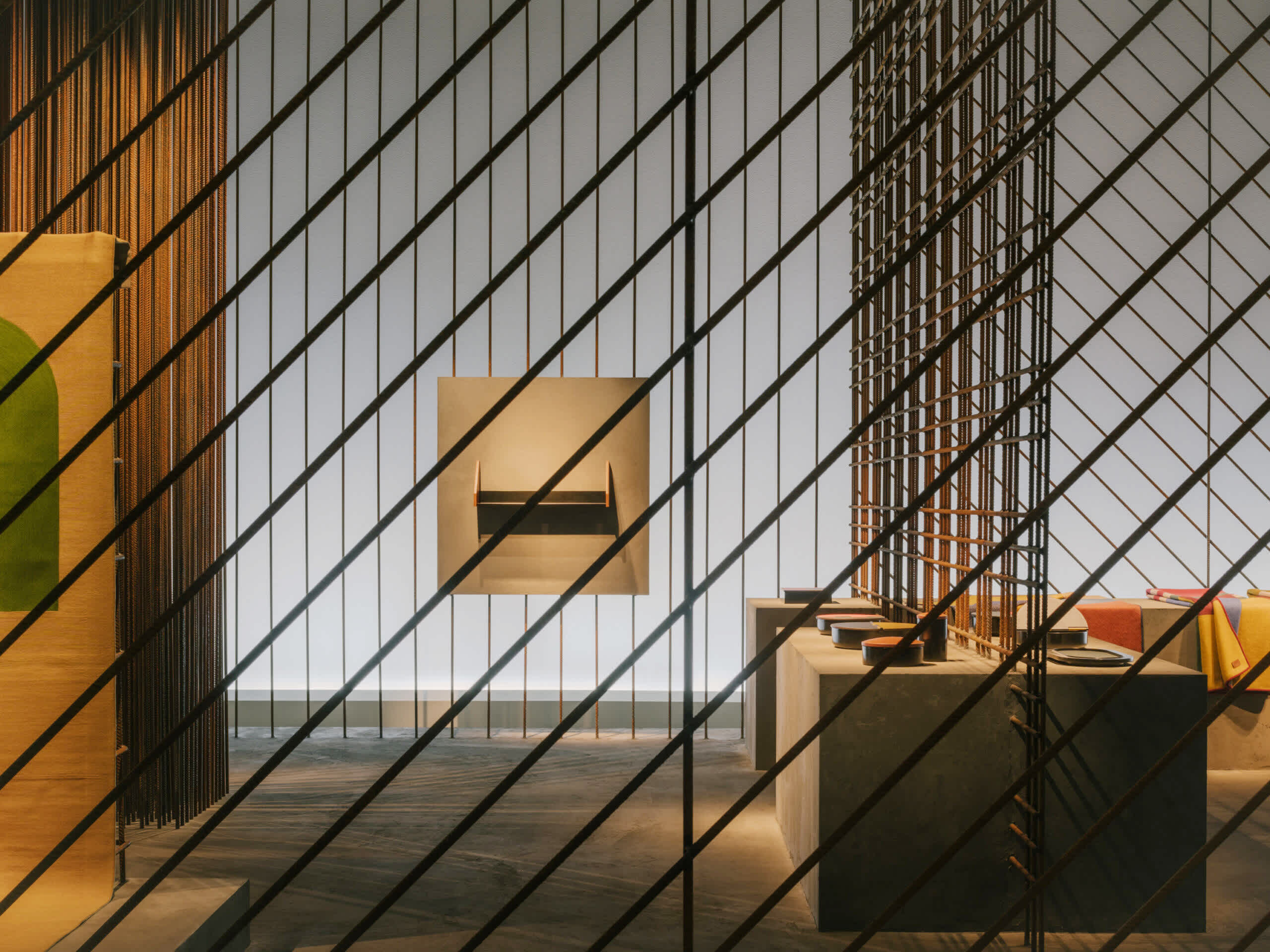 This year, the staging has been stripped of all excess to display a framework composed of iron rods and concrete. Its interplay of grids and lines creates, in this radical and powerful structure, an ideal yet very real space for representation. The Hermès creations for the home presented here assert strength through subtraction with effortless presence. This is the very essence of design, drawing inspiration from materials and expressed through skilled know-how.
