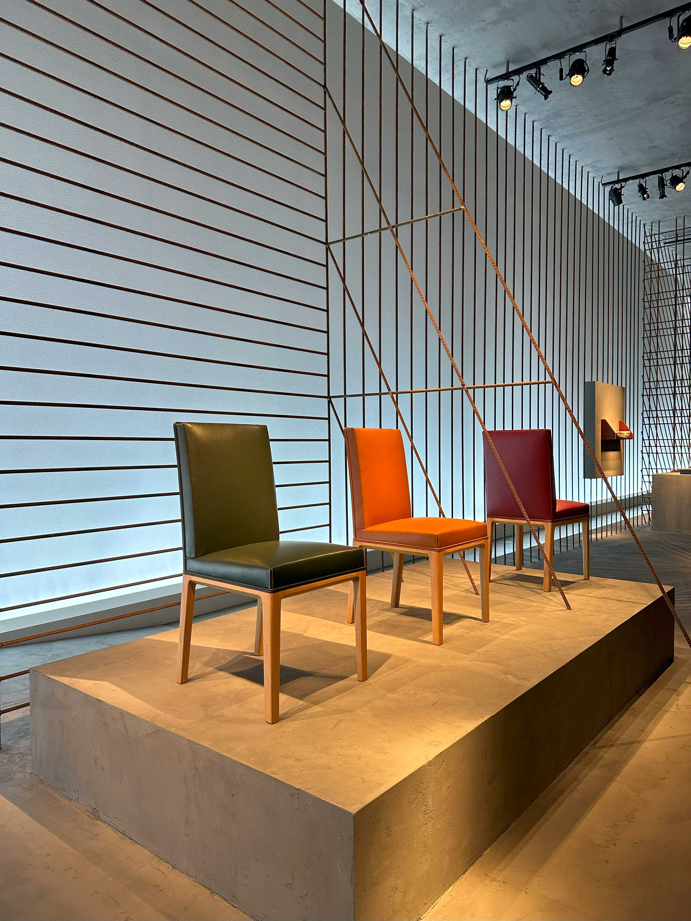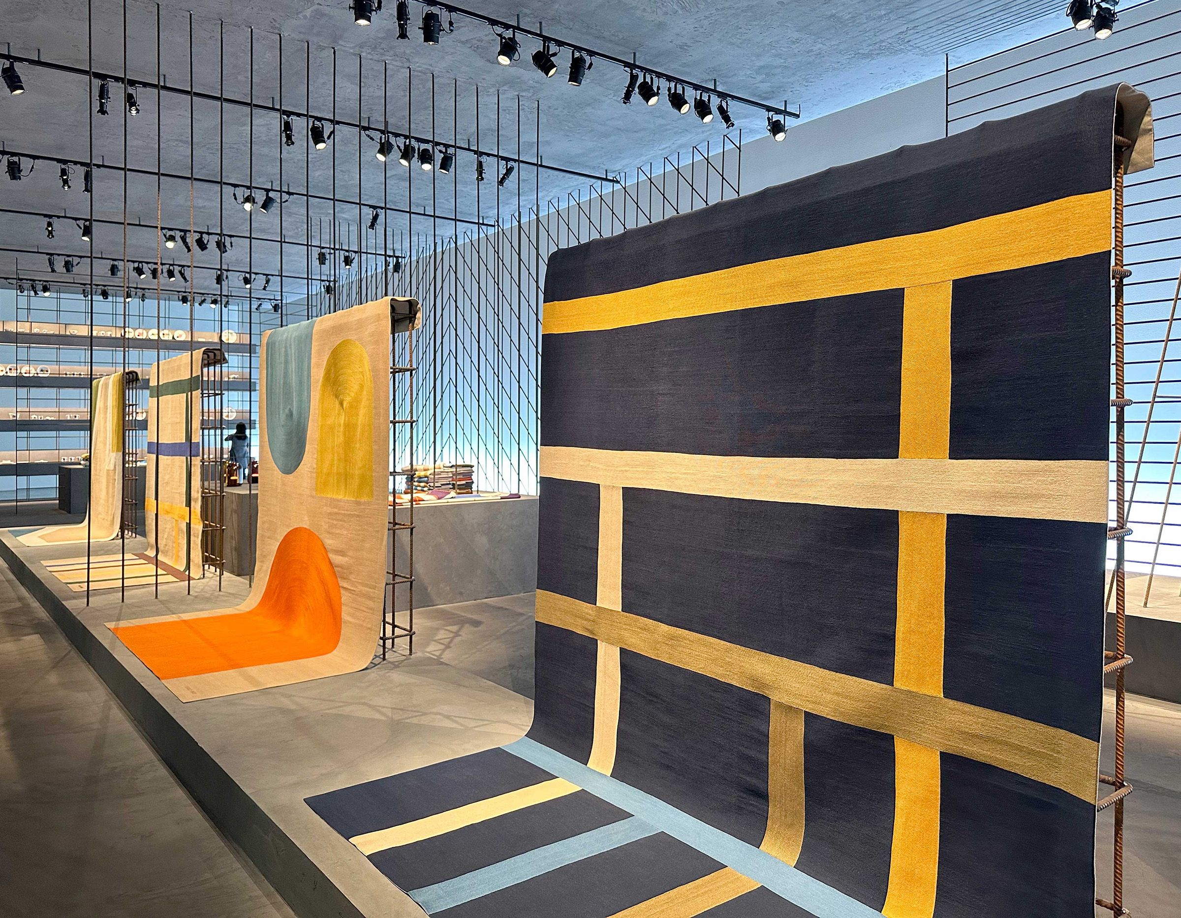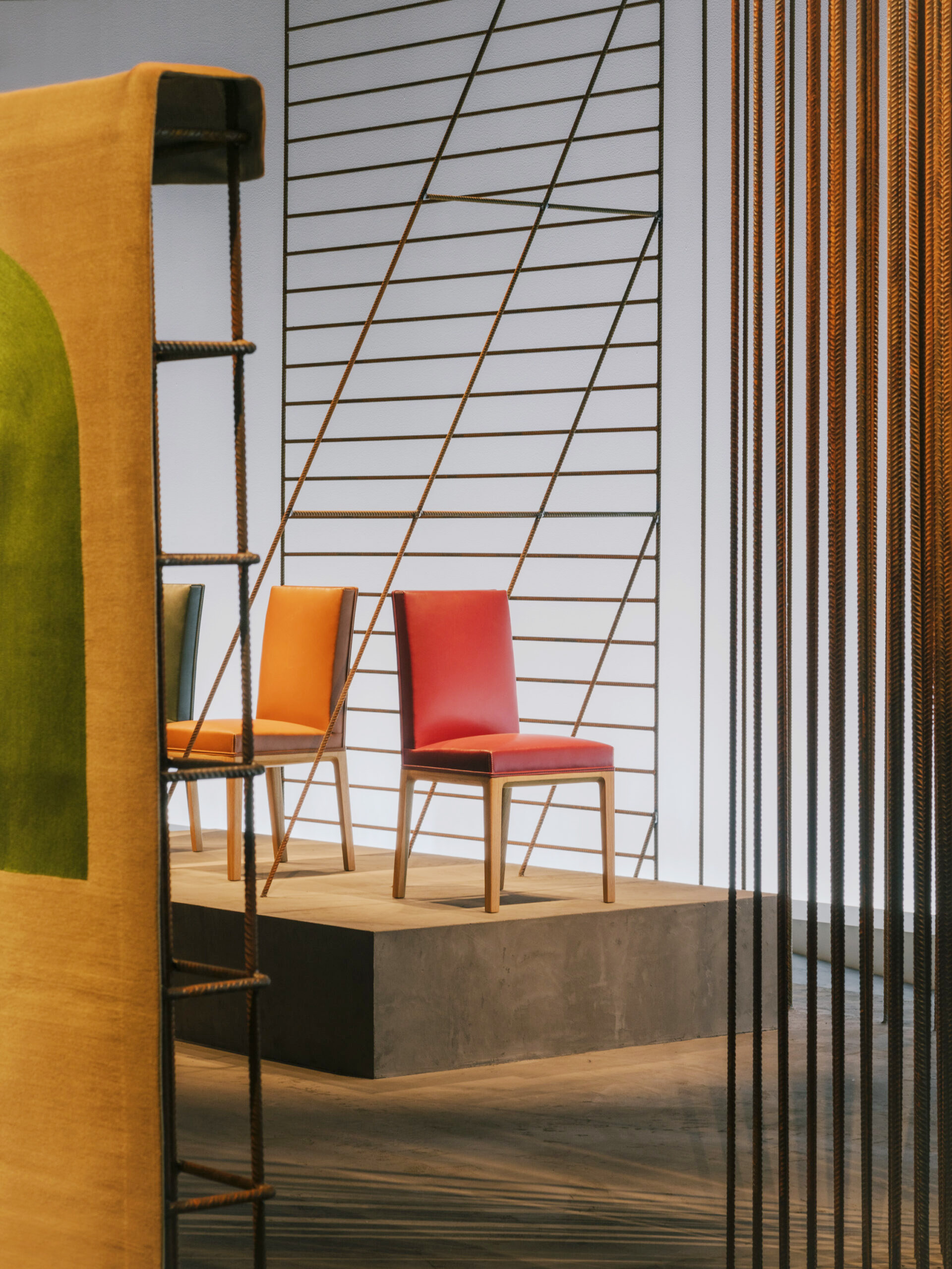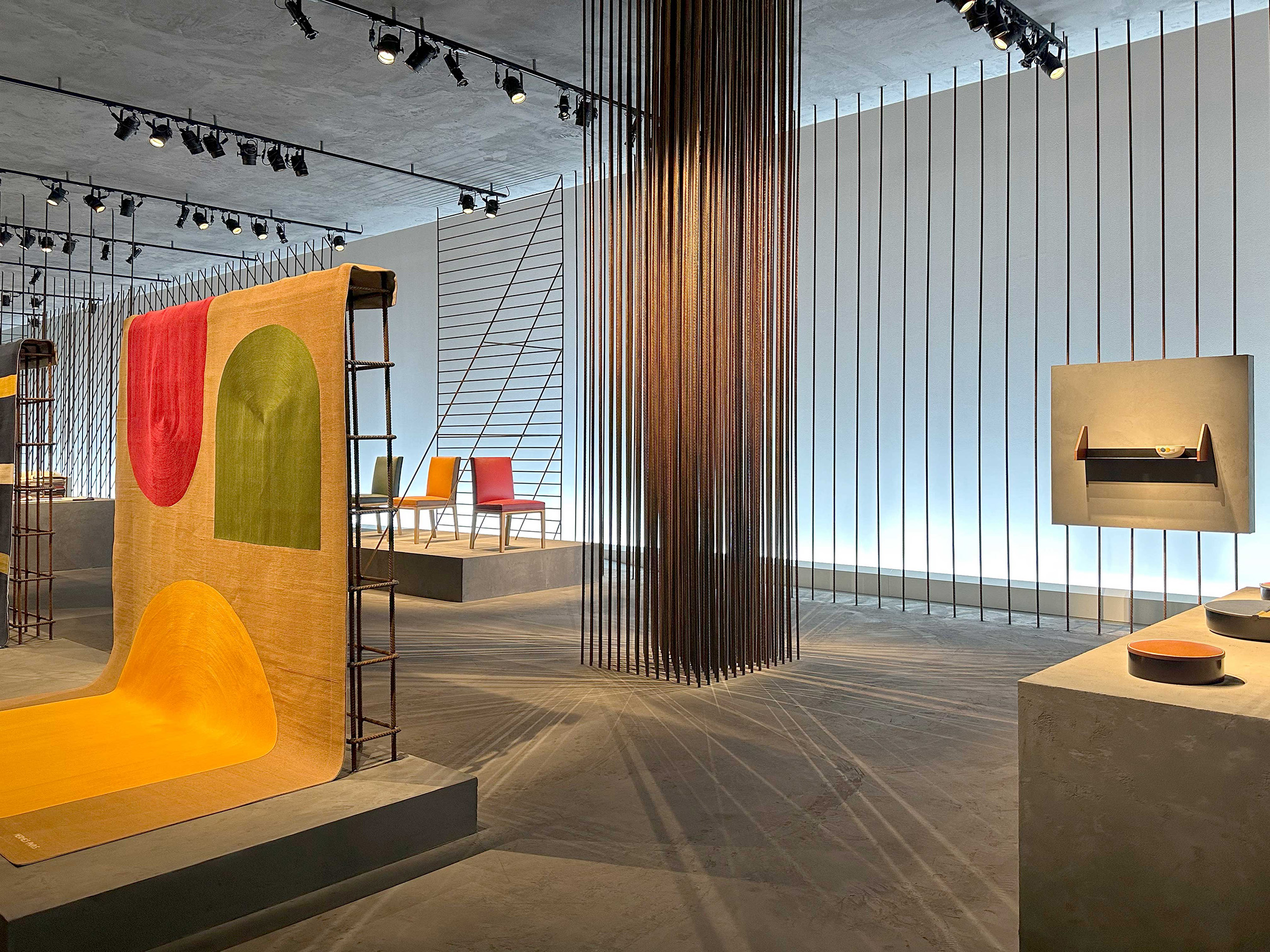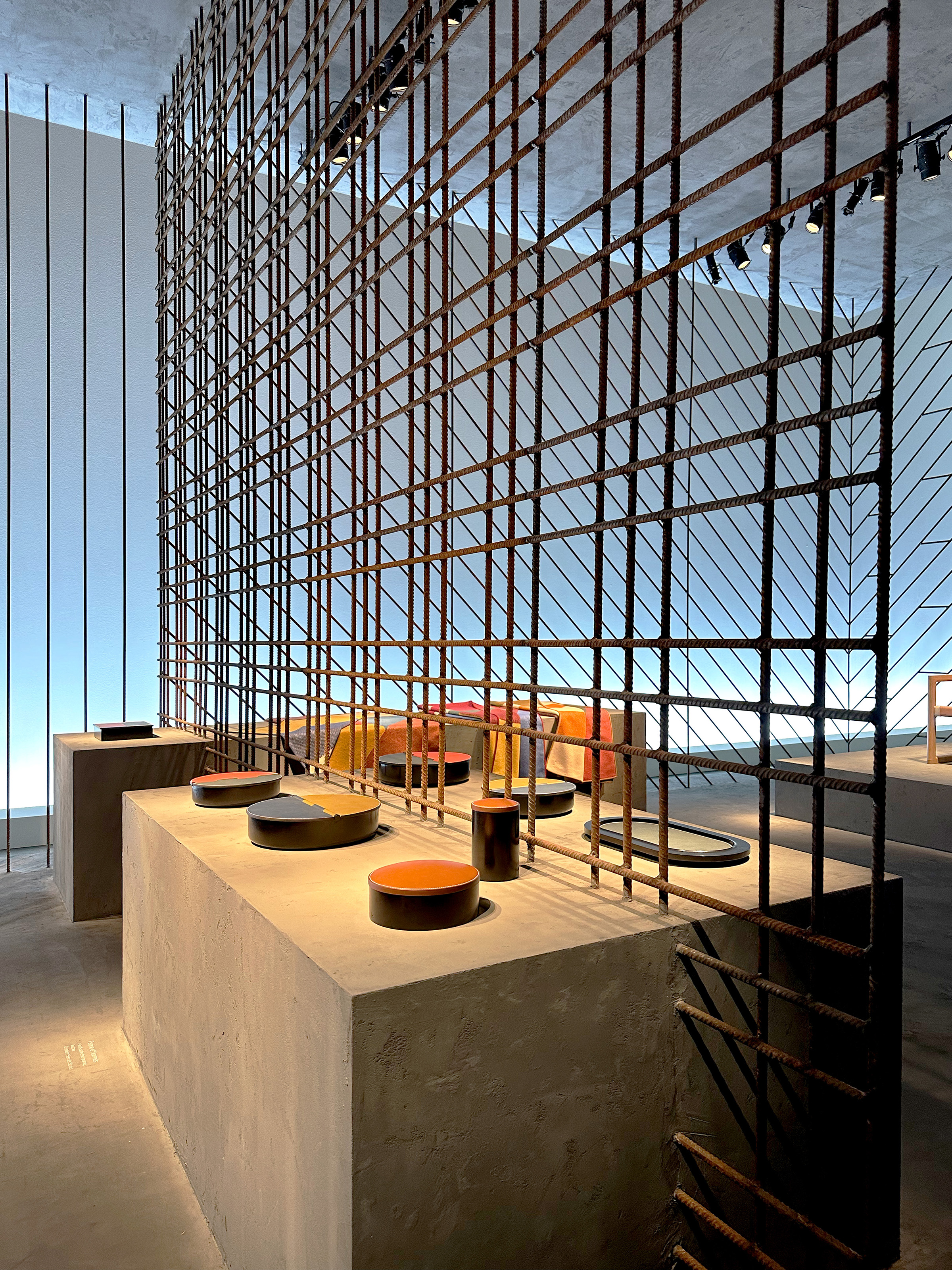 This year, the staging has been stripped of all excess to display a framework composed of iron rods and concrete. Its interplay of grids and lines creates, in this radical and powerful structure, an ideal yet very real space for representation. The Hermès creations for the home presented here assert strength through subtraction with effortless presence. This is the very essence of design, drawing inspiration from materials and expressed through skilled know-how.