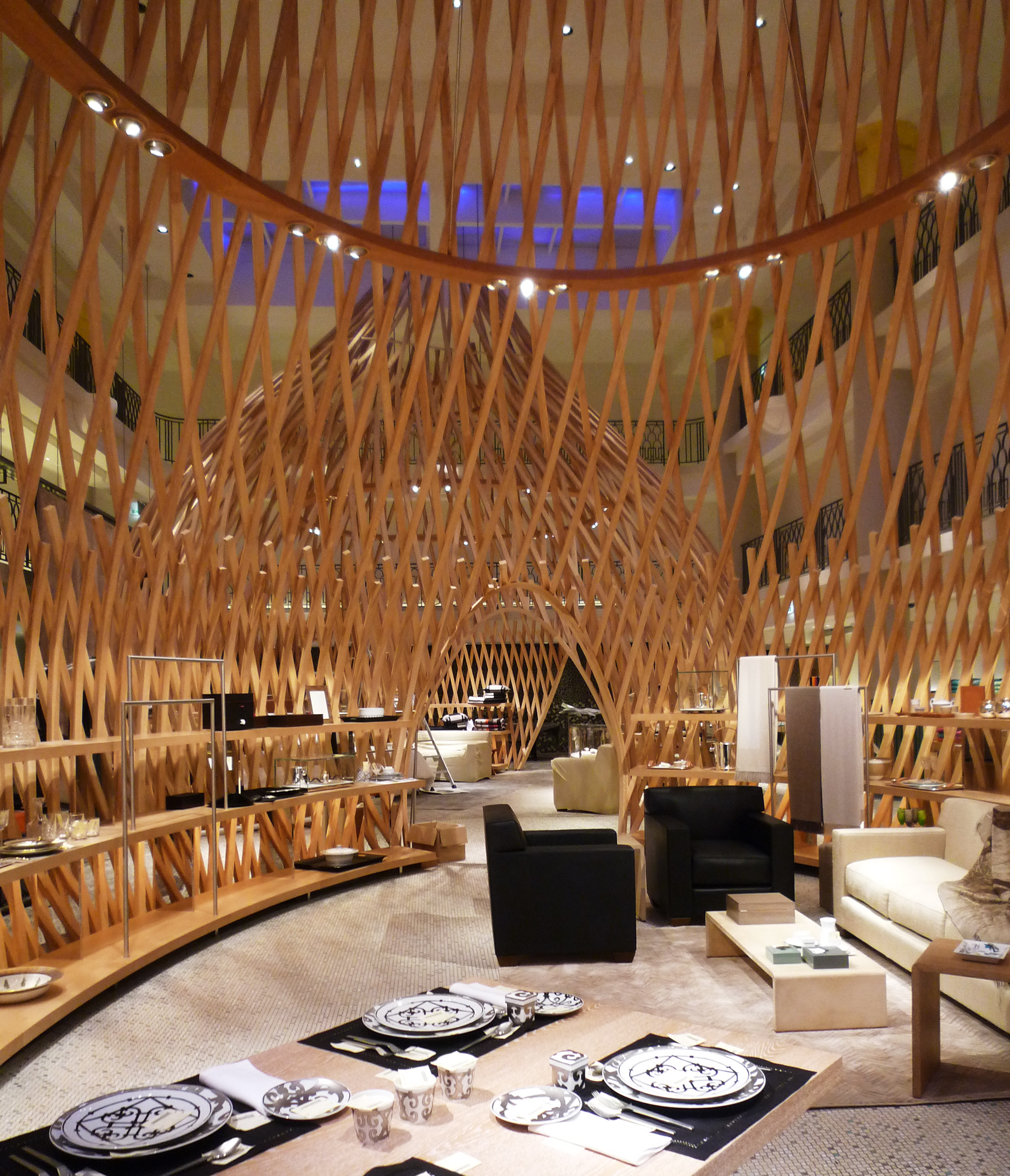French architects RDAI have completed this new Paris boutique for fashion brand Hermès inside a 1930s swimming pool building. Hèrmes Rive Gauche features three nine-metre high wooden pavilions made of ash laths, each housing the Hèrmes collections. A fourth wooden structure lines the staircase leading visitors from the entrance into the former pool.