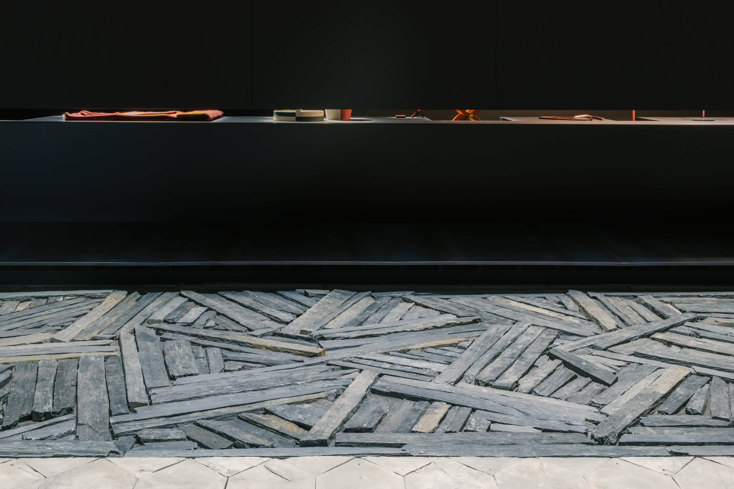 This year, Hermès is bringing together new creations and objects from its heritage. Playing on the equivocation between past and present, Hermès' designs are timeless and ageless. Following a route on the theme of its anchors in the ground, the eye first catches a composition of raw materials – bricks, stone, slate, wood, compacted earth – that resembles the design of a jockey’s silk jersey. A powerful symbol of the Hermès' cultural heritage, the jockey silk, with its geometric and colorful patterns, is a source of inspiration for leather objects and textiles.