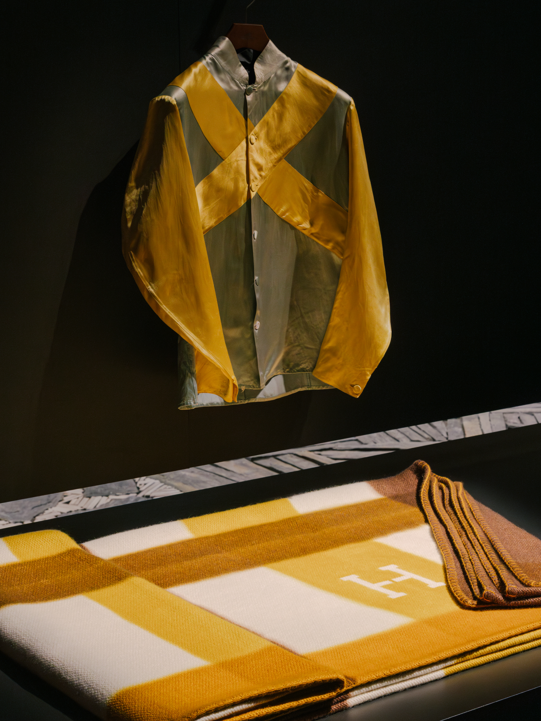 This year, Hermès is bringing together new creations and objects from its heritage. Playing on the equivocation between past and present, Hermès' designs are timeless and ageless. Following a route on the theme of its anchors in the ground, the eye first catches a composition of raw materials – bricks, stone, slate, wood, compacted earth – that resembles the design of a jockey’s silk jersey. A powerful symbol of the Hermès' cultural heritage, the jockey silk, with its geometric and colorful patterns, is a source of inspiration for leather objects and textiles.